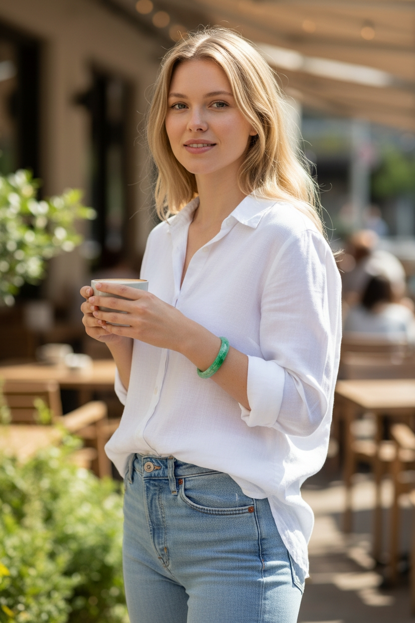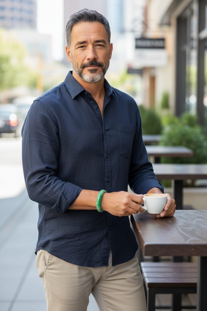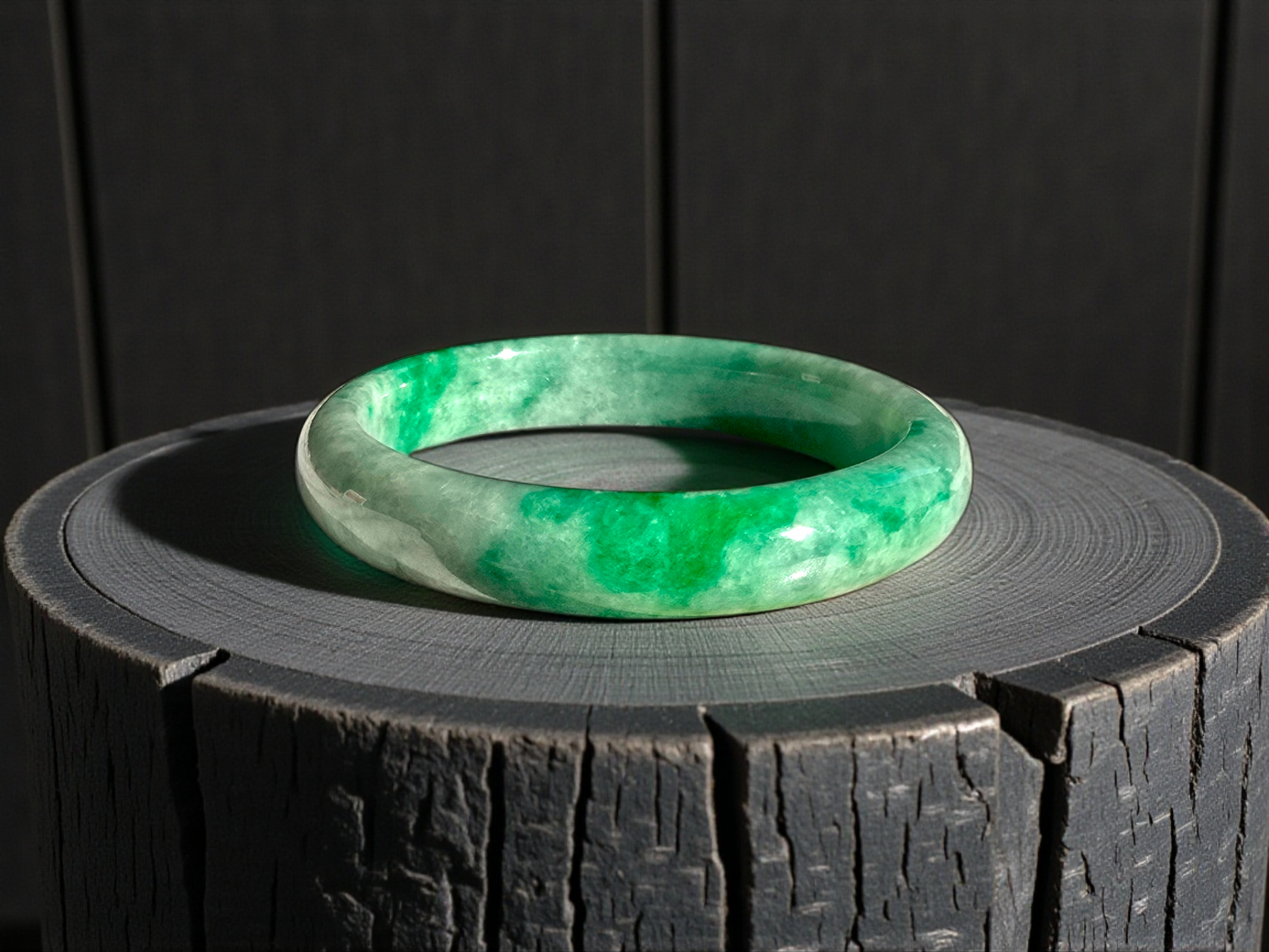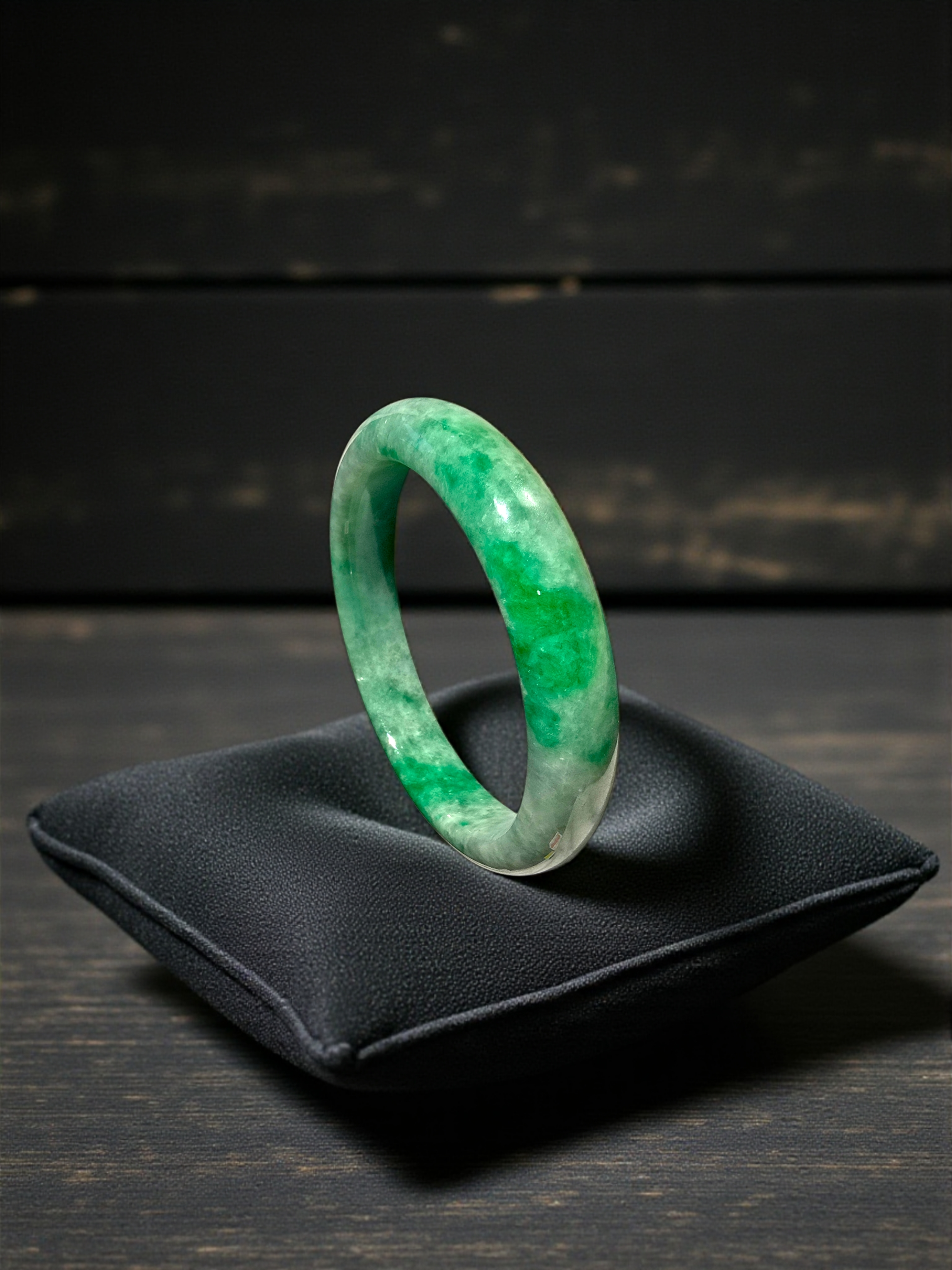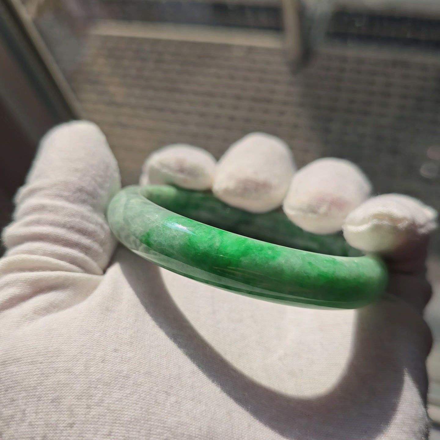 Using the best Handpicked untreated natural A-Jadeite from Burma, we created an authoritative and classy statement bangle bracelet. This unique block of Jadeite has a Green base hue, with marbling, patches and splashes of Imperial Intense Green, Vivid-Vibrant Green, Deep Green, and White. Interlaced with fibrous and patchy interwoven green patterns, the optical effect is stunning. The Fibrous texture and icy translucency in parts, are blended with depth of color and splashes of pattern.