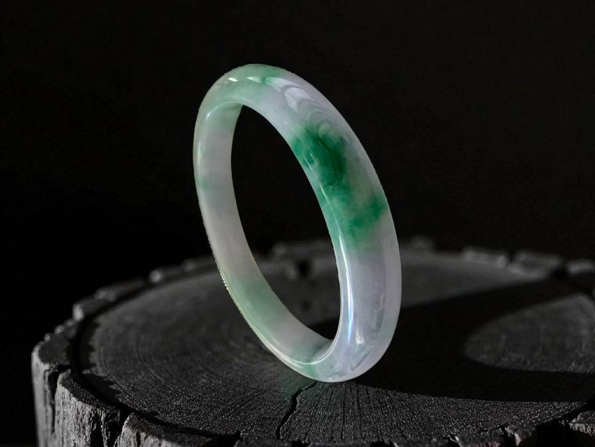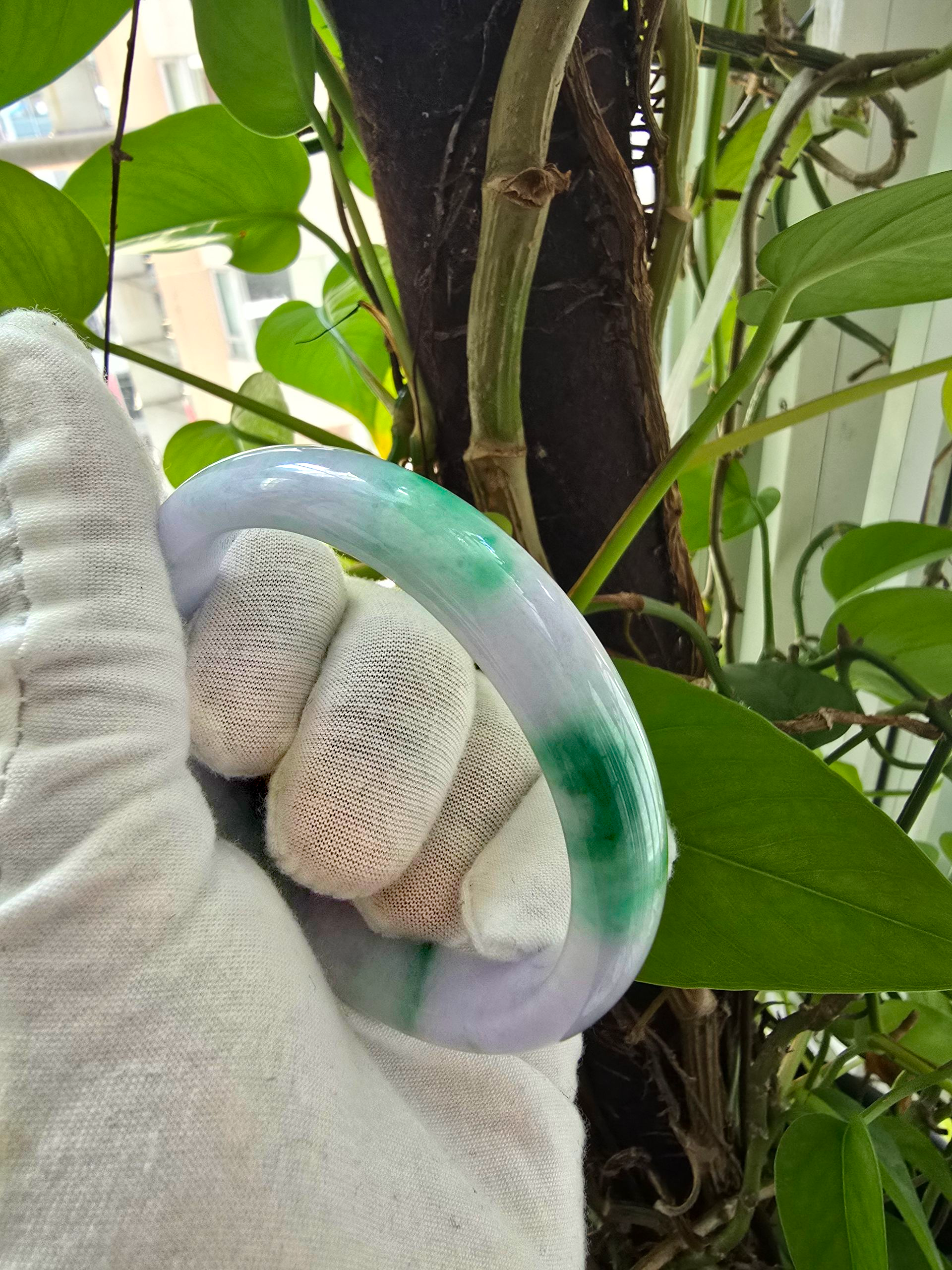 Using the best Handpicked untreated natural A-Jadeite from Burma, we created an authoritative and classy statement bangle bracelet. This unique block of Jadeite has a Green and Lavender base hue, with marbling, patches and splashes of Imperial Intense Green, Vivid-Vibrant Green, Deep Green, Lavender and White. Interlaced with fibrous and patchy interwoven green patterns, the optical effect is stunning. The Fibrous texture and icy translucency in parts, are blended with depth of color and splashes of pattern.