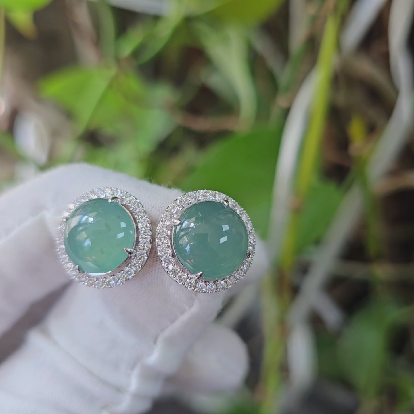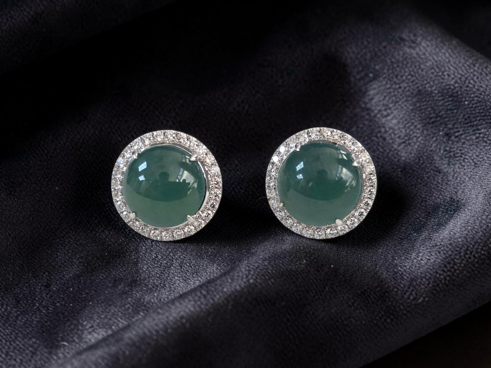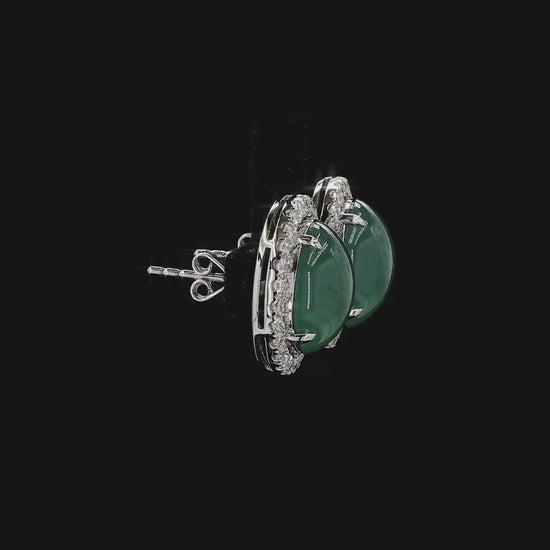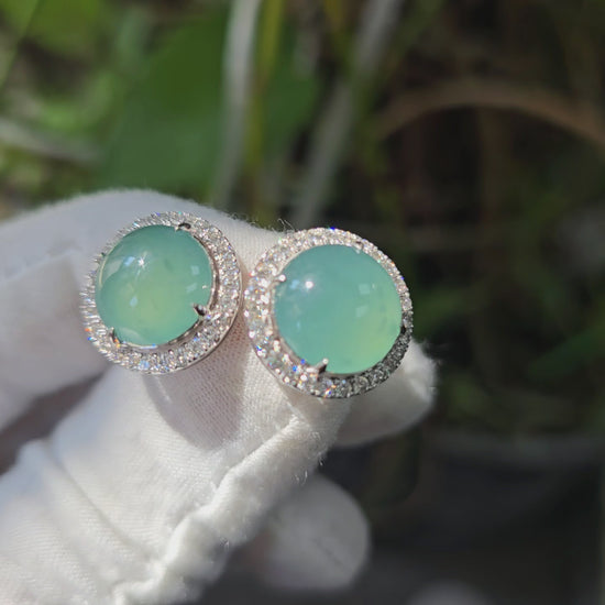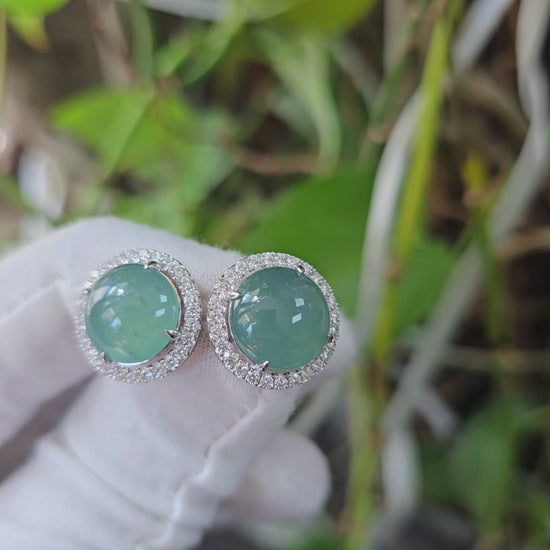 These earrings are made from handpicking the best Blue Green Burmese A-Jadeite Cabochons, with top of the line translucency, hues and optics. 100% Eye-Clean. With solid Bluish-Green Color, we created stud earrings with highly engineered settings and prongs to bring out the optimum vivid blue-green optics. We create stud earrings with calibrated cabochons, a white diamond halo, paired with 18K Solid White Gold.
