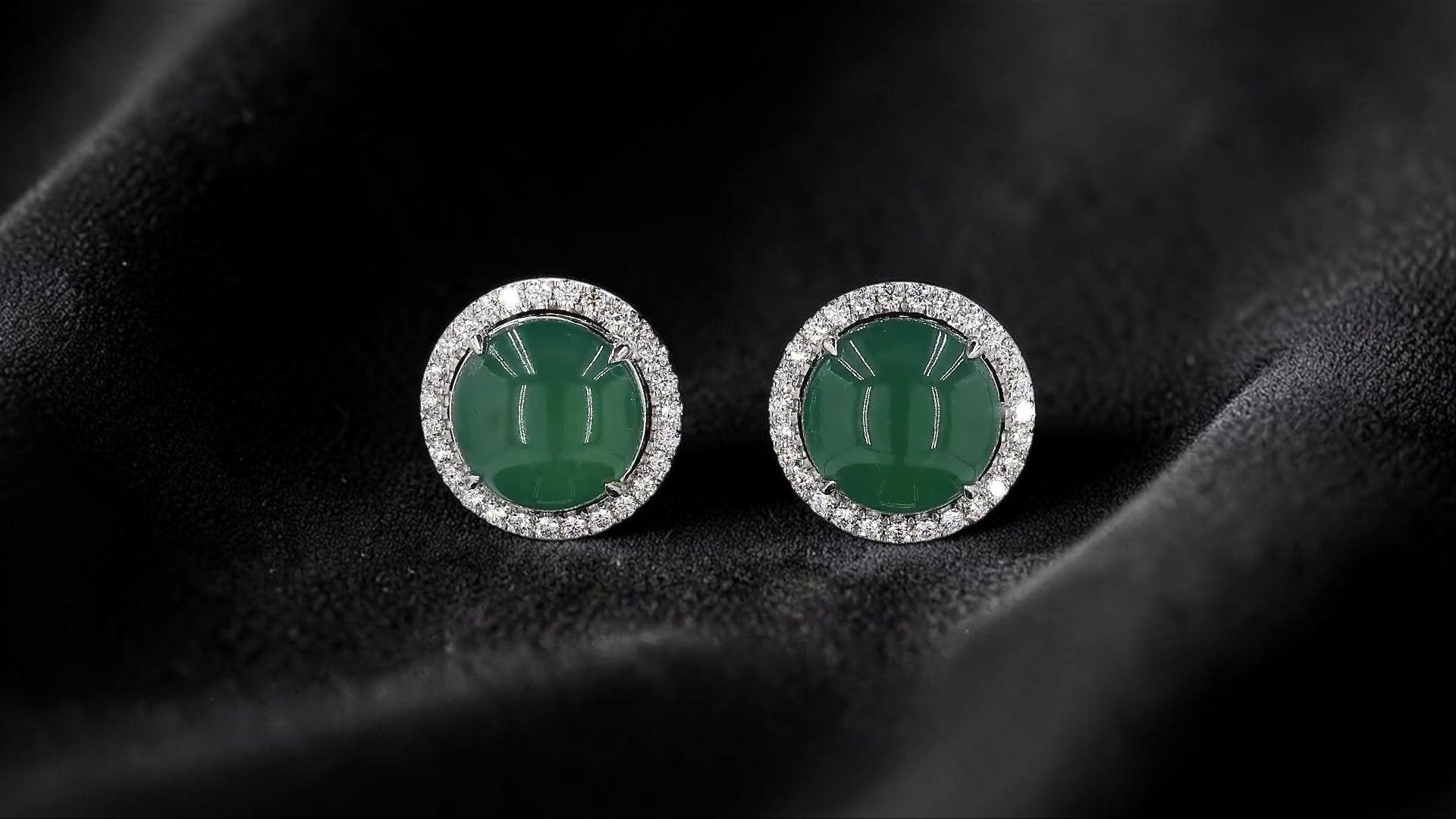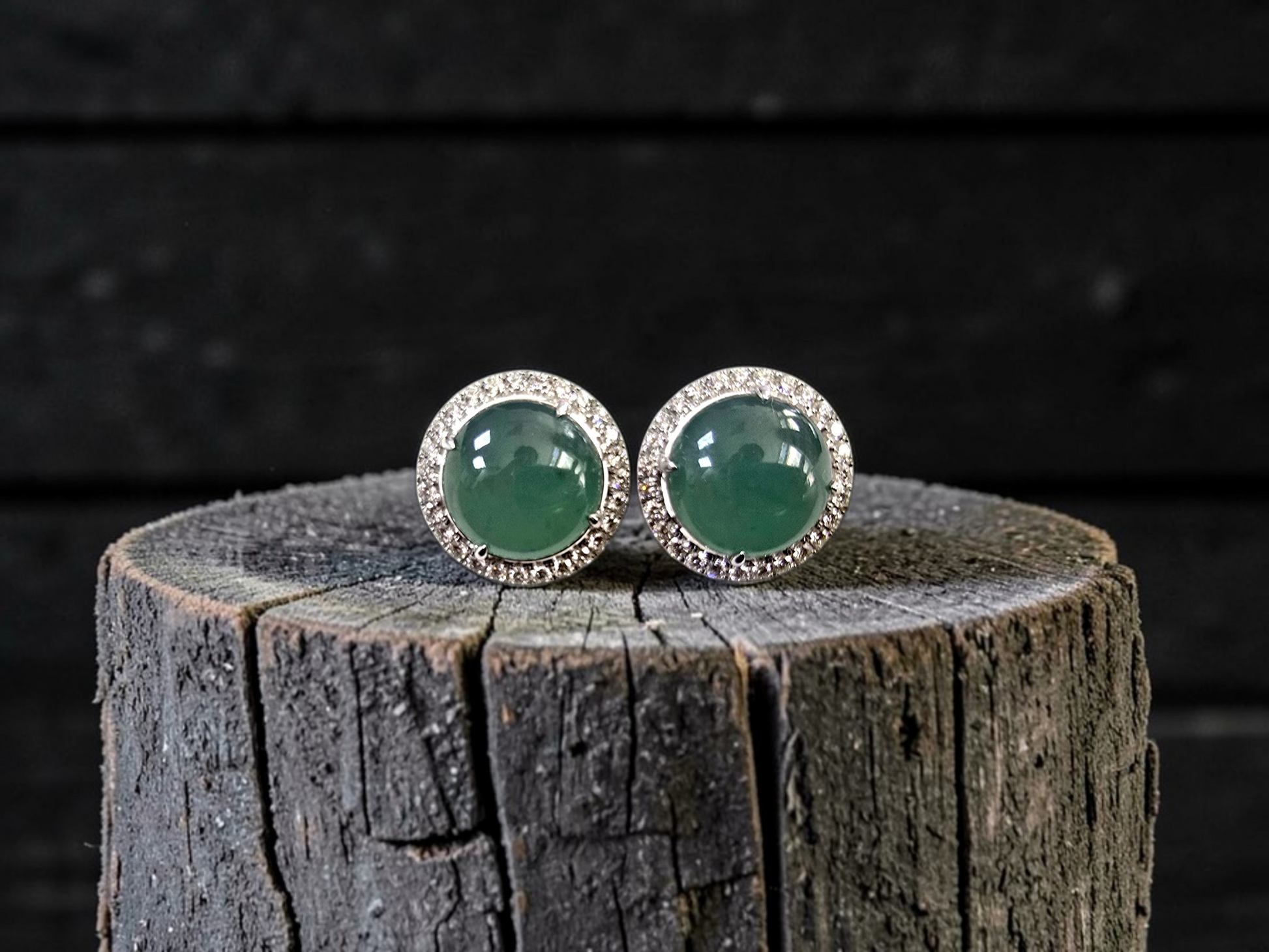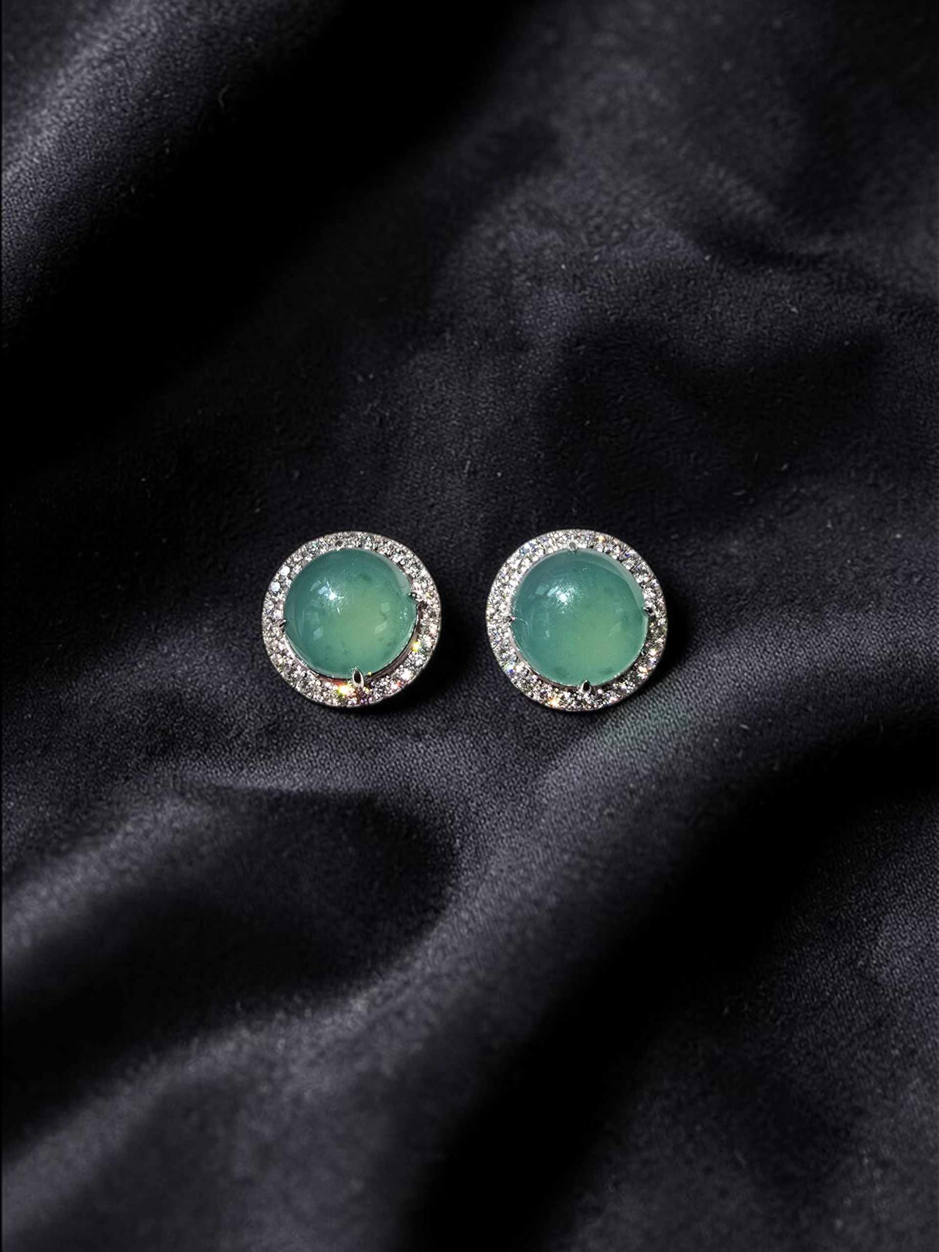 These earrings are made from handpicking the best Blue Green Burmese A-Jadeite Cabochons, with top of the line translucency, hues and optics. 100% Eye-Clean. With solid Bluish-Green Color, we created stud earrings with highly engineered settings and prongs to bring out the optimum vivid blue-green optics. We create stud earrings with calibrated cabochons, a white diamond halo, paired with 18K Solid White Gold.