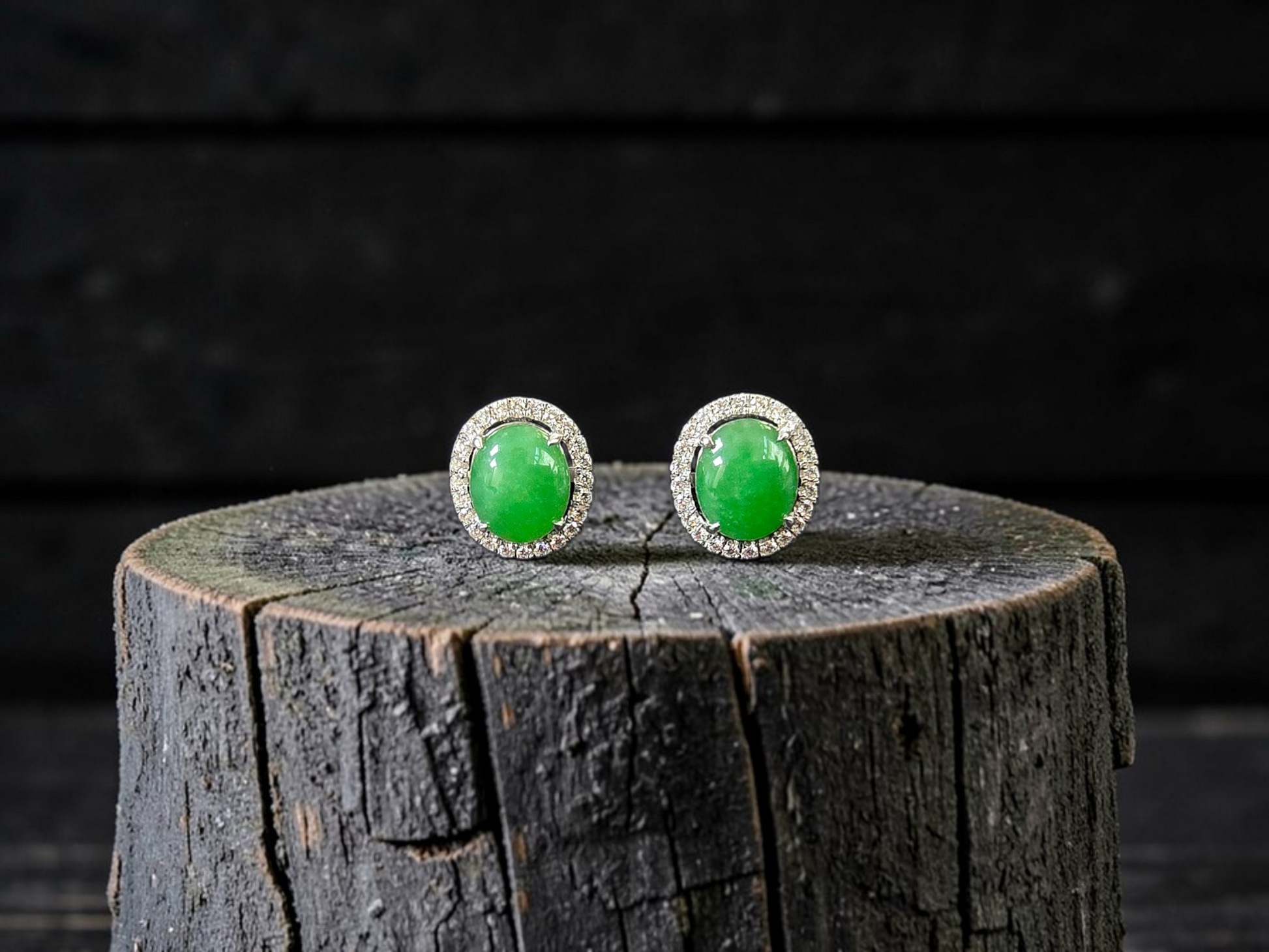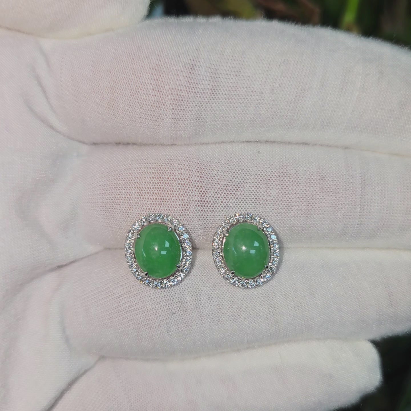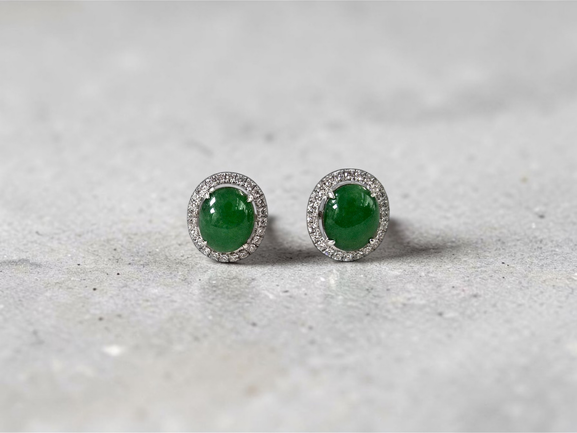 These earrings are made from handpicking the best Apple Green Burmese A-Jadeite Cabochons, with top of the line translucency, hues and optics. 100% Eye-Clean. With solid Green Color, streaks, veins and patches of Imperial green, Vivid green, and deep green; we created stud earrings with highly engineered settings and prongs to bring out the optimum vivid green optics. We create stud earrings with calibrated cabochons, a white diamond halo, paired with 18K Solid White Gold.