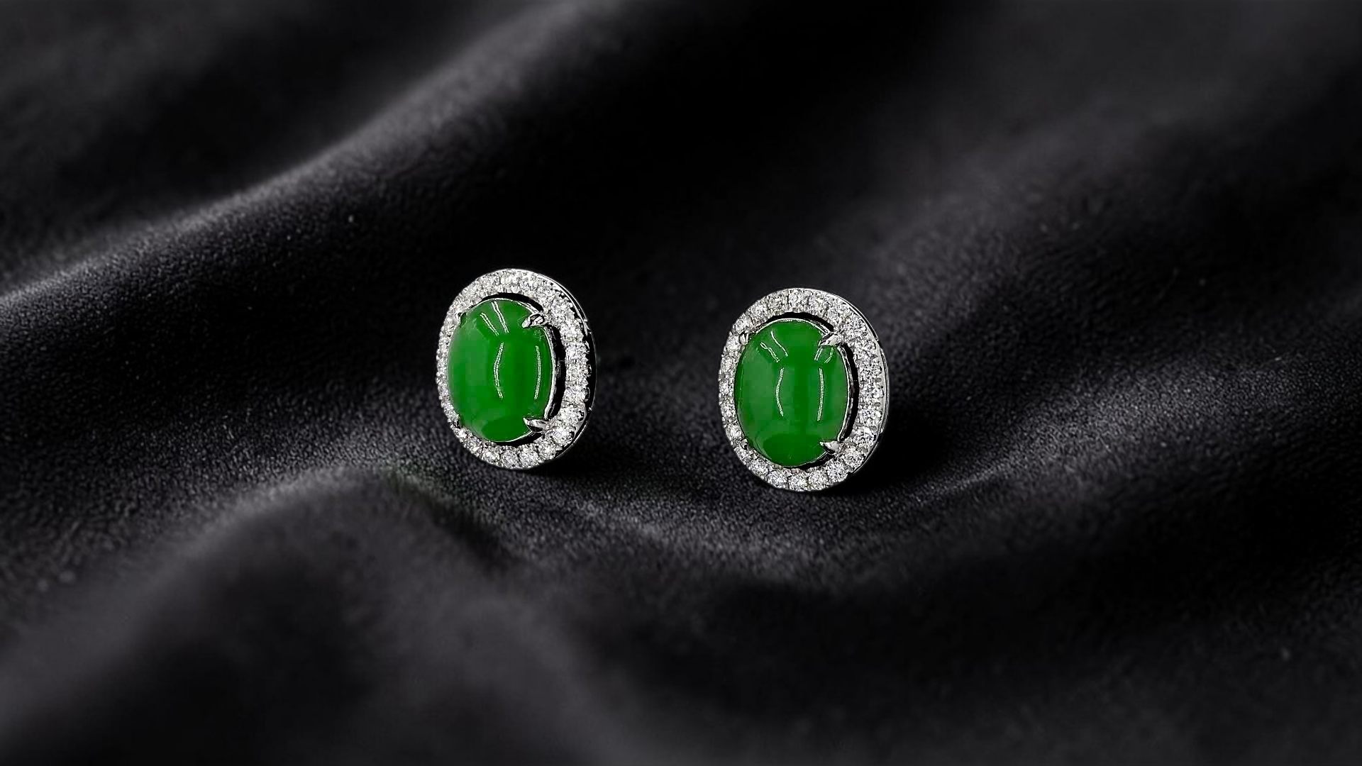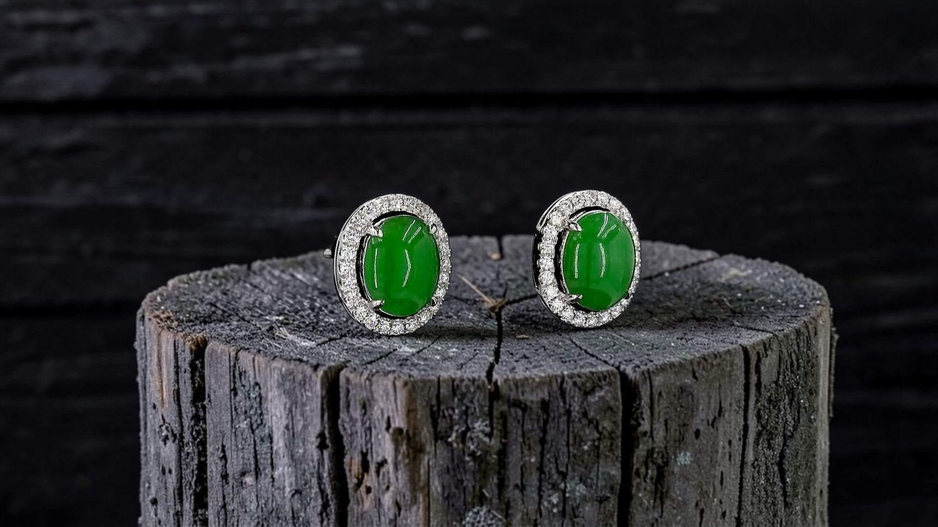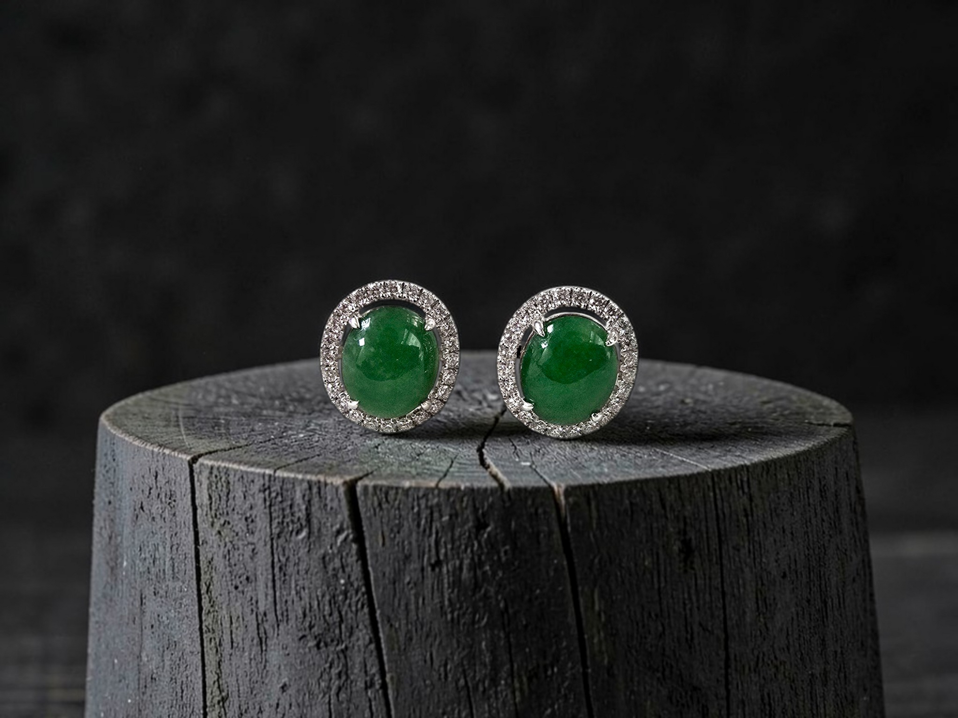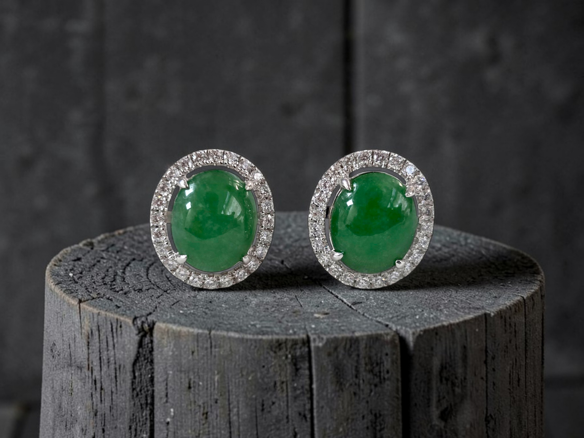 These earrings are made from handpicking the best Apple Green Burmese A-Jadeite Cabochons, with top of the line translucency, hues and optics. 100% Eye-Clean. With solid Green Color, streaks, veins and patches of Imperial green, Vivid green, and deep green; we created stud earrings with highly engineered settings and prongs to bring out the optimum vivid green optics. We create stud earrings with calibrated cabochons, a white diamond halo, paired with 18K Solid White Gold.