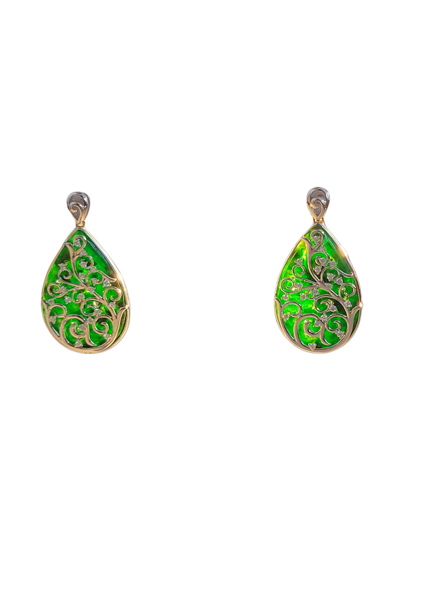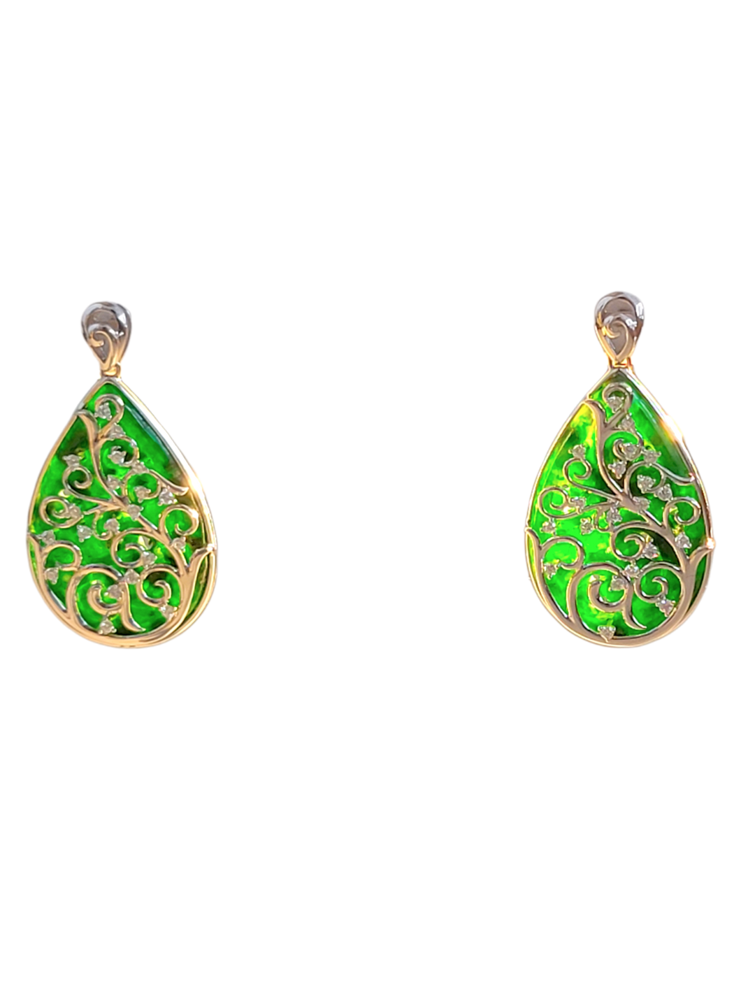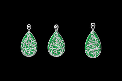 These Earrings were designed by our founder, and hand carved by our expert artisans in our Hong Kong workshop. We use 18K White Gold and top quality Diamonds to bring out the best in the Jade carvings. The luster and sparkle of diamonds, the richness of the white gold, interplayed with the patterns of Green Burmese Jadeite bring out the best visual optics and light.