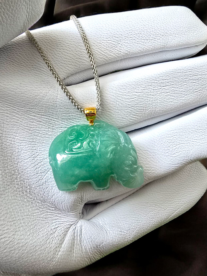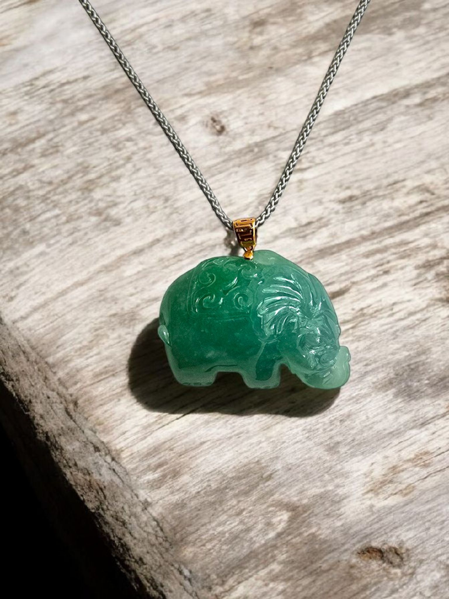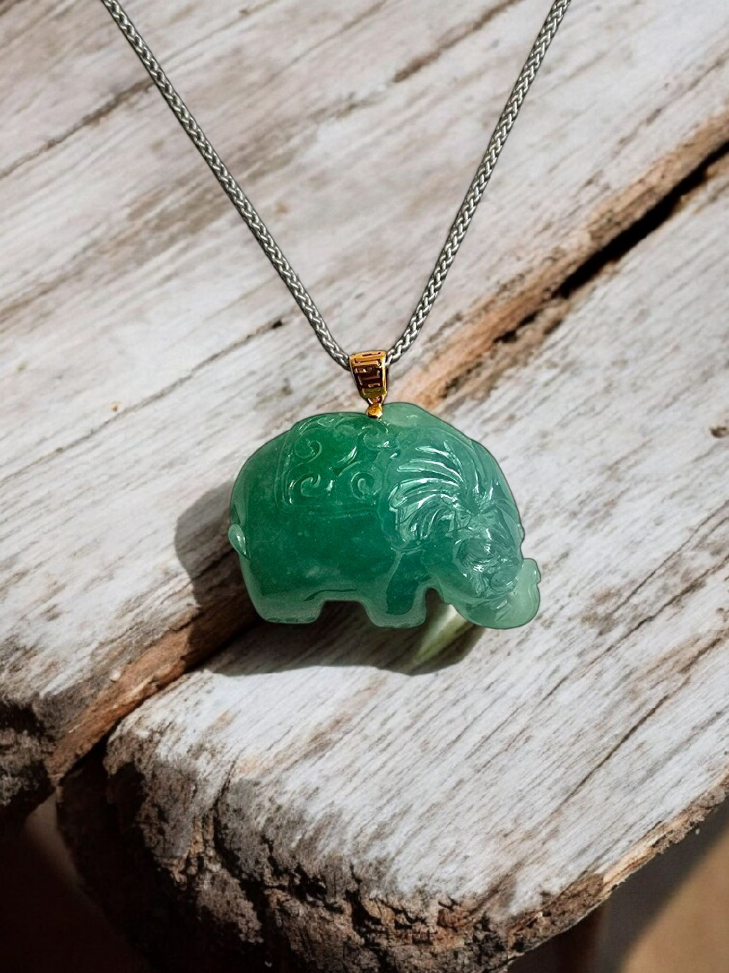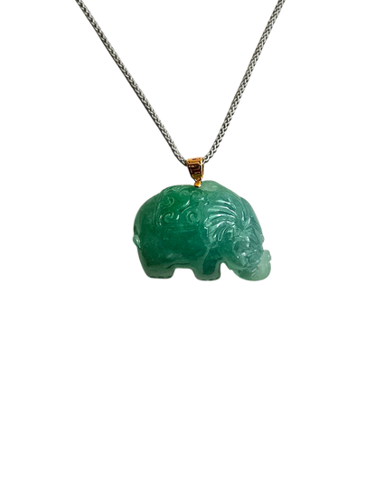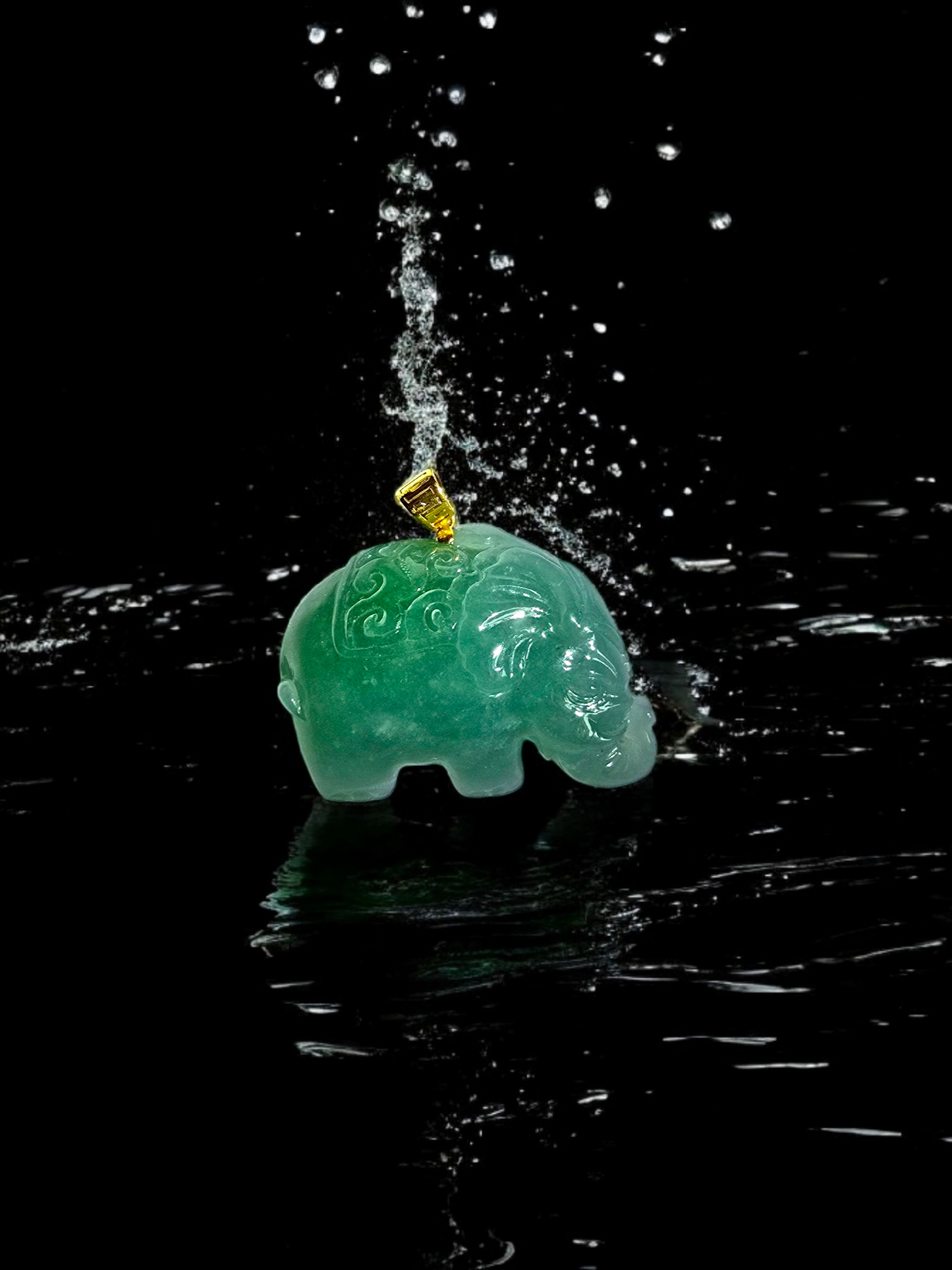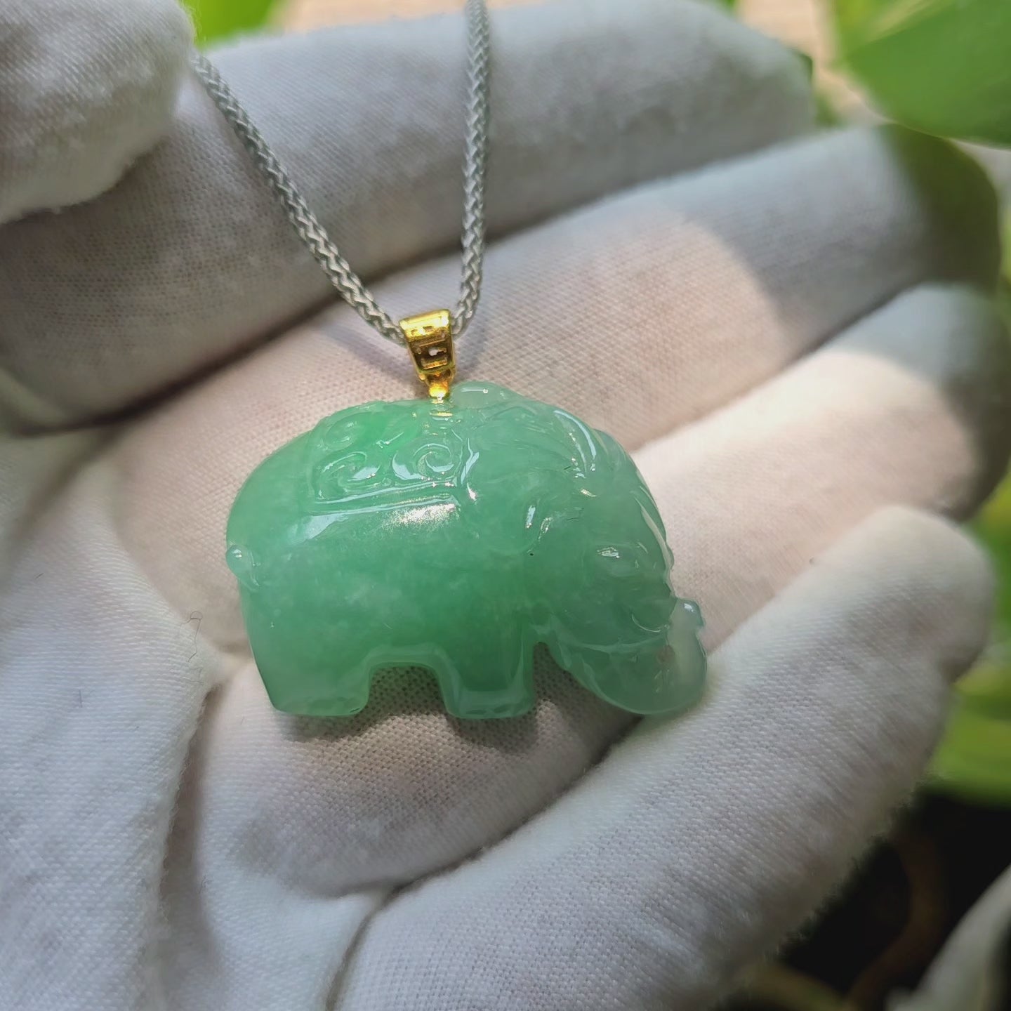 Hanako the Elephant Burmese Green A-Jadeite Jade Pendant with solid 18K Yellow Gold - Certified