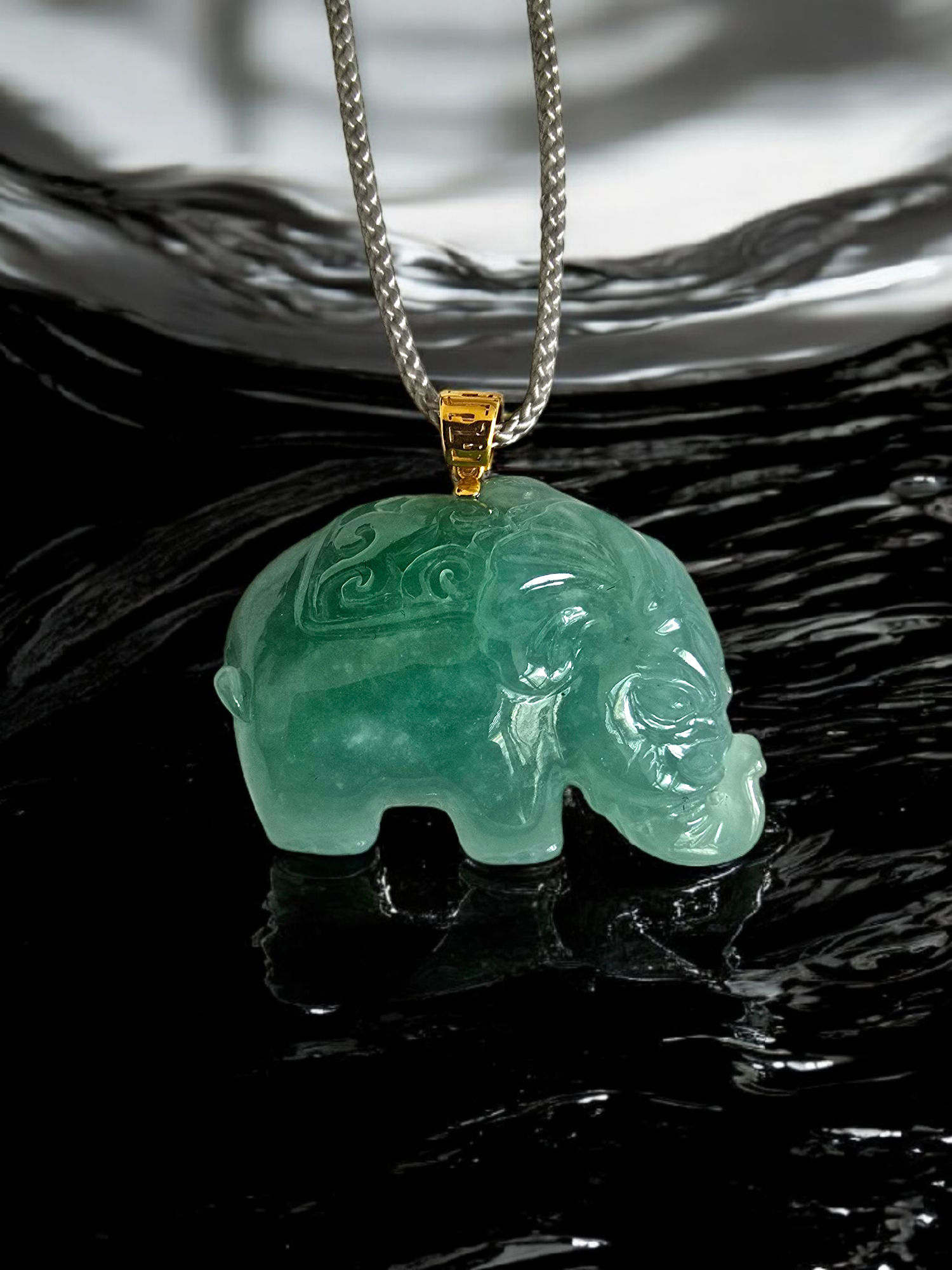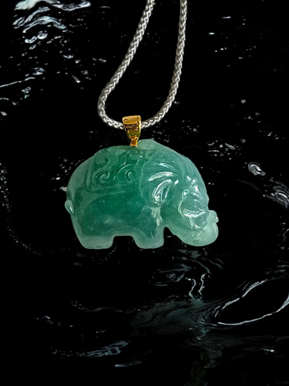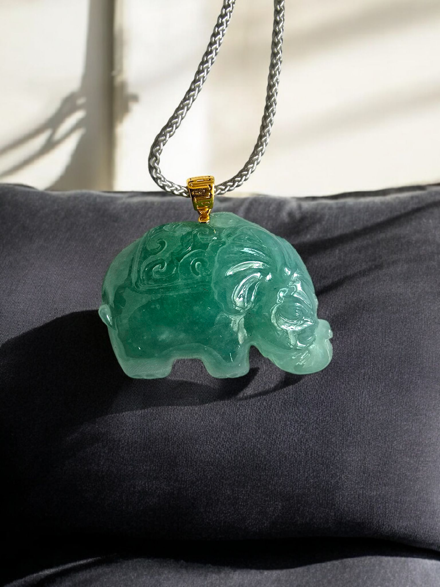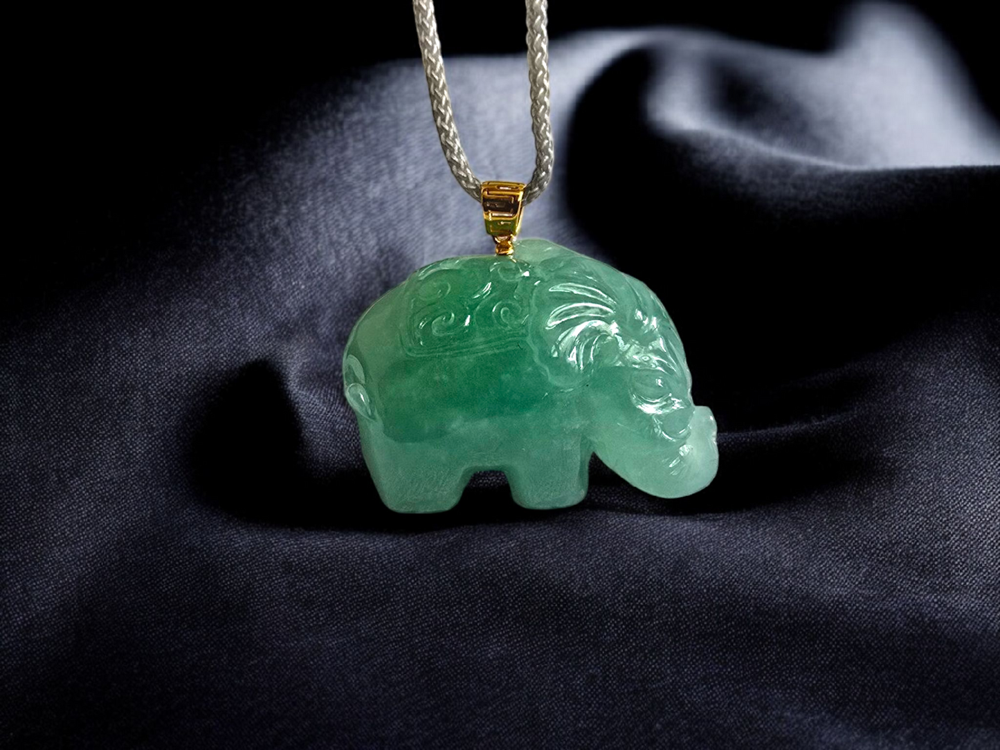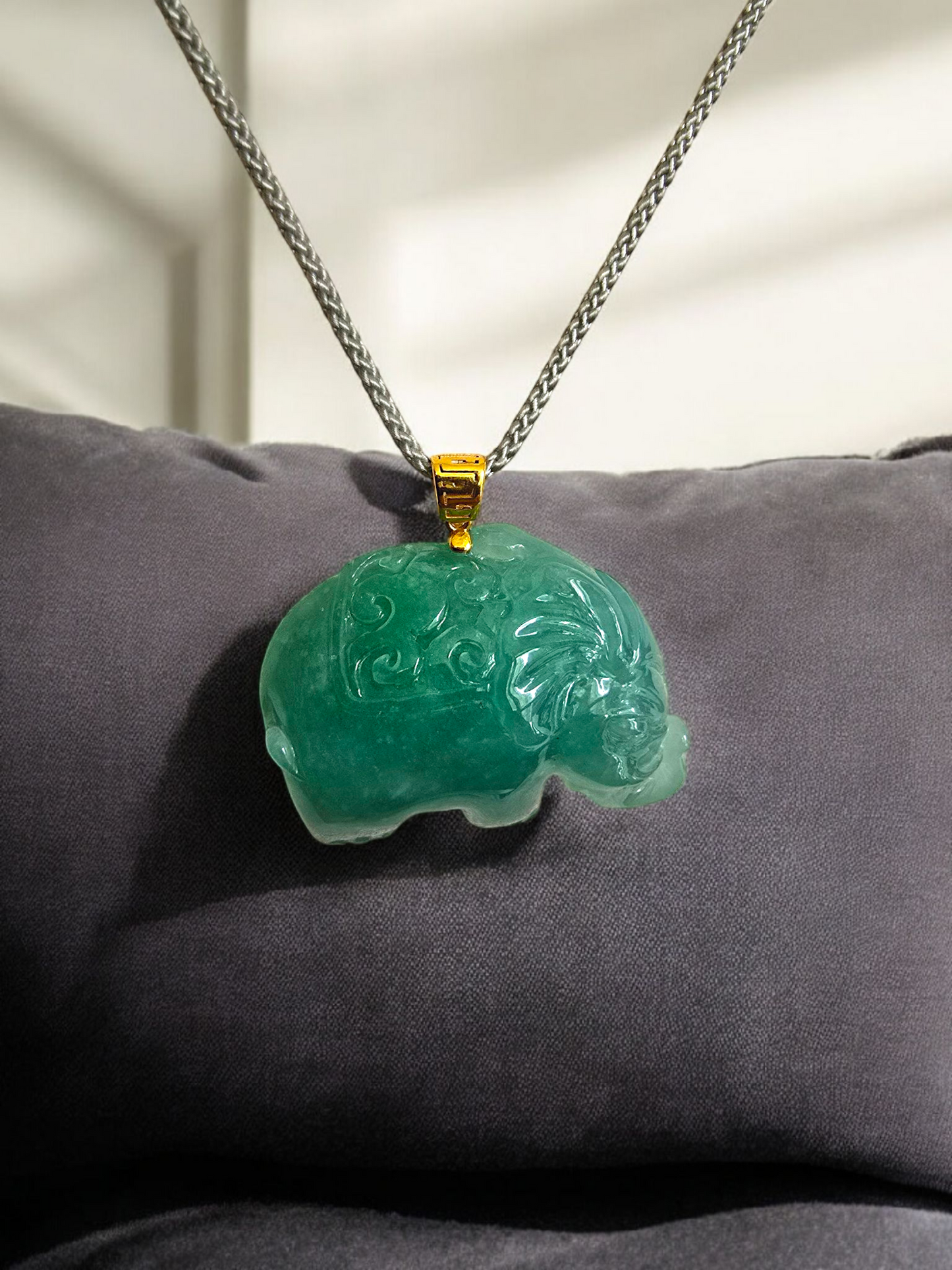 Hanako the Elephant Green Burmese A-Jade Pendant with 18K Yellow Gold - Certified