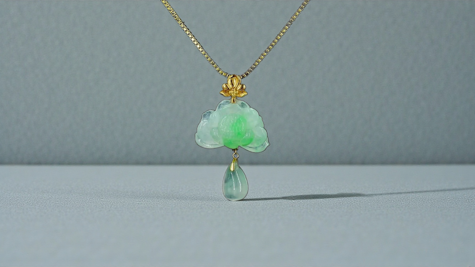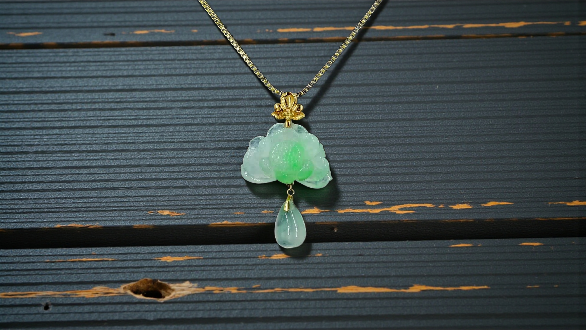 This pendant is made from handpicking the rarest Burmese A-Jadeite, with the best translucency, hues, tones and saturation of green. This icy pendant has Light Icy Green and White Base hues, with Imperial Green, Vivid green, and Intense Green patches with veins. This creates a stunning carved dangling pendant. This pendant exhibits excellent translucency with a smooth icy and watery texture. We add a flower-shaped 18K Yellow Gold Clasp. This pendant is the pinnacle of design and craftsmanship.