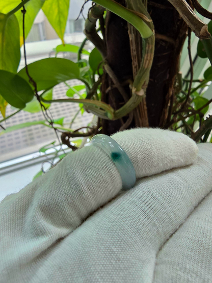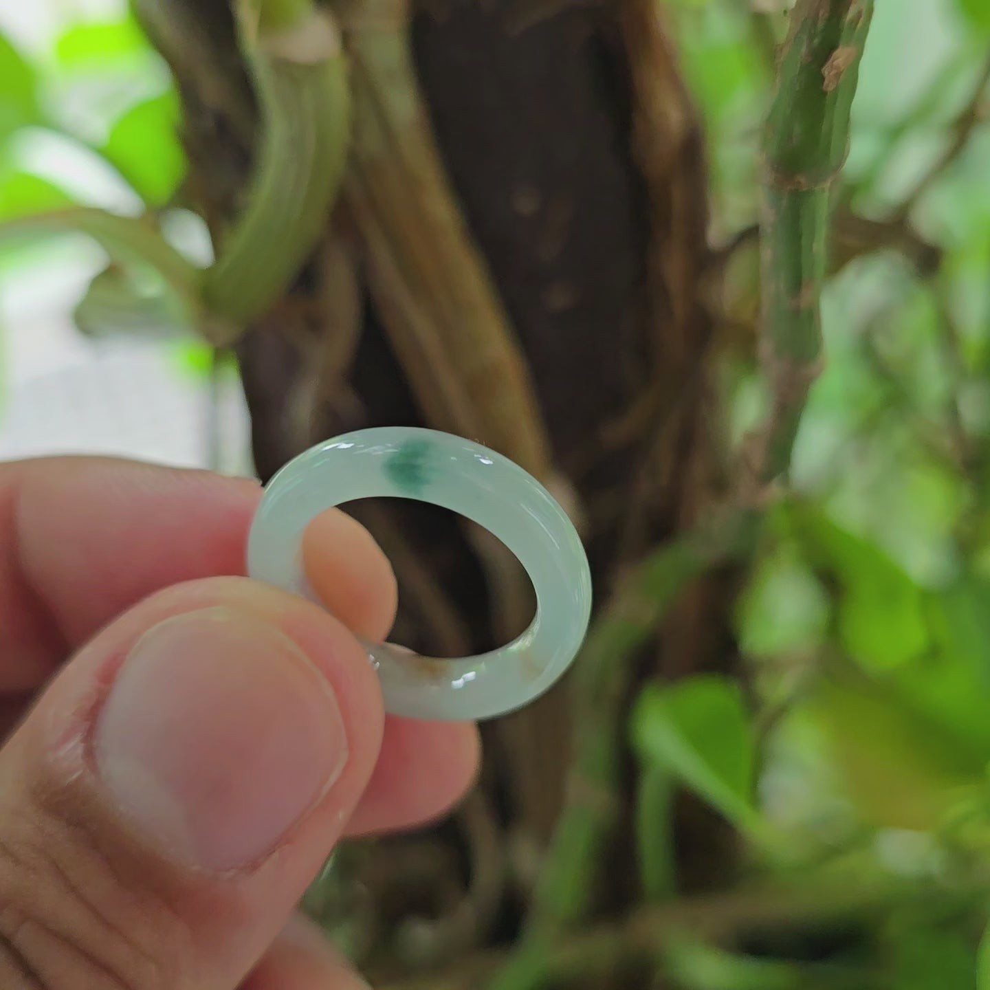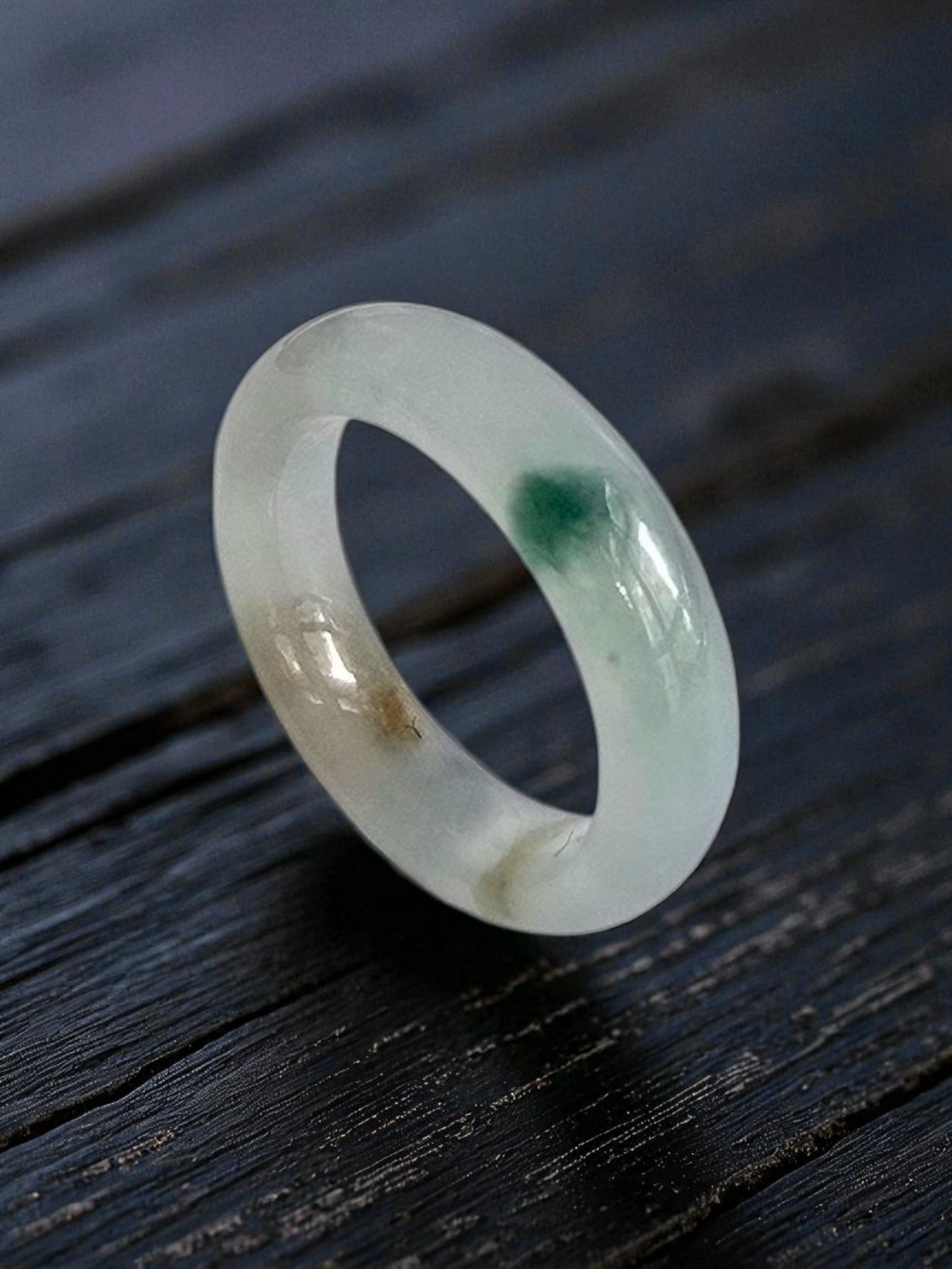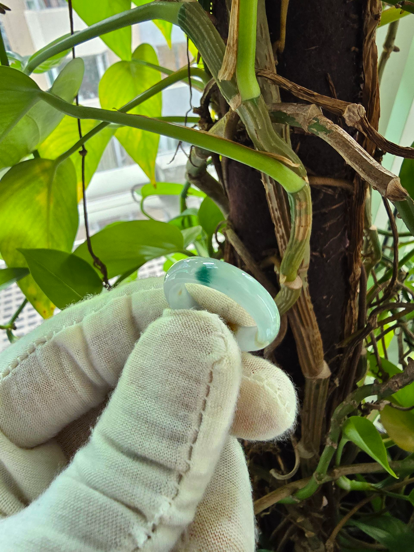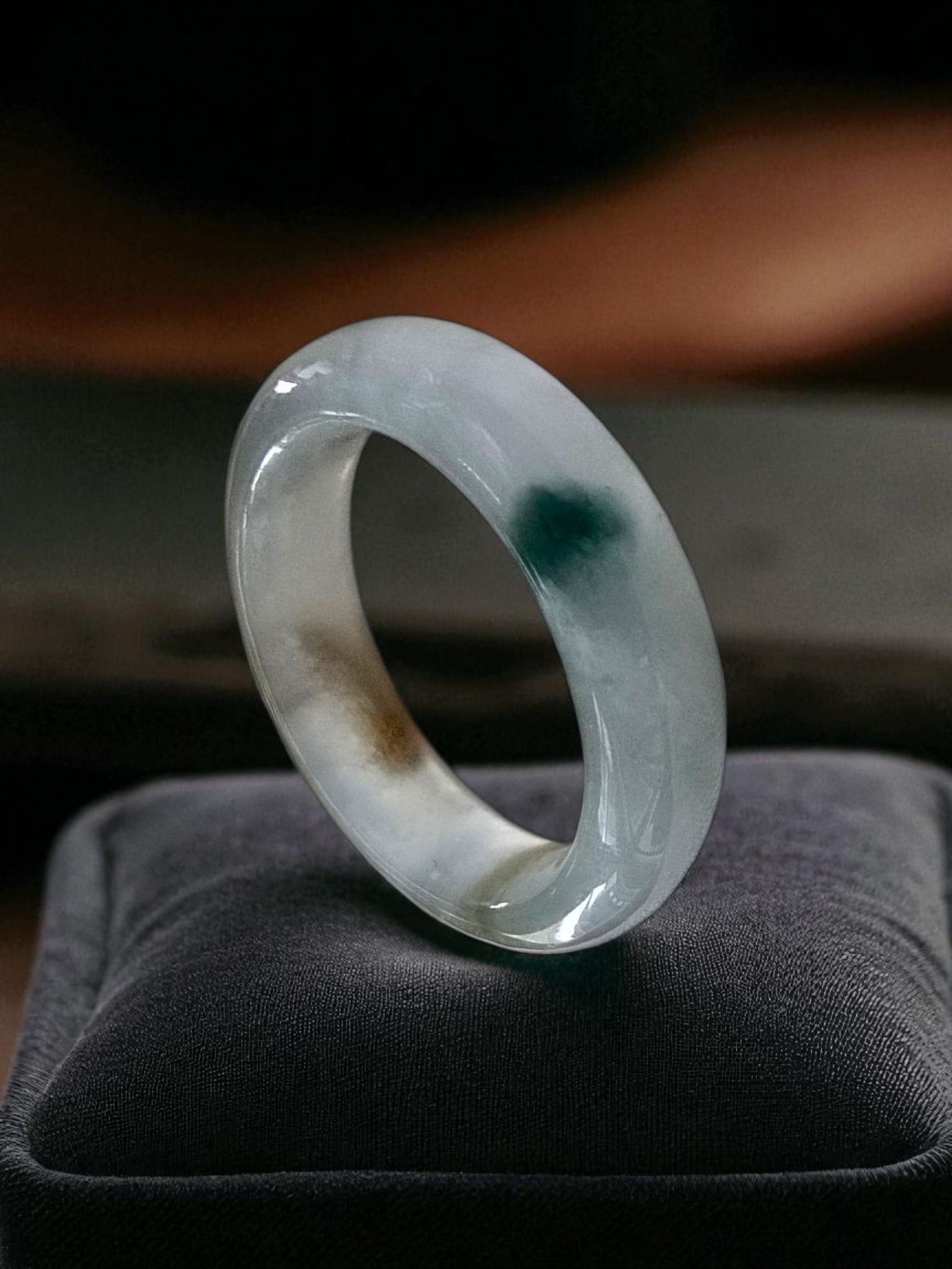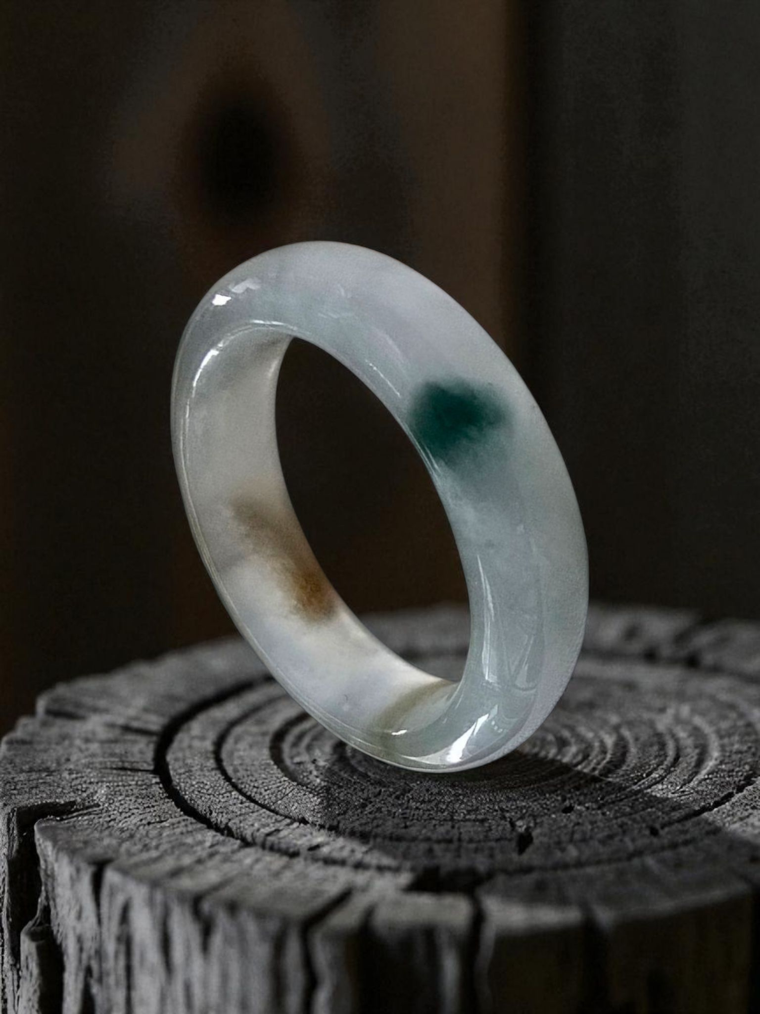Each ring is unique and exclusively One-of One. With fibrous interwoven hues, this icy jadeite ring has a White-Green tone with splashes and streaks of Deep Green, Brown and Yellow. Perfect luster and light, excellent translucency and no cracks or blemishes on the ring.