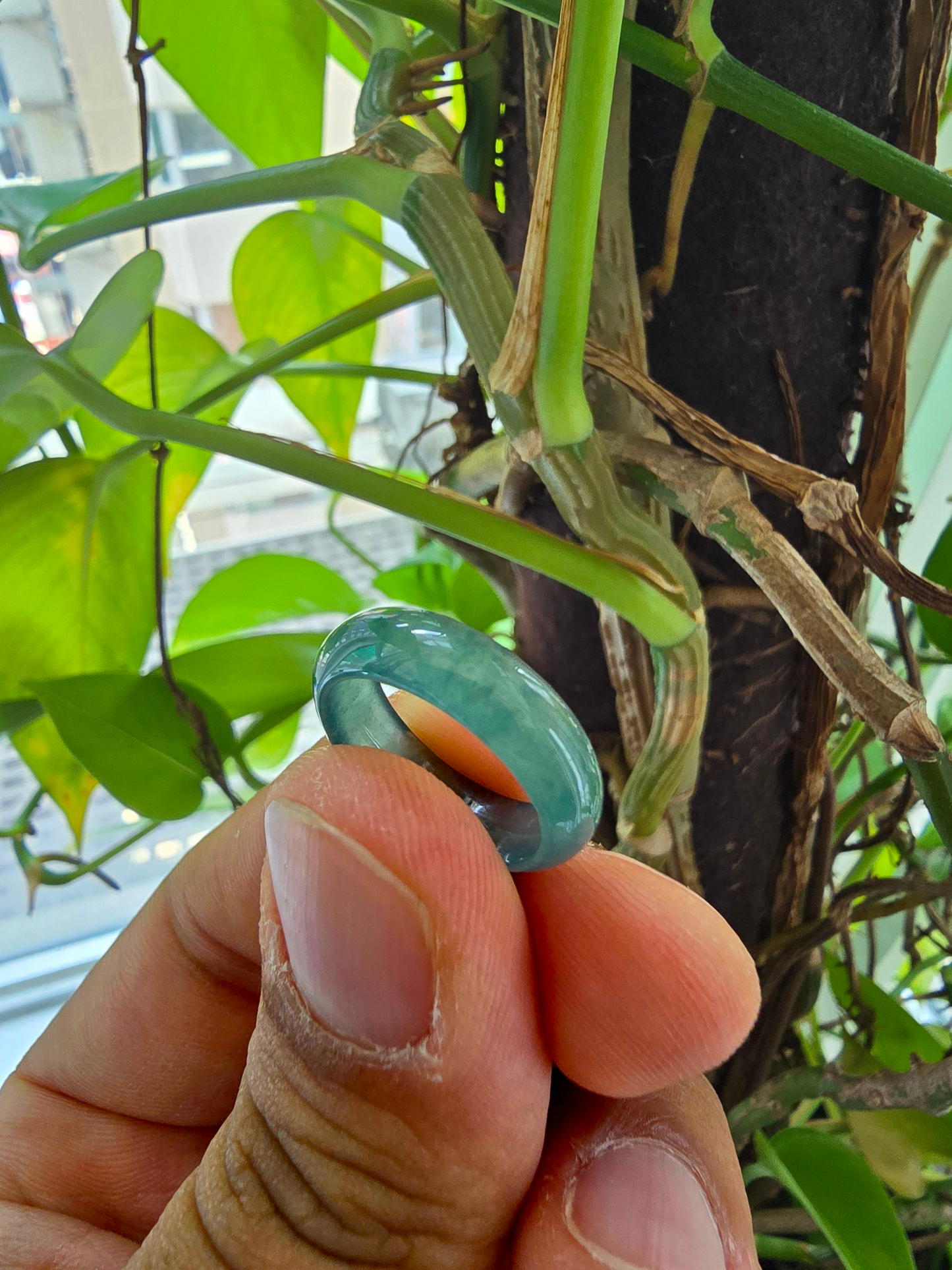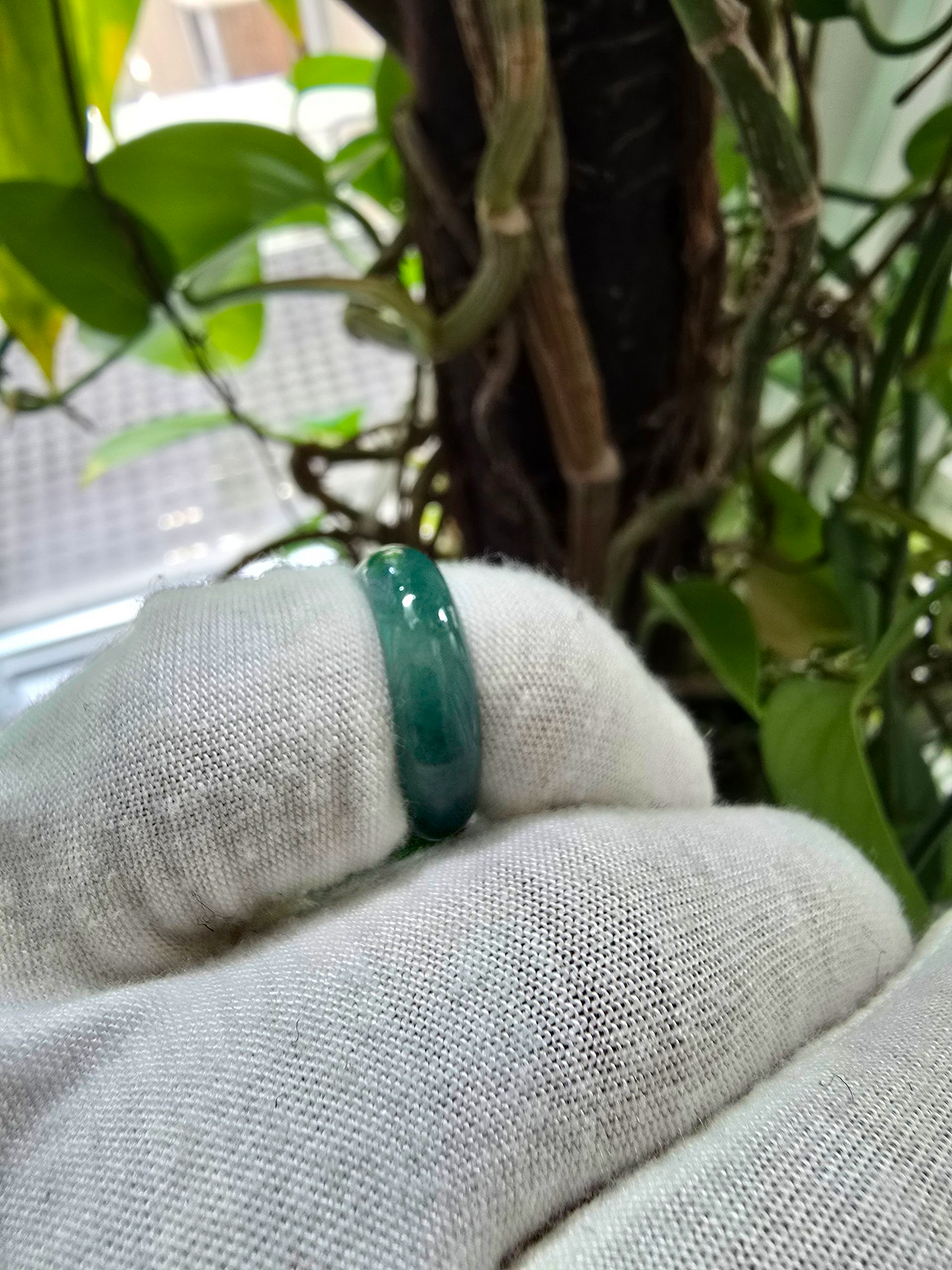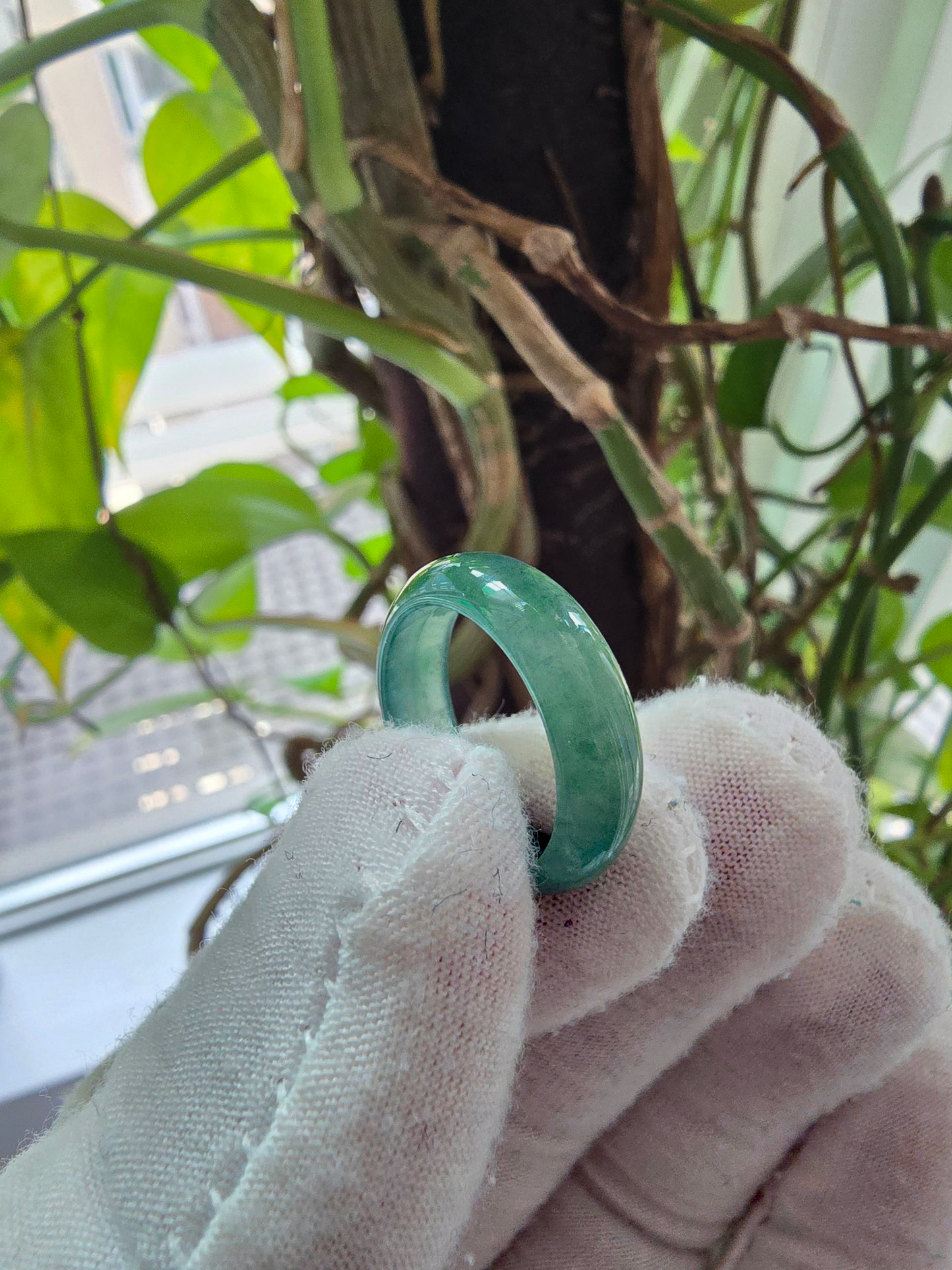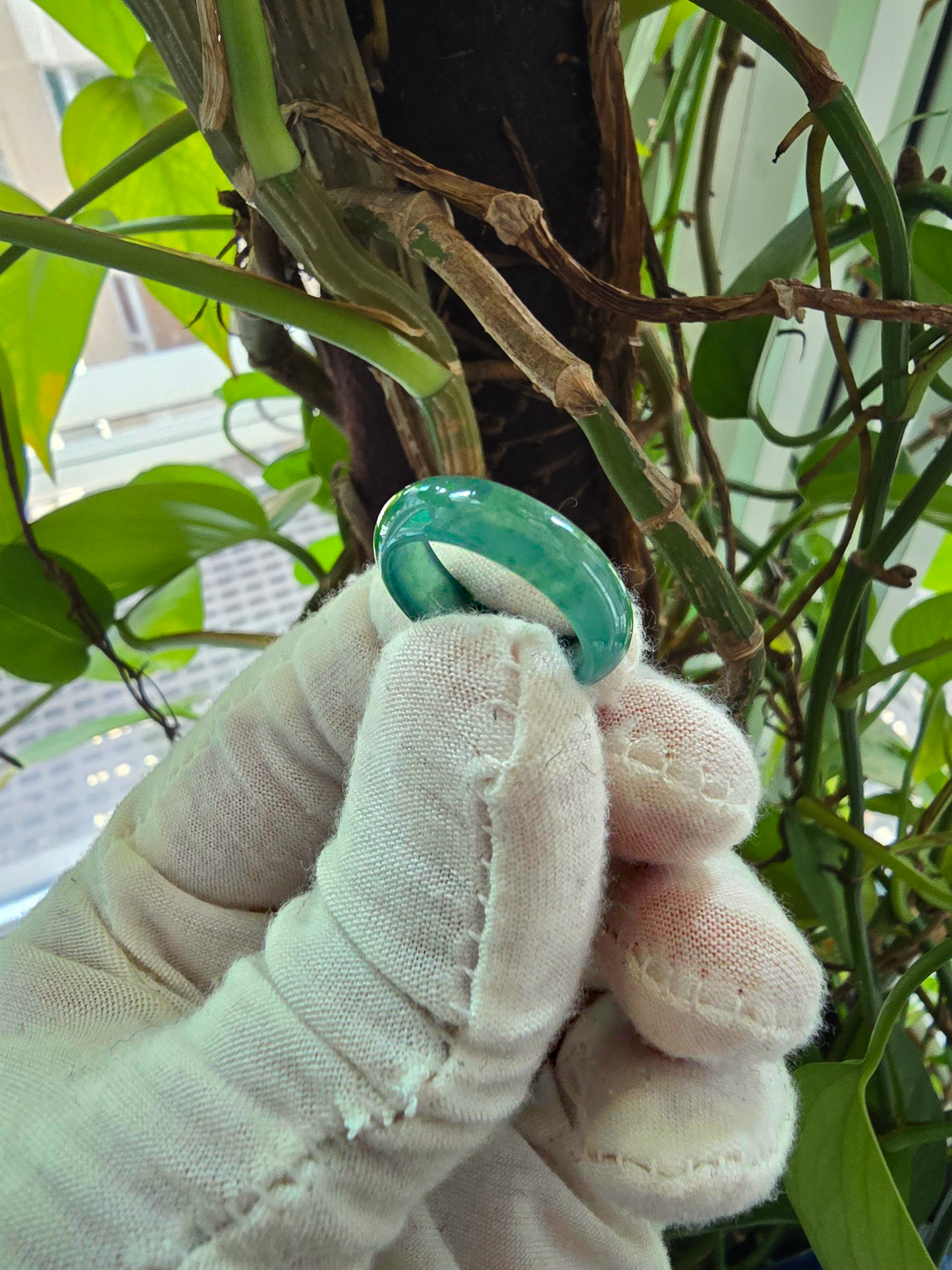 Each ring is unique and exclusively One-of One. With fibrous interwoven hues, this icy jadeite ring has a deep Blue-Green tone with splashes and streaks of Intense Blue-Green. Perfect luster and light, excellent translucency and no cracks or blemishes on the ring.