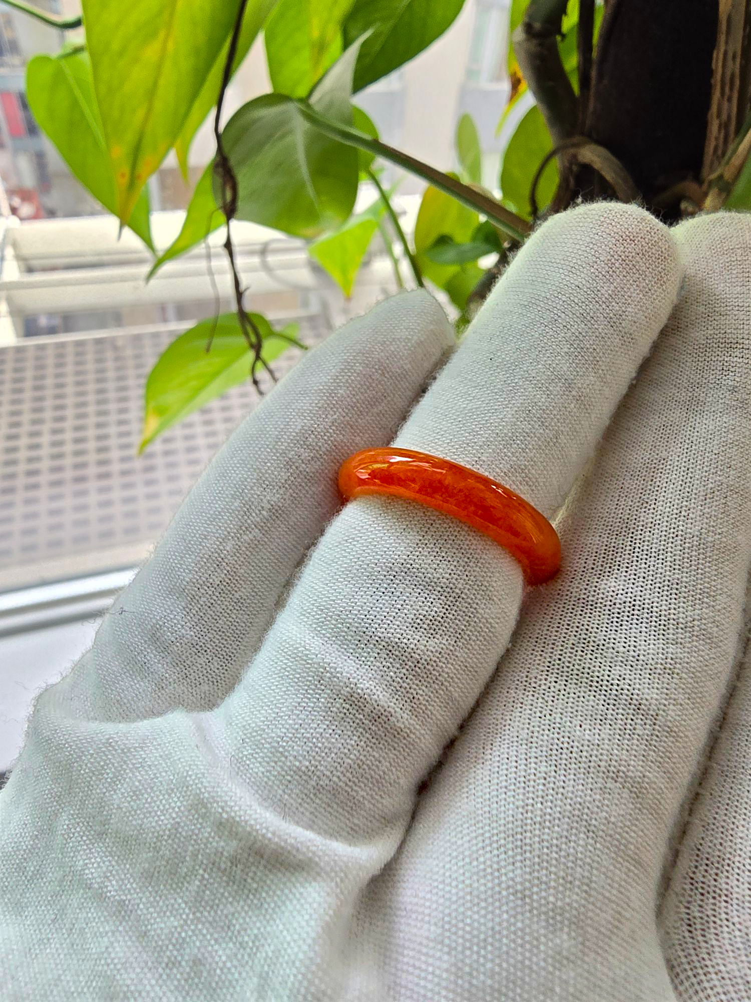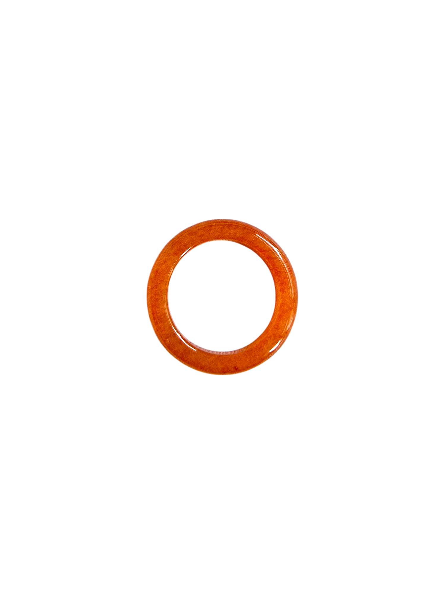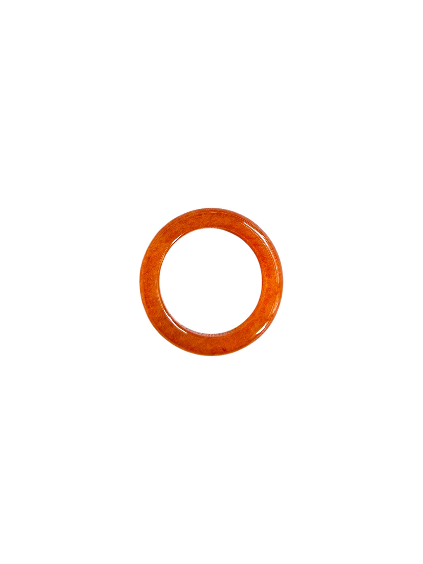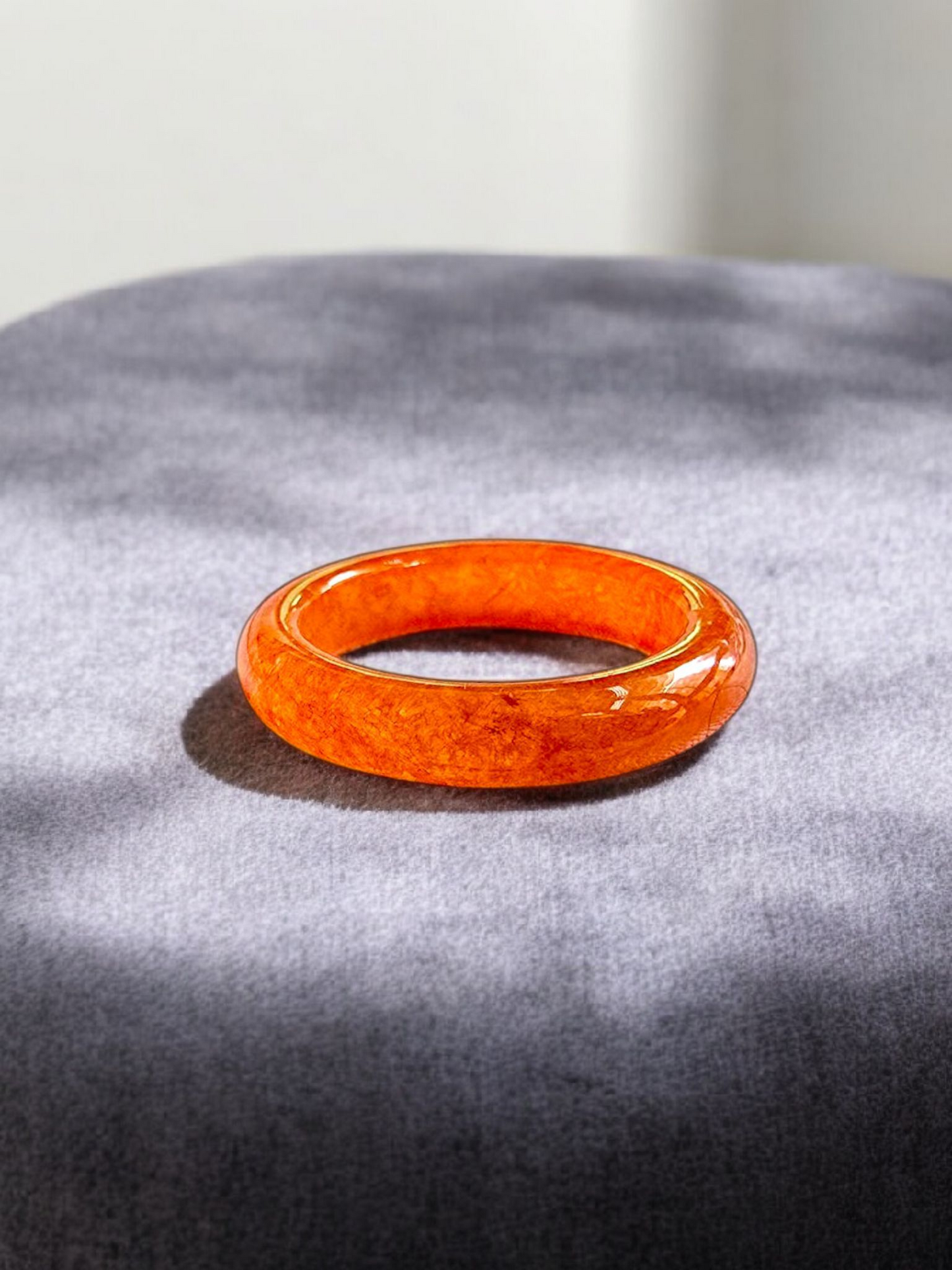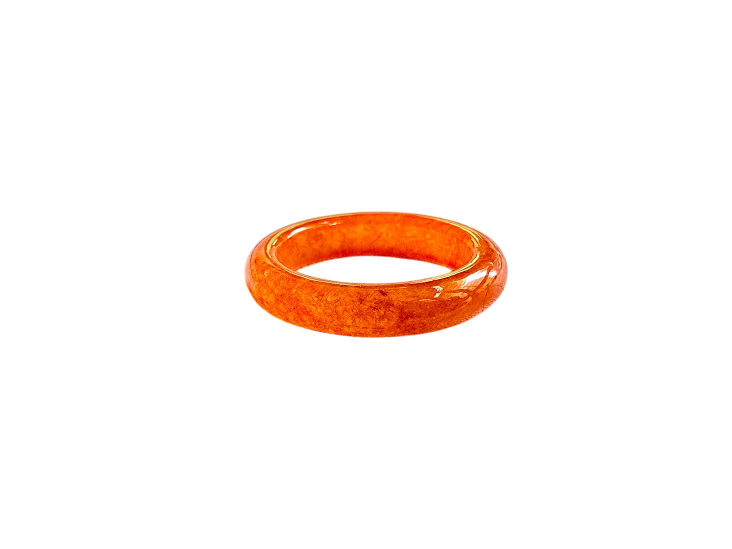 Each ring is unique and exclusively One-of One. With fibrous interwoven hues, this jadeite ring has a deep Orangey-Red tone with splashes and streaks of Intense Red Jadeite. Perfect luster and light, excellent translucency and no cracks or blemishes on the ring.