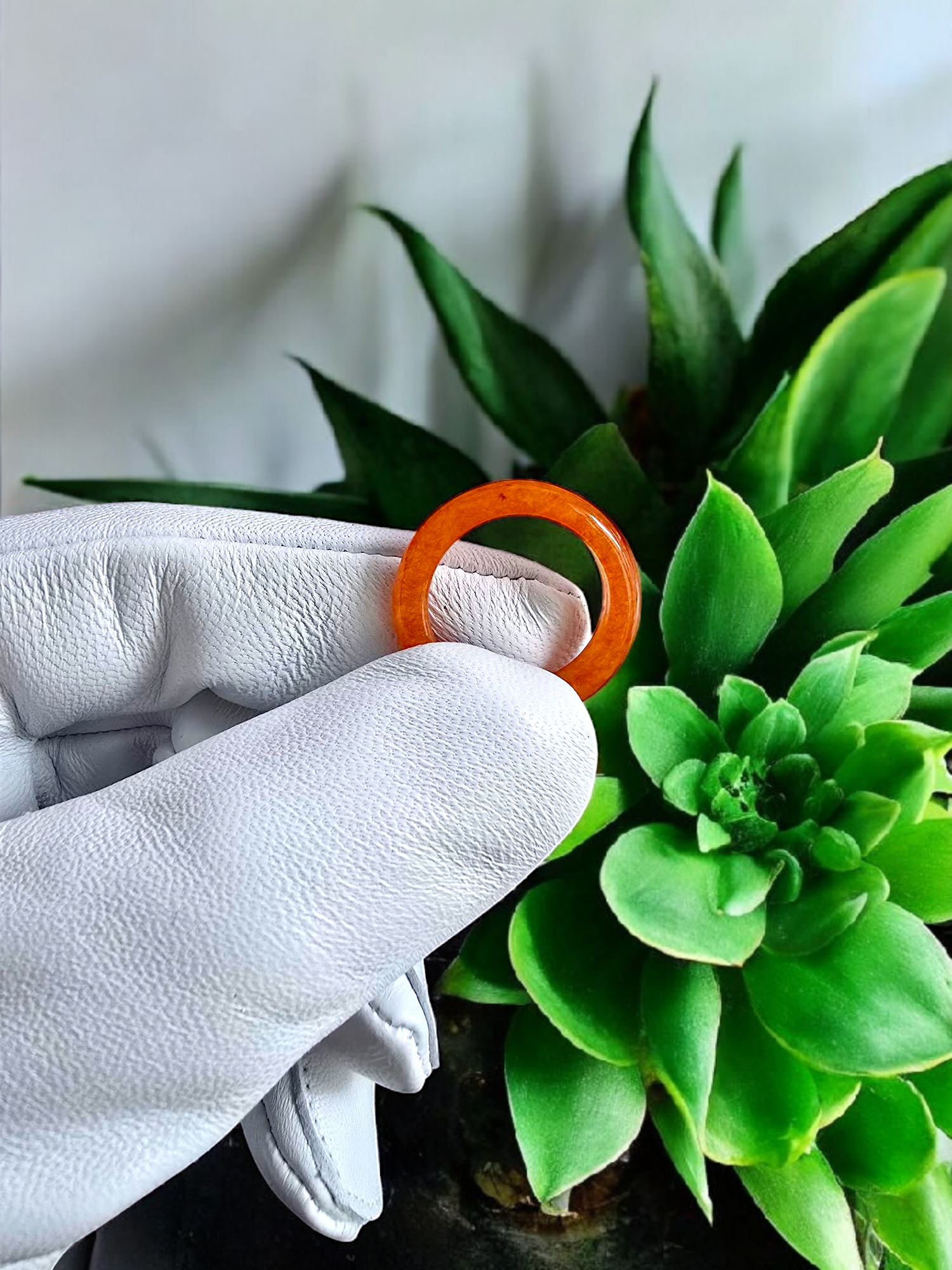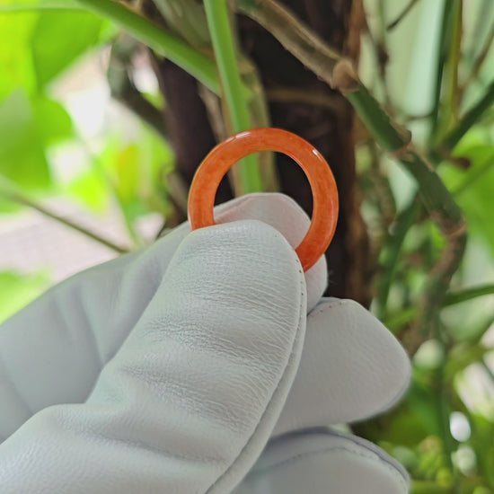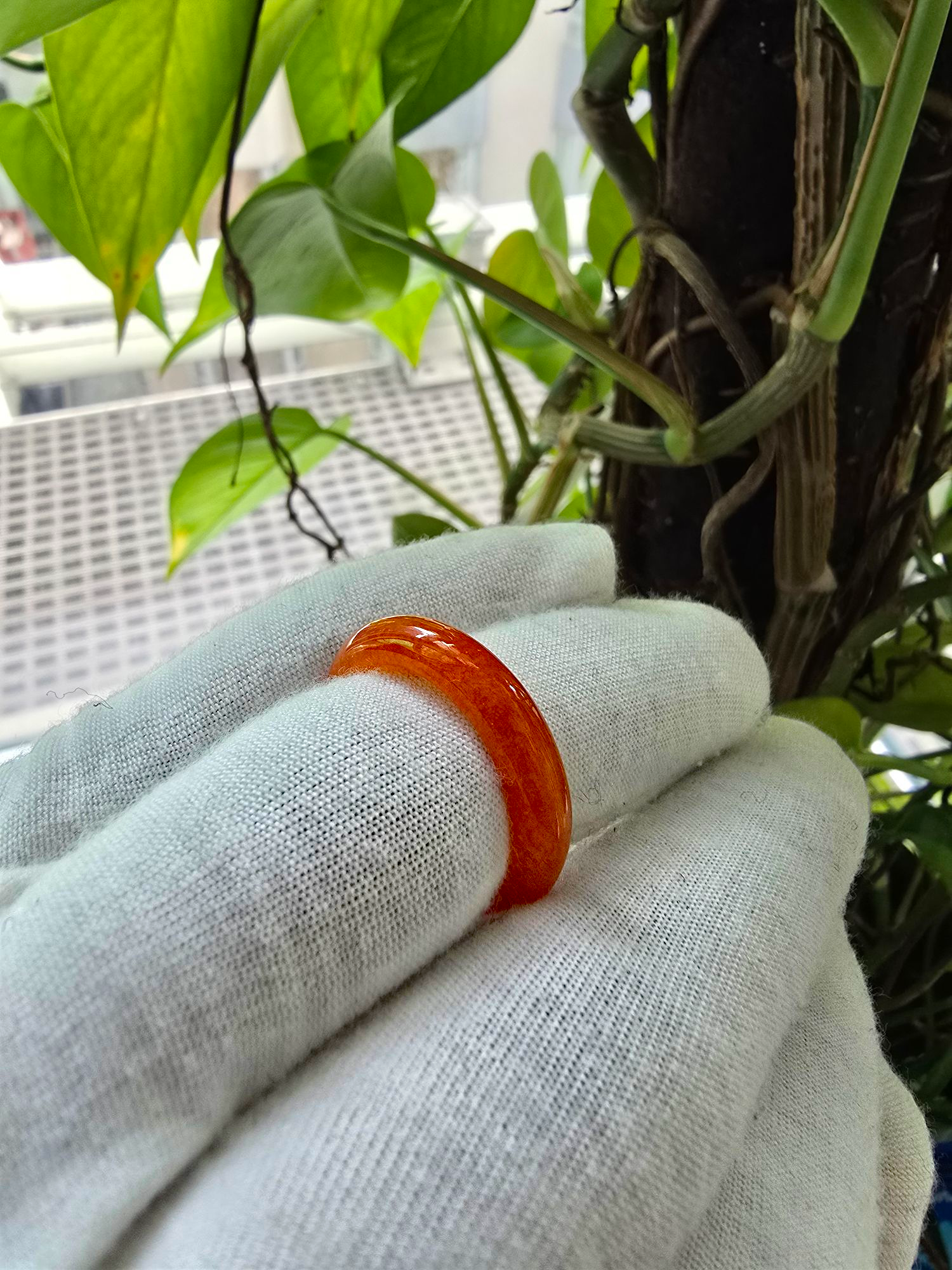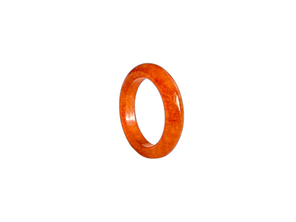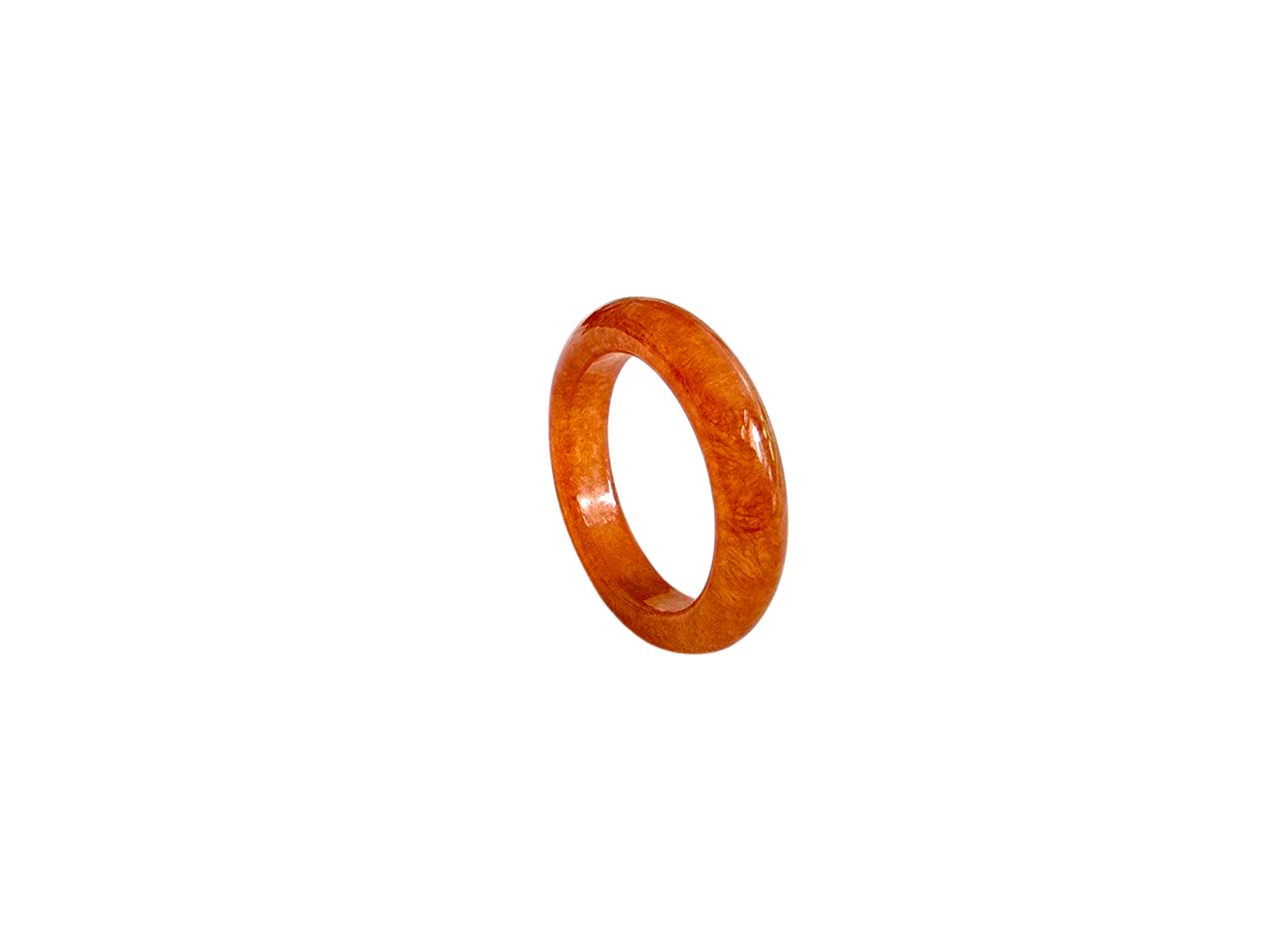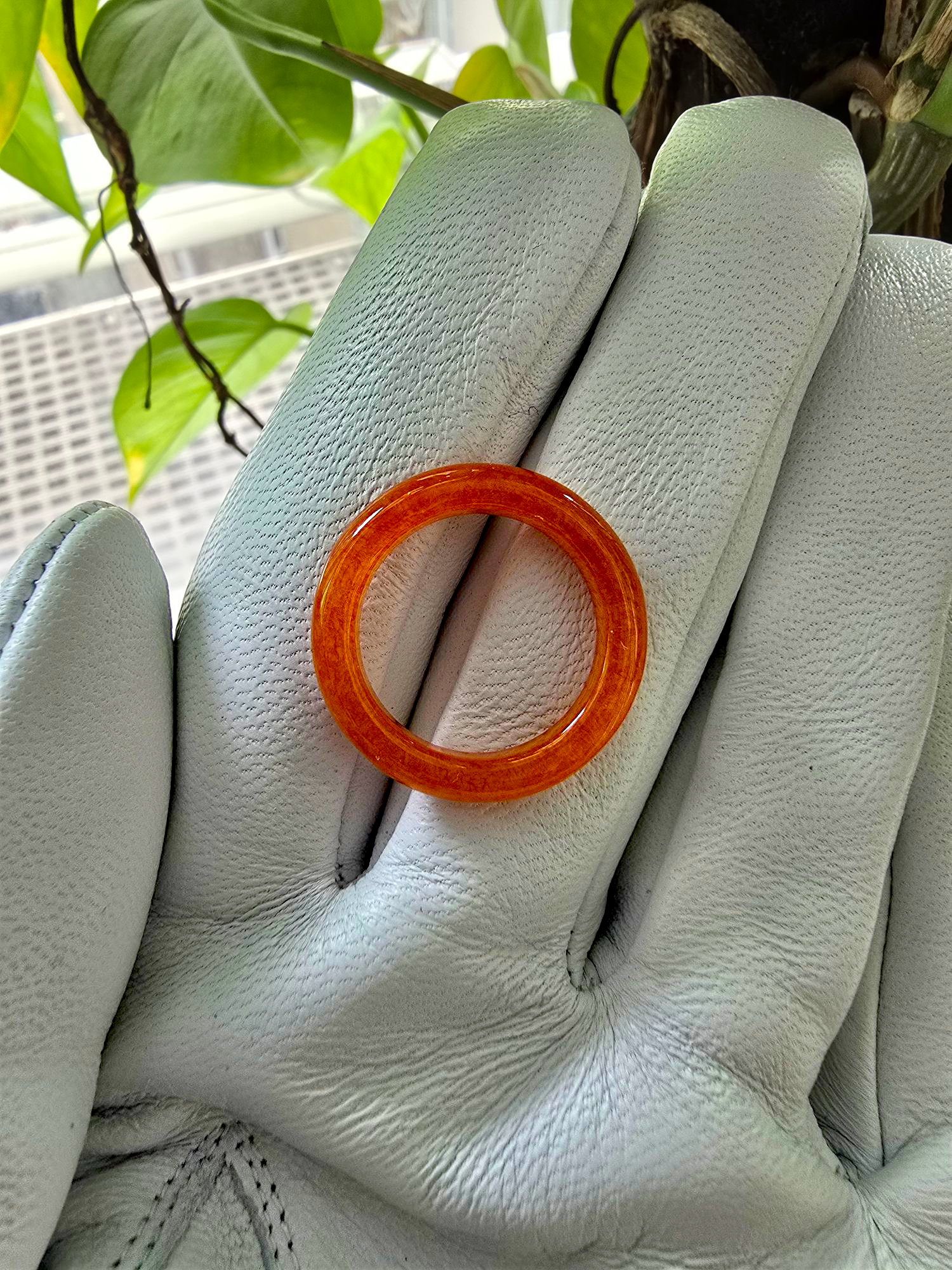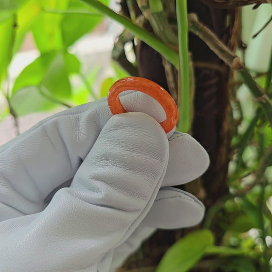 Each ring is unique and exclusively One-of One. With fibrous interwoven hues, this jadeite ring has a deep Orangey-Red tone with splashes and streaks of Intense Red Jadeite. Perfect luster and light, excellent translucency and no cracks or blemishes on the ring.