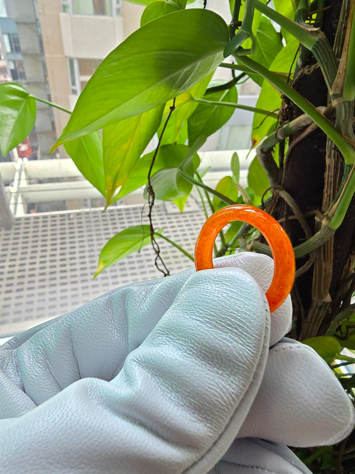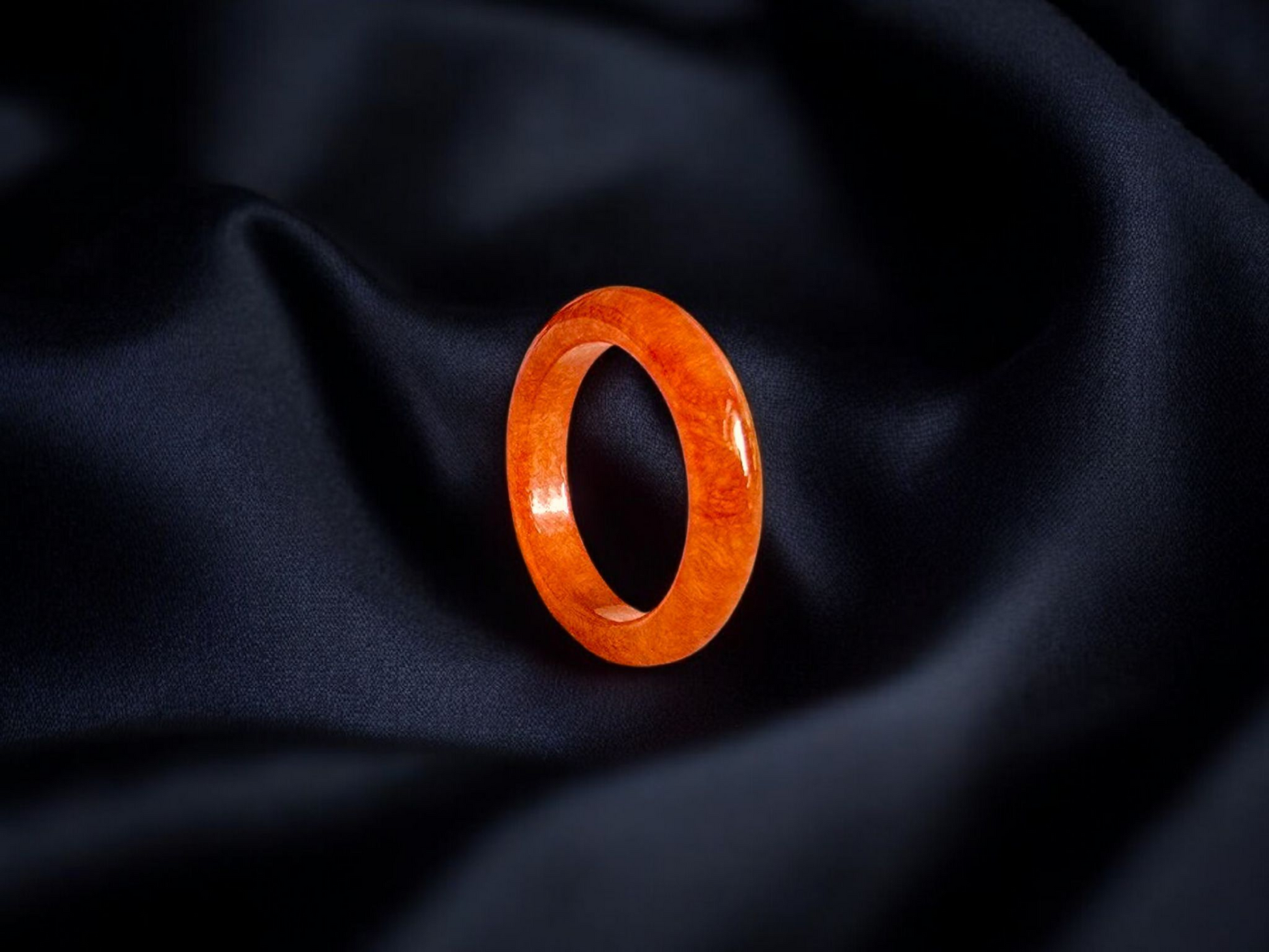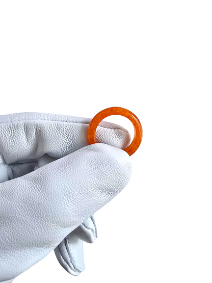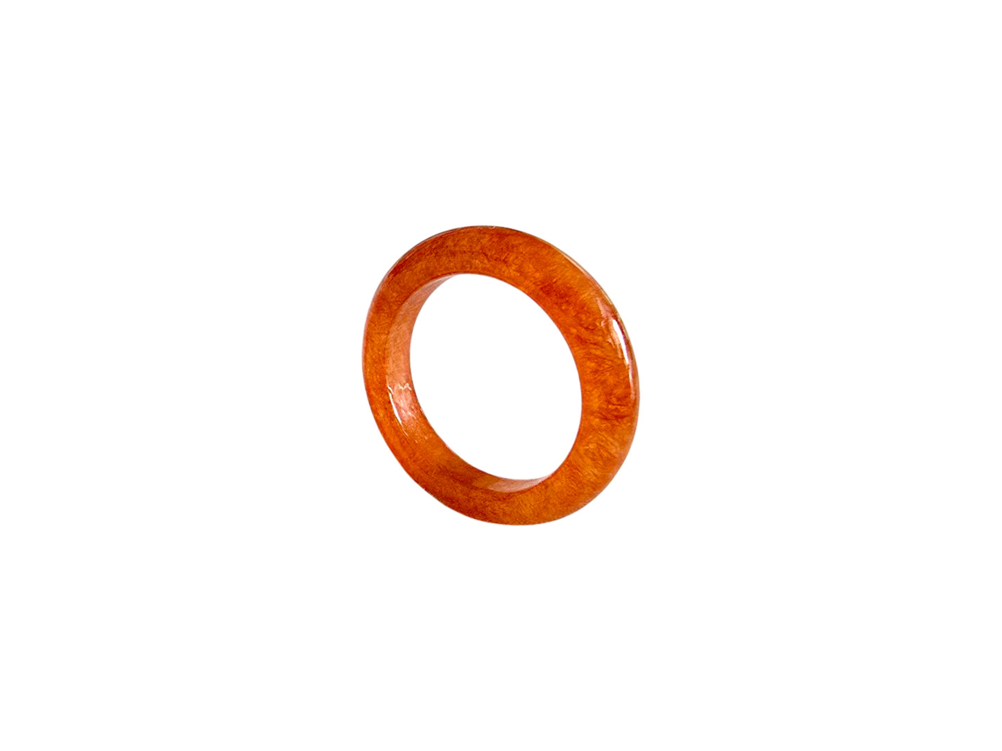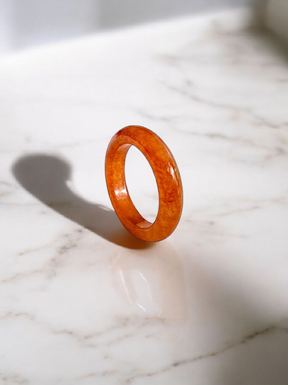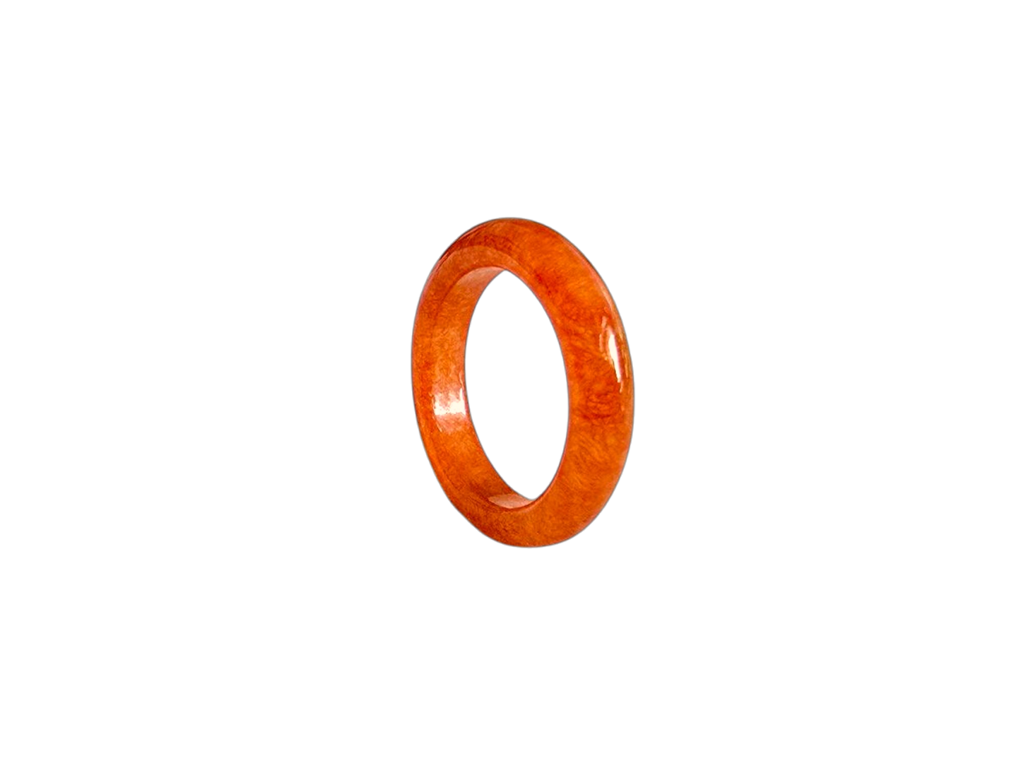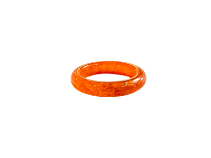 Each ring is unique and exclusively One-of One. With fibrous interwoven hues, this jadeite ring has a deep Orangey-Red tone with splashes and streaks of Intense Red Jadeite. Perfect luster and light, excellent translucency and no cracks or blemishes on the ring.