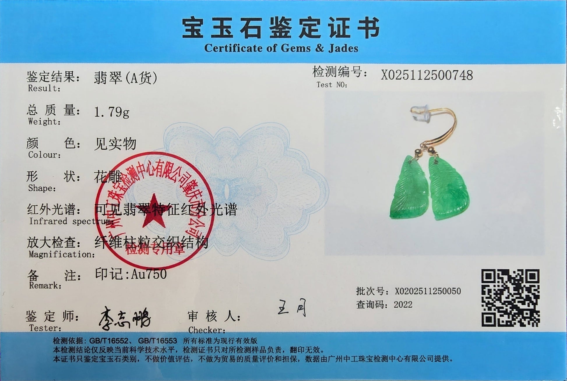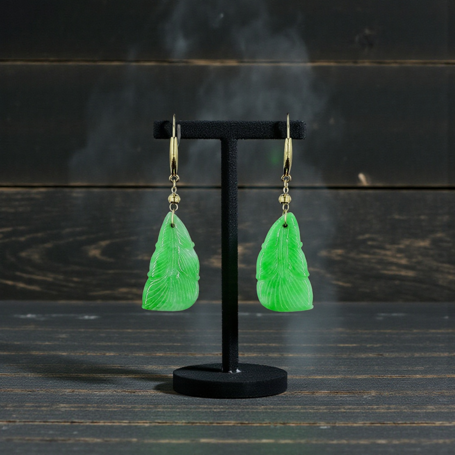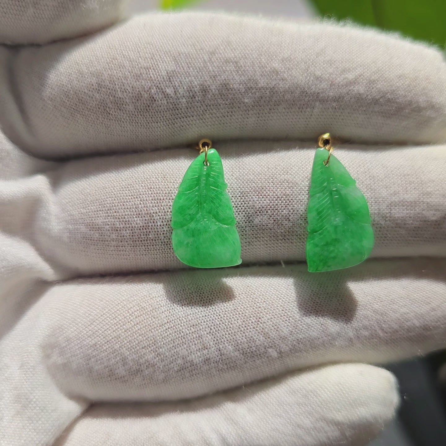Nakamura Dangling Leaf Imperial Green Burmese A-Jade Earrings (with 18K Yellow Gold) - Certified