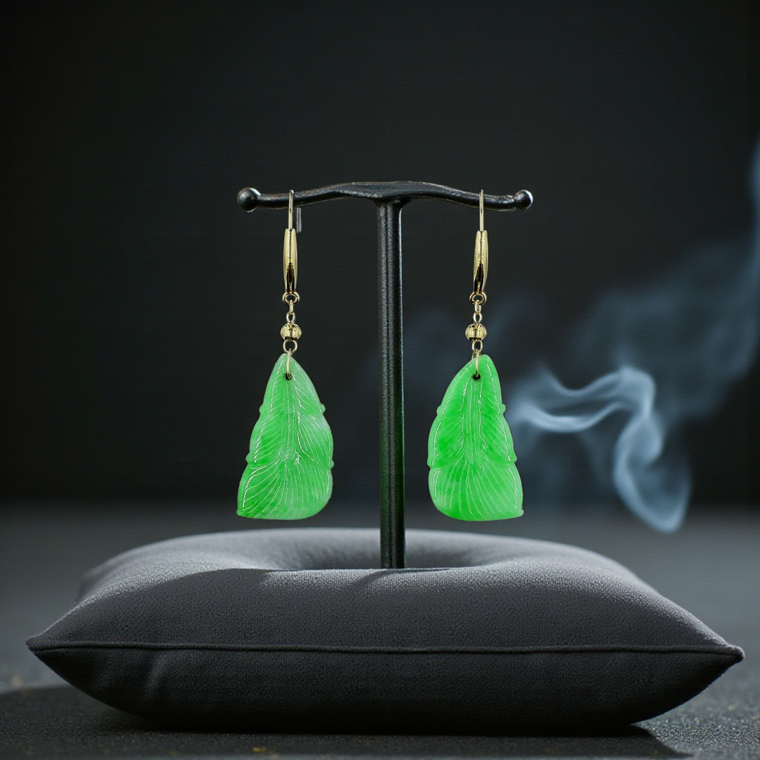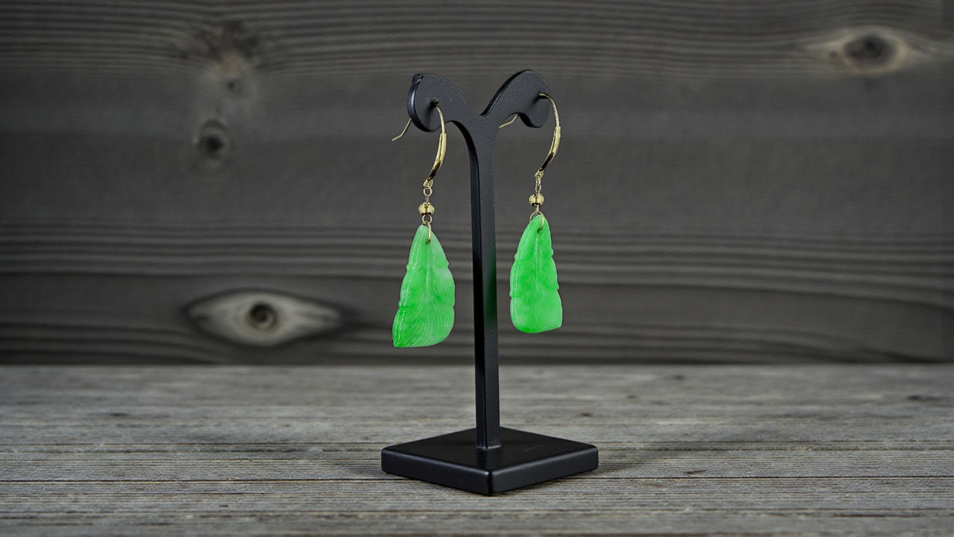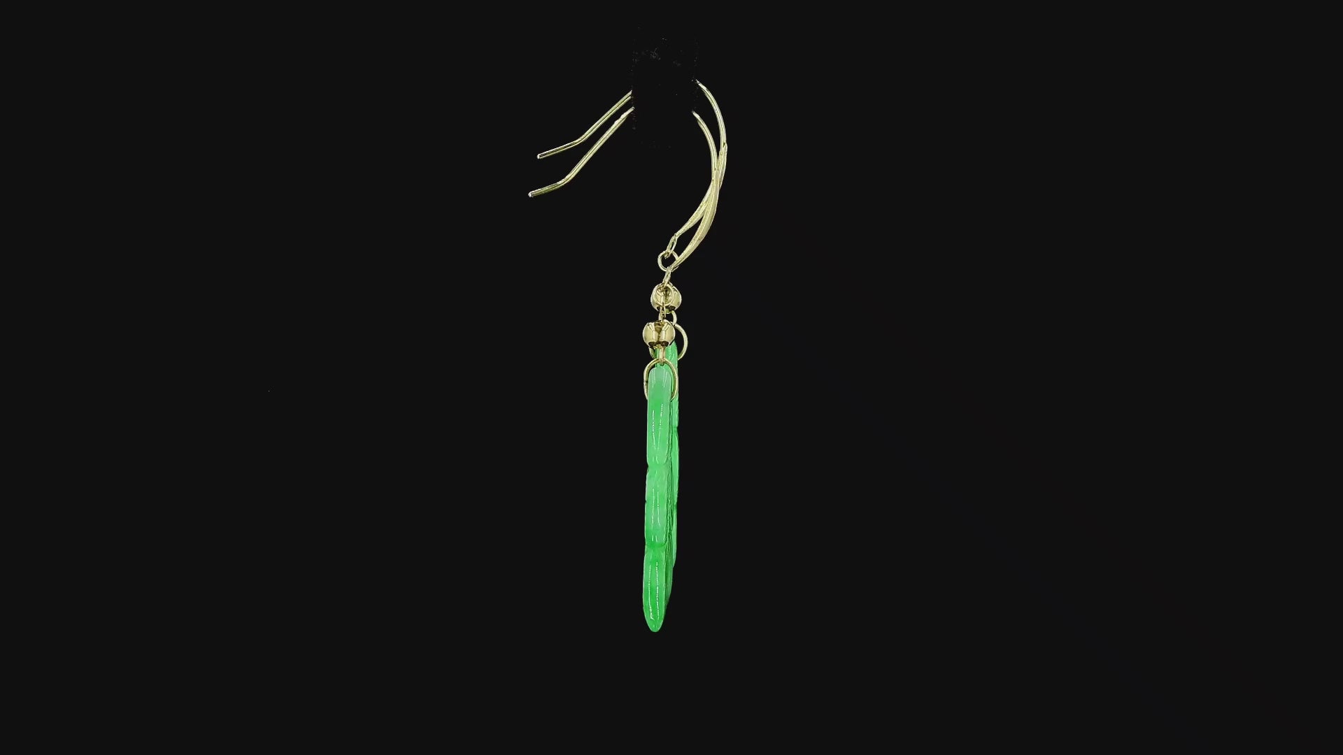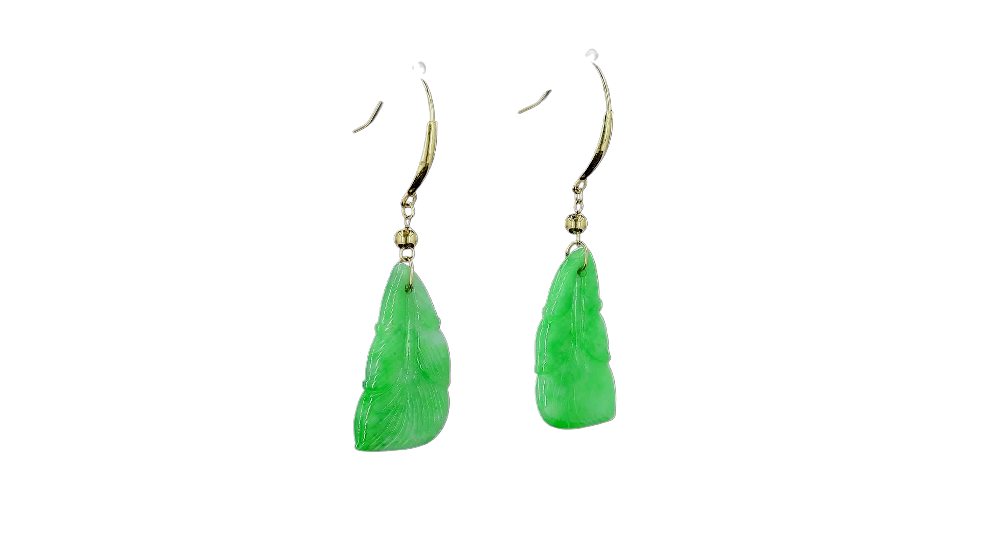 Nakamura Dangling Leaf Imperial Green Burmese A-Jade Earrings (with 18K Yellow Gold) - Certified