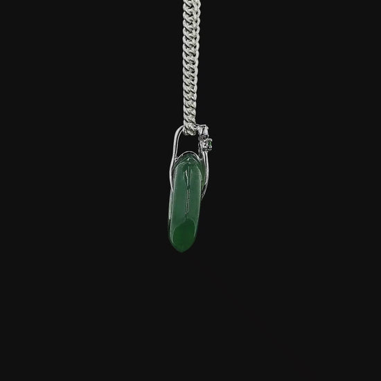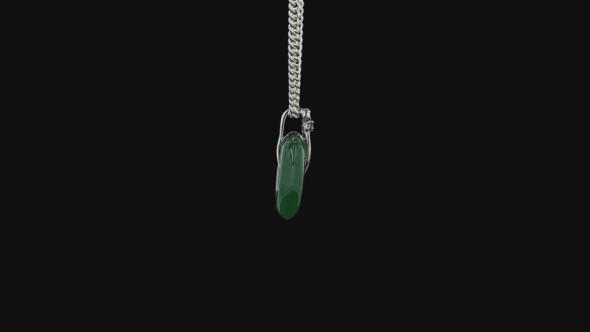 This pendant is made from handpicking the rarest Burmese A-Jadeite, with the best translucency, hues, tones and saturation of green. This icy pendant has Deep Green Base hues, with Vivid green patches and veins, to create a stunning carved pendant. This pendant exhibits supreme translucency with a smooth watery and icy texture. We add a small cabochon of Vivid-Imperial Green Jadeite to the clasp with natural round brilliant white diamonds and 18K White Gold. This pendant is the pinnacle of design and craftsmanship.