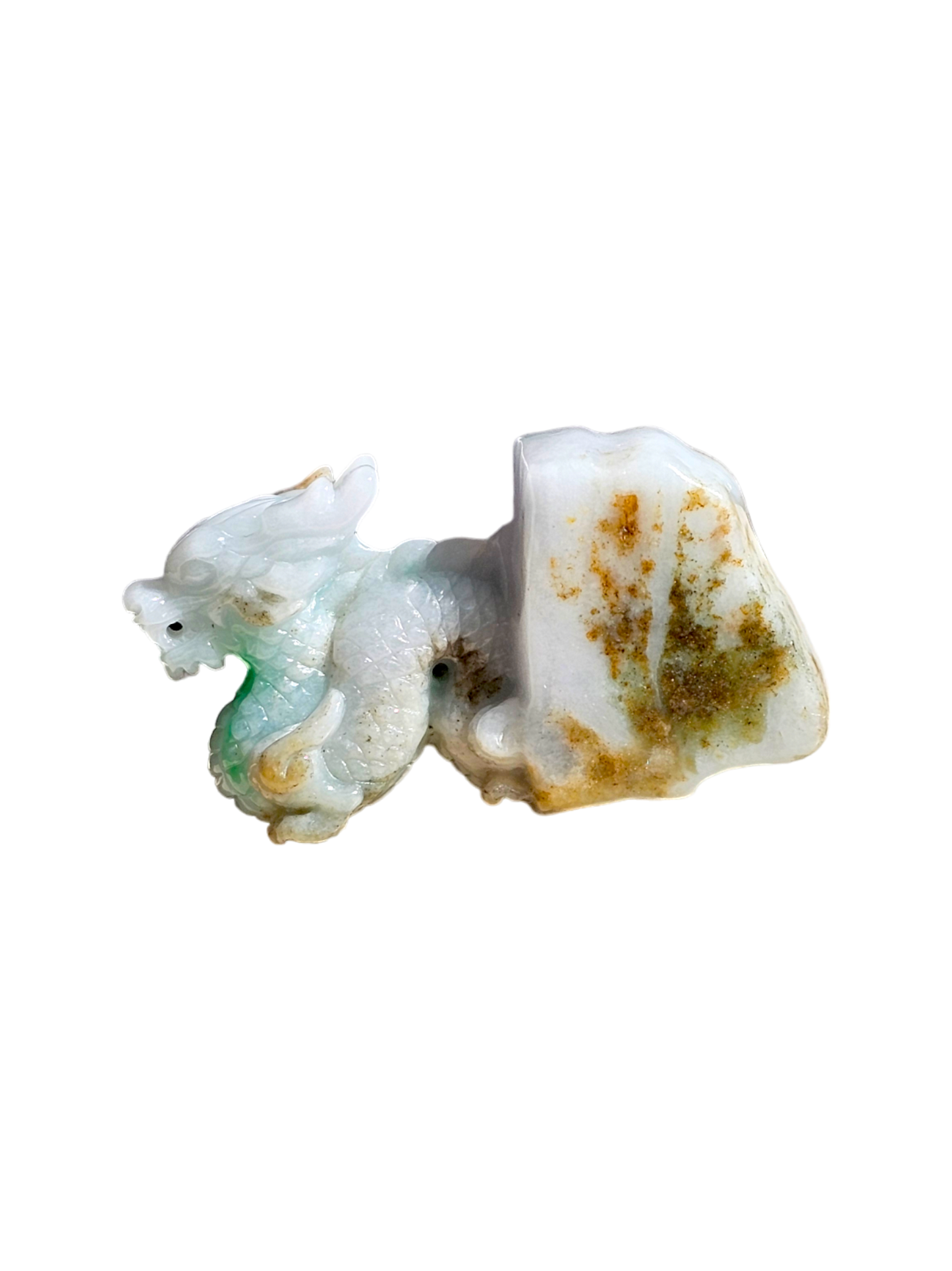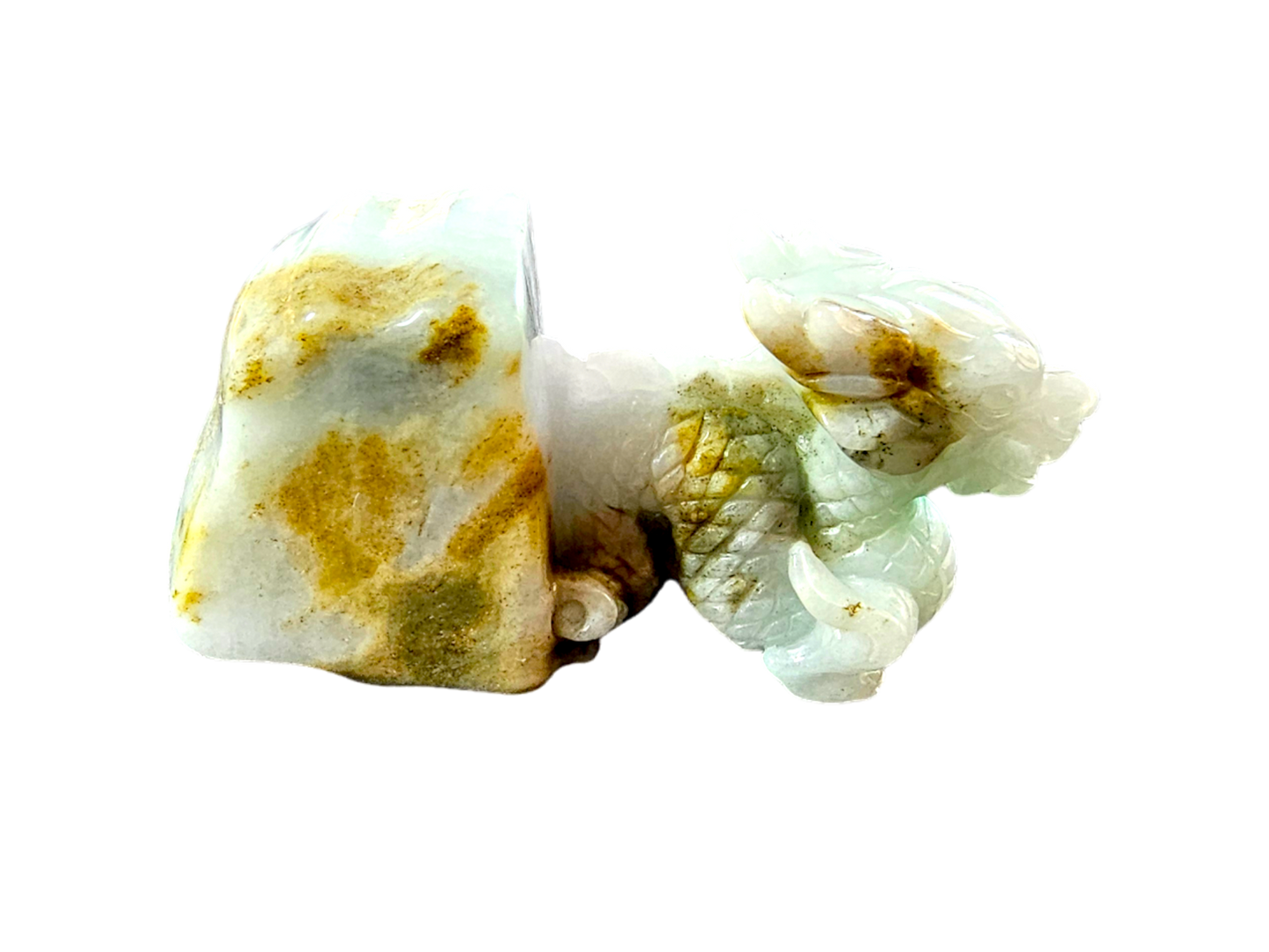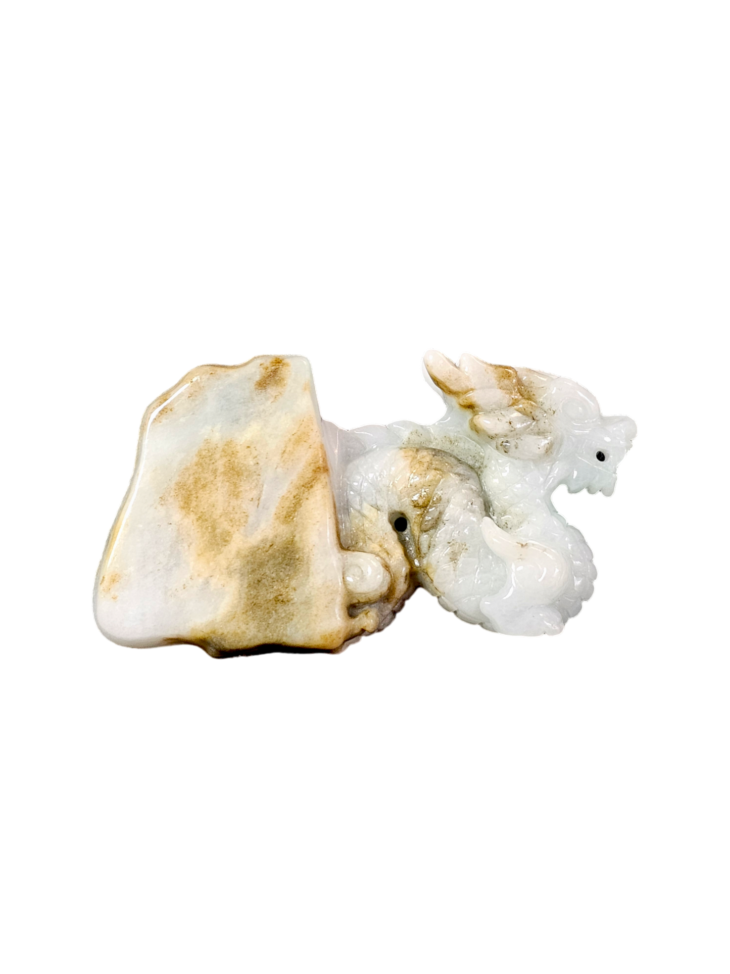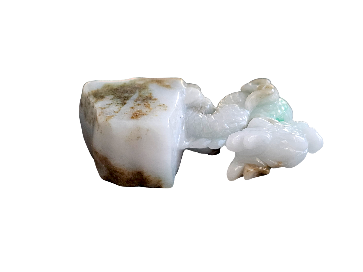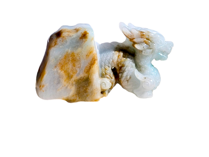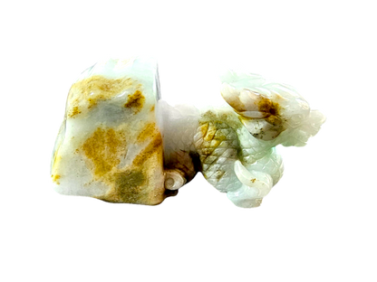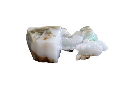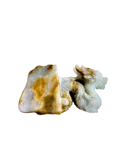 The Imperiousness of a Dragon is best shown through our Burmese A-Jadeite carving. Half polished-rough and half polished-carved, our famous Dragon Design emerges from its origin stone. Our top carver wanted to respect the natural beauty and proportions of Jadeite, while showing our carving prowess and design elements.