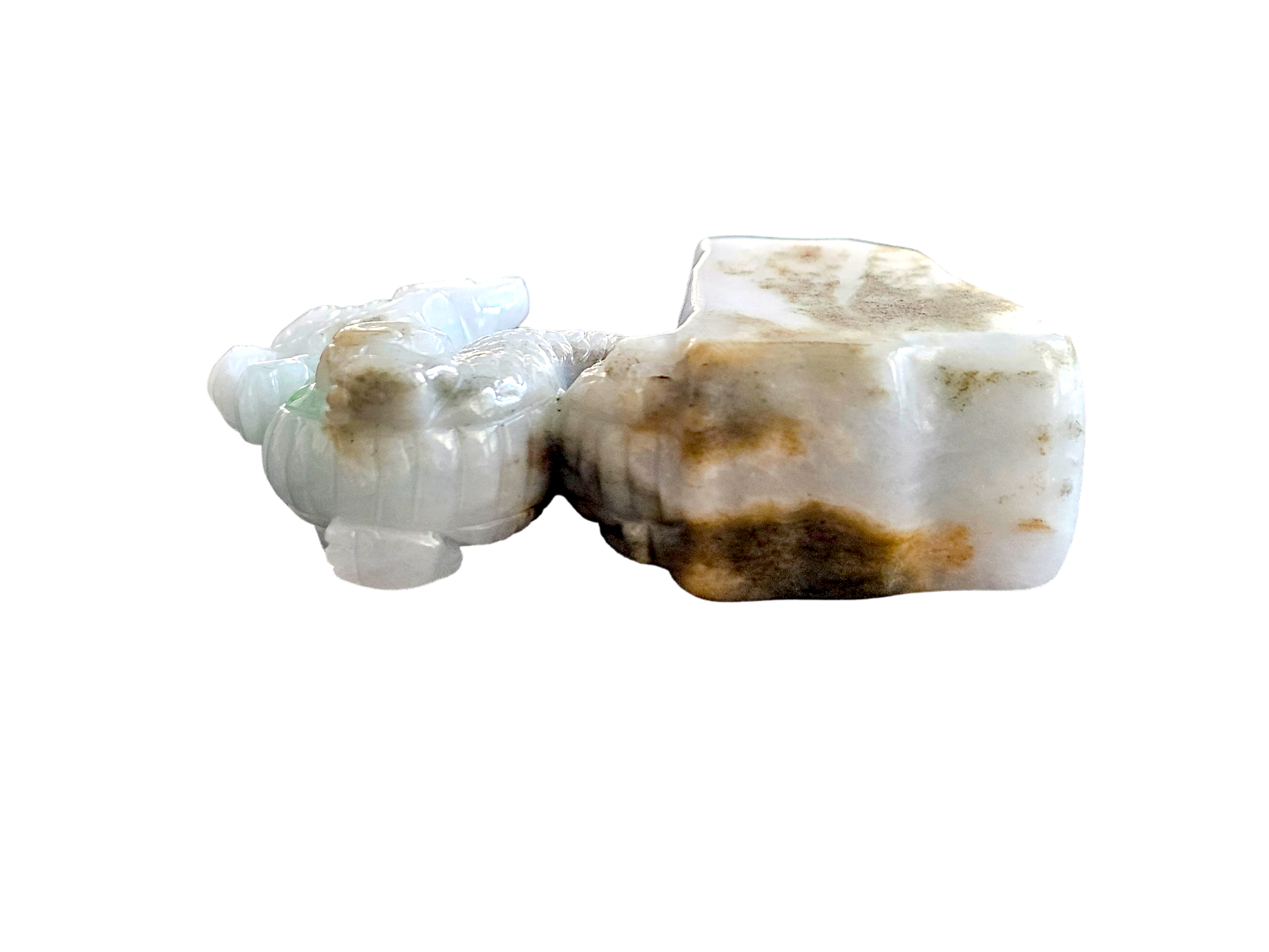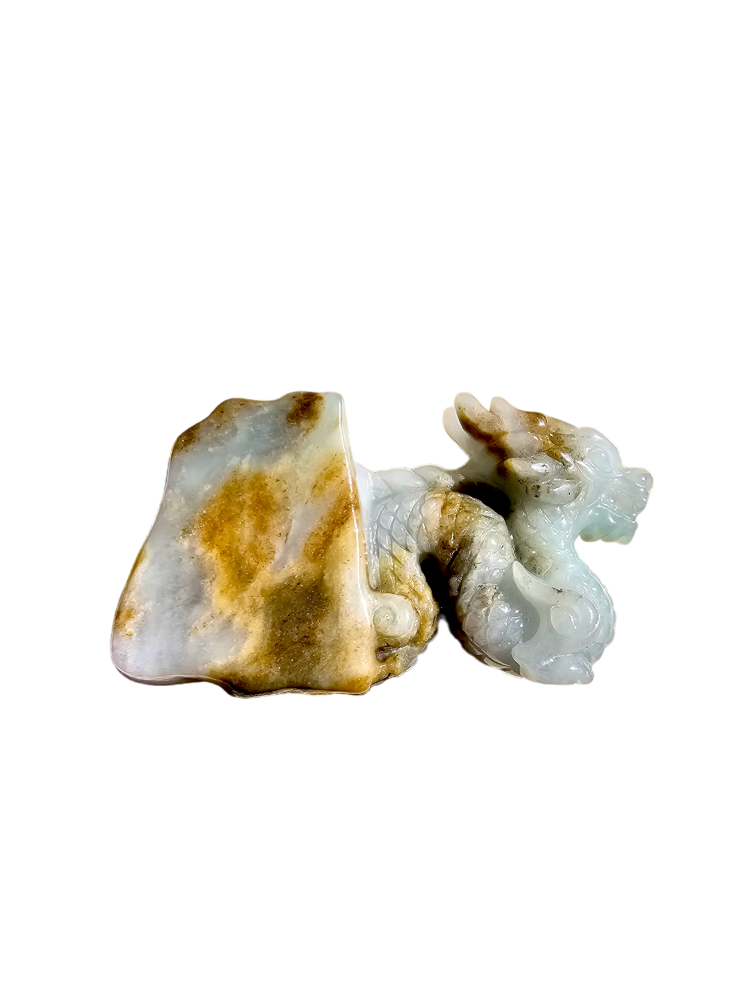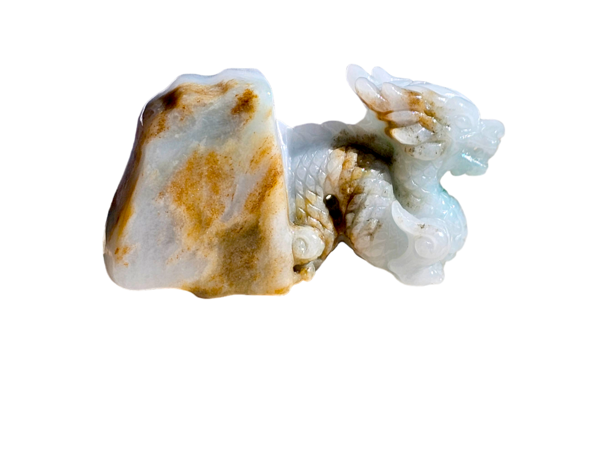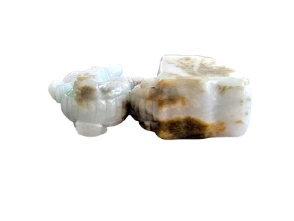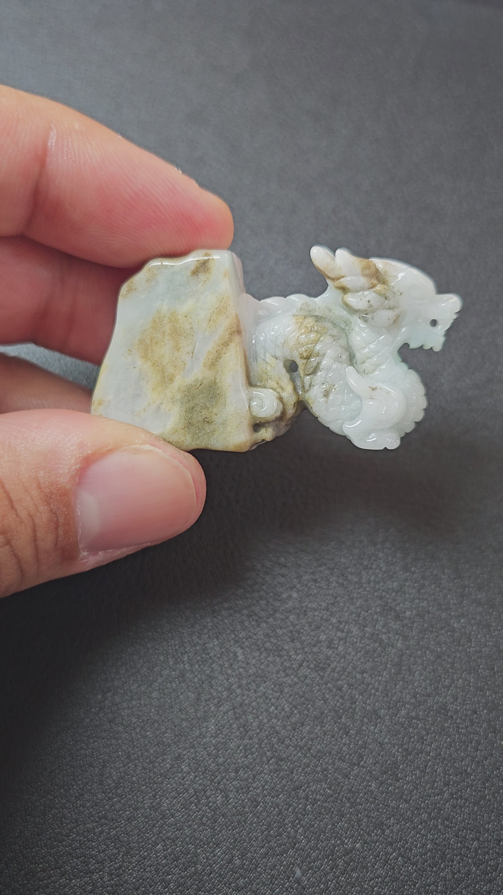 The Imperiousness of a Dragon is best shown through our Burmese A-Jadeite carving. Half polished-rough and half polished-carved, our famous Dragon Design emerges from its origin stone. Our top carver wanted to respect the natural beauty and proportions of Jadeite, while showing our carving prowess and design elements.