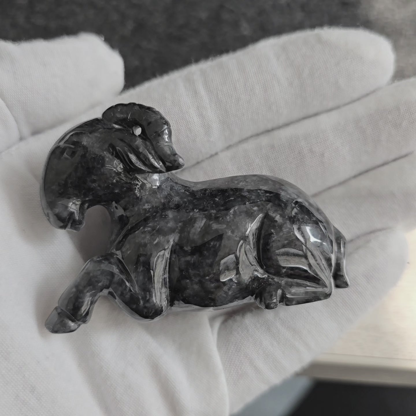 Inspired by the beautiful Animal 'Ram', this carved masterpiece is created from handpicking the rarest single block of Black Burmese A-Jadeite Jade, with the excellent translucency, hues, tones and saturation of Black.