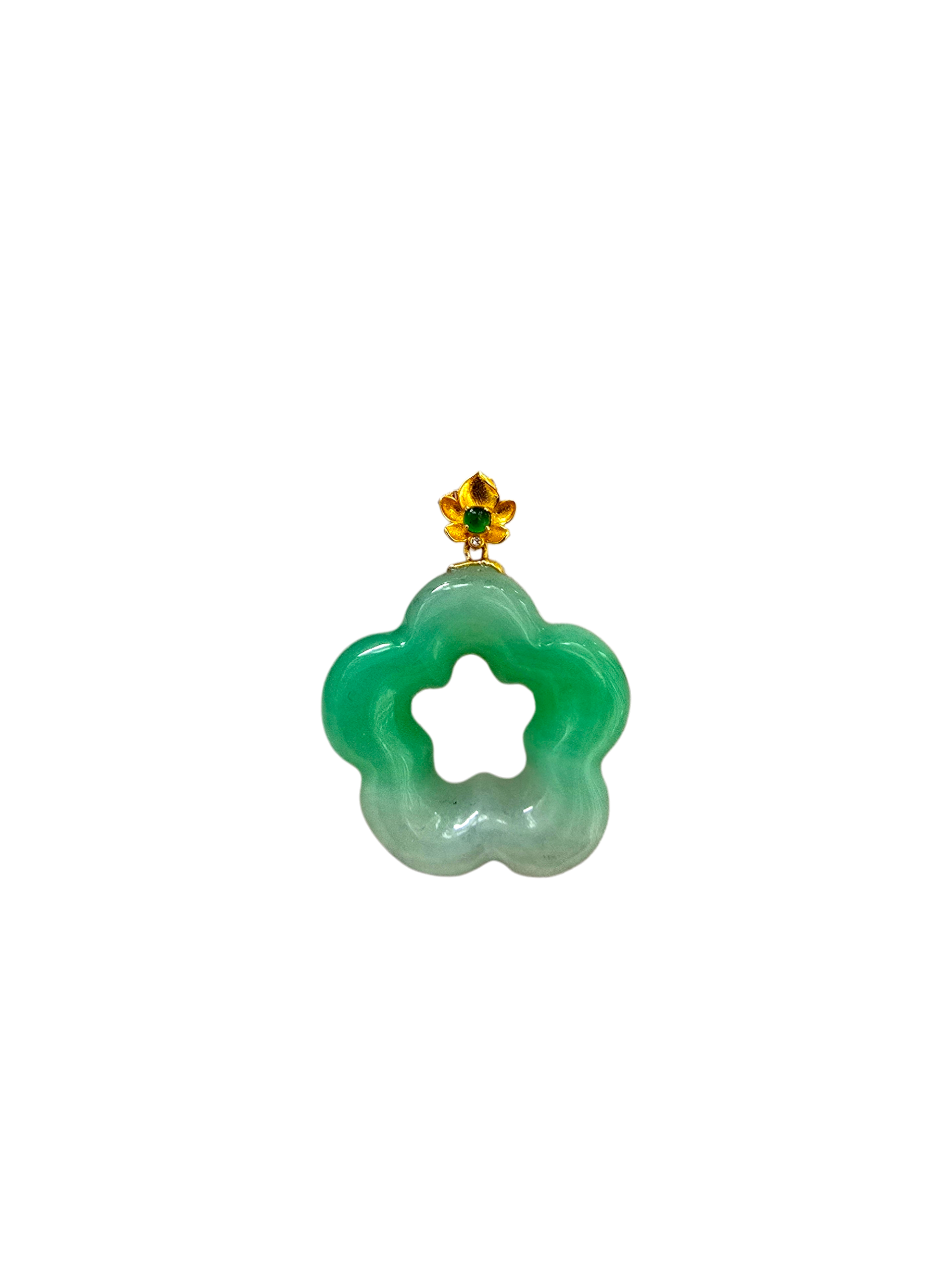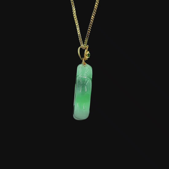 This pendant is made from handpicking the rarest Burmese A-Jadeite, with the best translucency, hues, tones and saturation of green. This icy pendant has Bright Green and White Base hues, with Imperial Green, Vivid green, Intense Green and white patches with veins, to create a stunning carved pendant. This pendant exhibits good translucency with a smooth watery texture. We add a small cabochon of Vivid-Imperial Green Jadeite to the Bauhinia-shaped 18K Yellow Gold Clasp. This pendant is the pinnacle of design and craftsmanship.