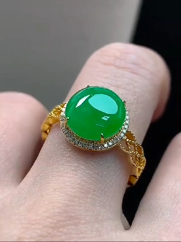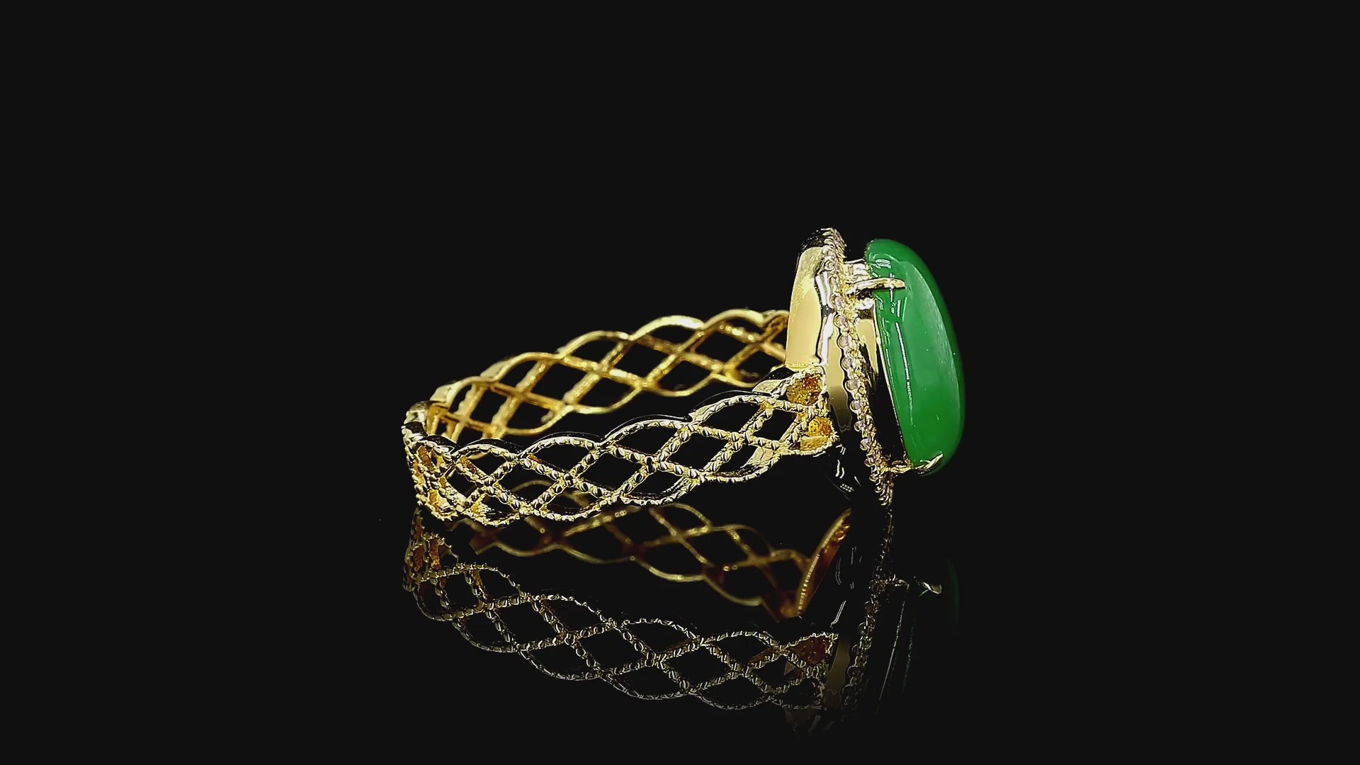 Each Cabochon is a piece-unique, one-of-a-kind. No two Jadeite stones are ever created the same by nature, perfect for something truly exclusive. A great addition to any investment collection. The diamond Halo adds a scintillating sparkle, with the Yellow Gold providing a canvas to showcase the gemstone.