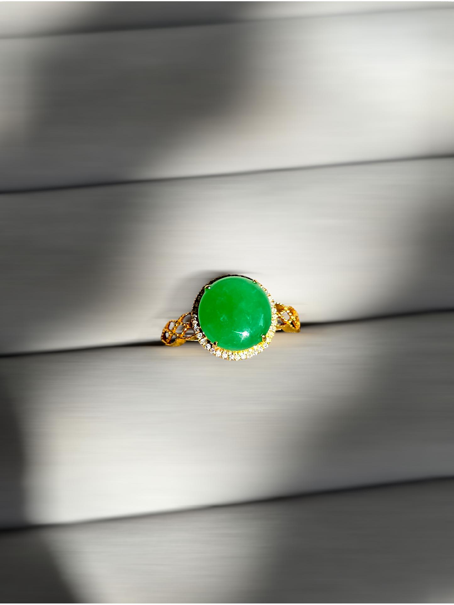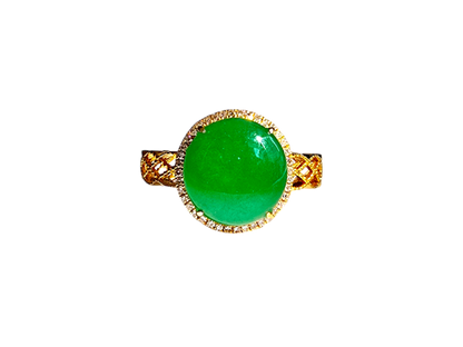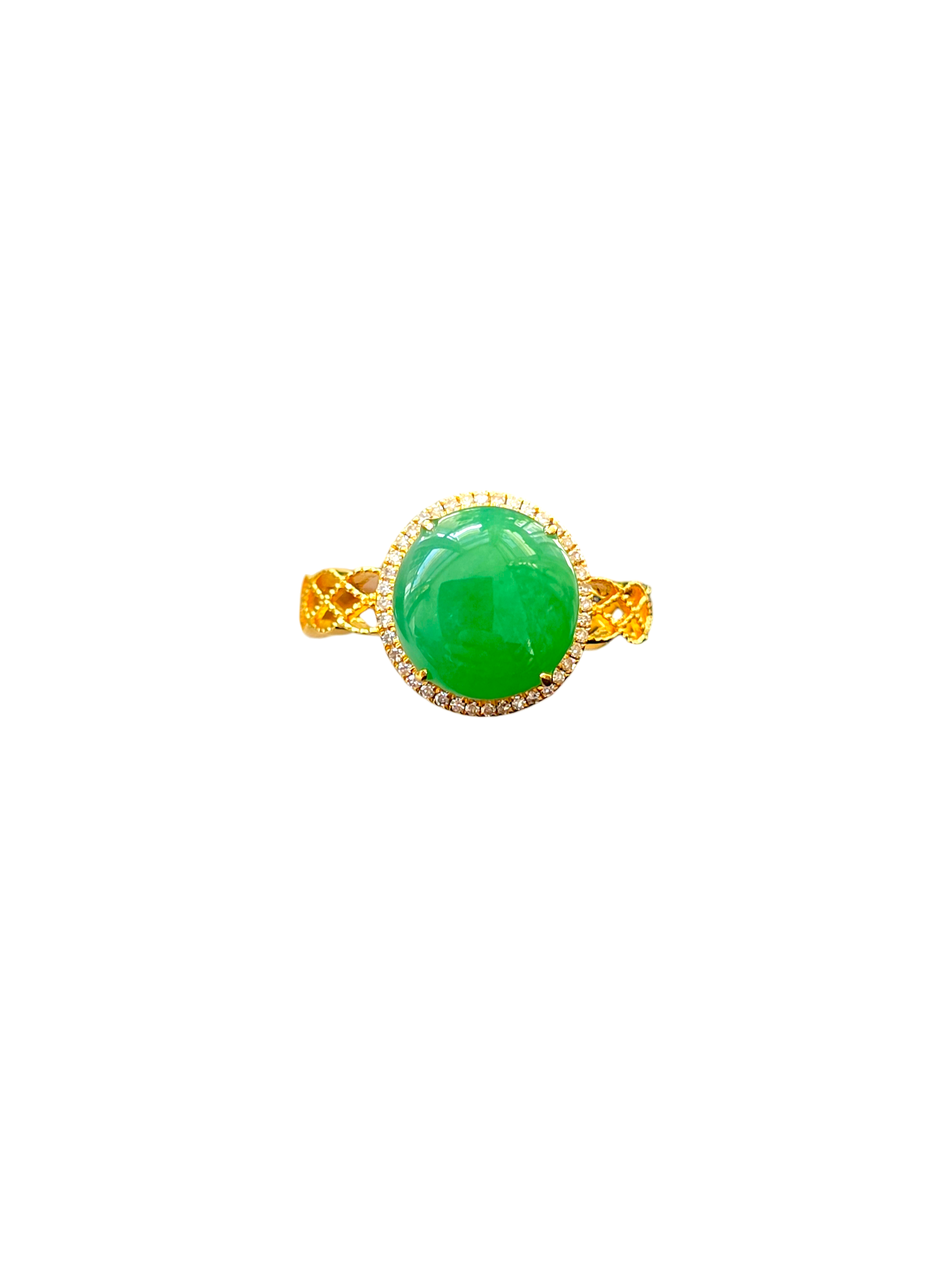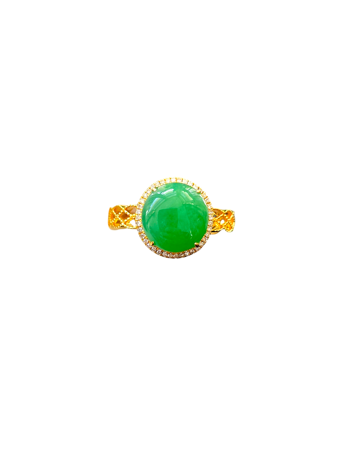 This Ring uses completely natural Vivid Green Burmese A-Jadeite, with no treatments or enhancements, as the show-stopping center stone, with a natural Round Brilliant White Diamonds Halo. We create a signature interweaving Gold structure as the ring, for a sophisticated and detailed look.