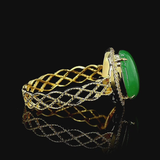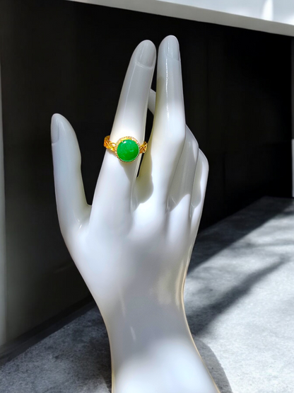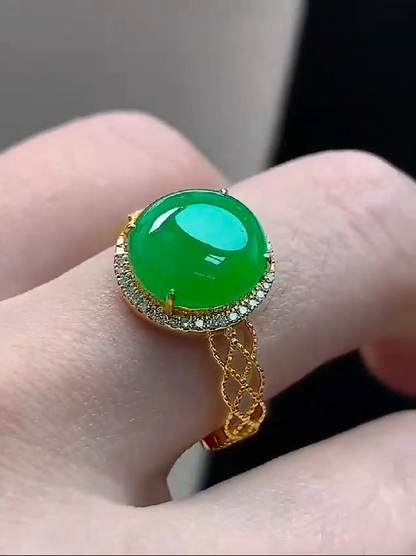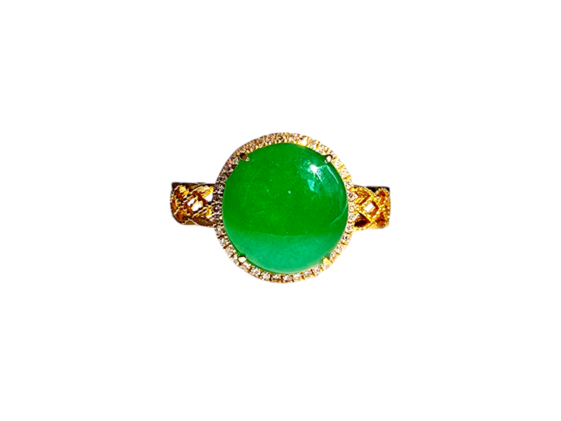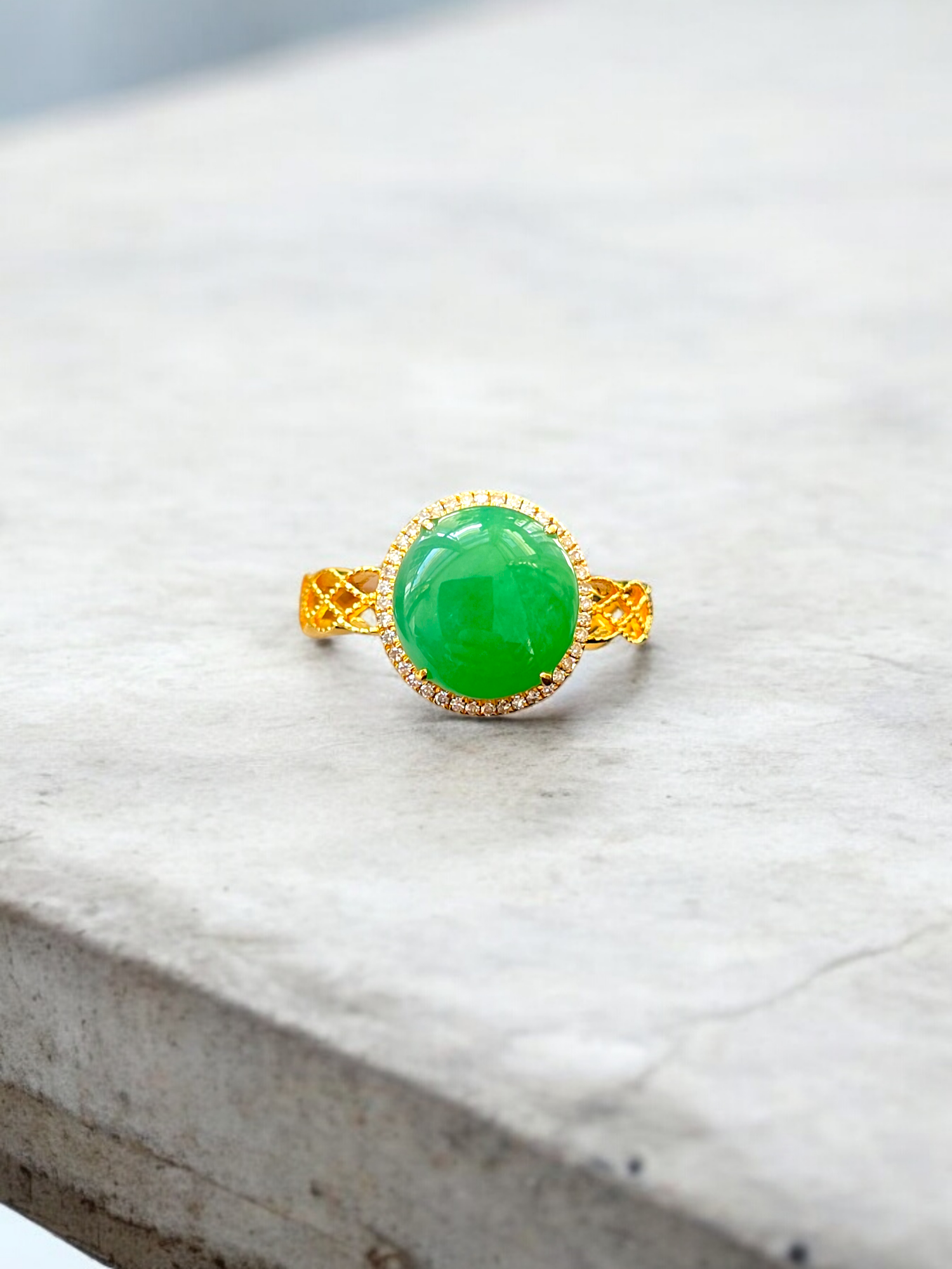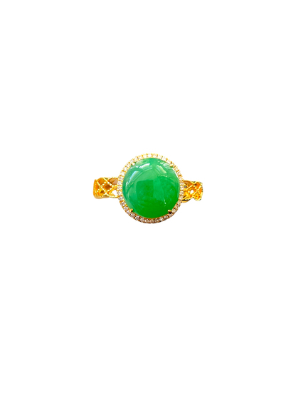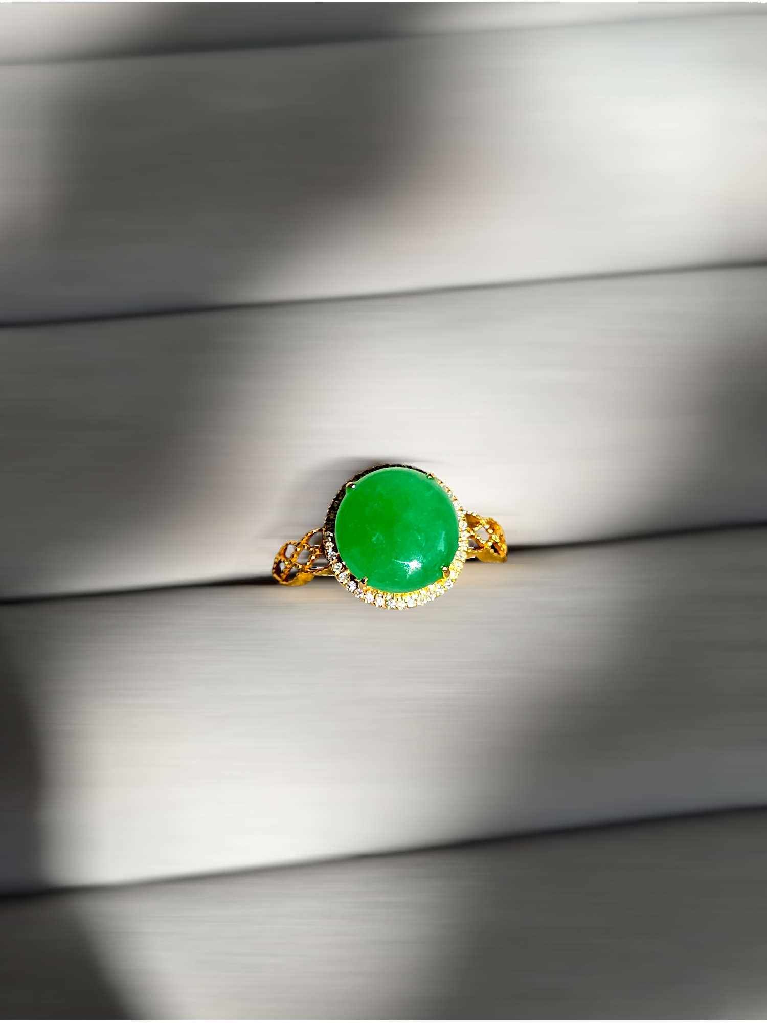 This Ring uses completely natural Vivid Green Burmese A-Jadeite, with no treatments or enhancements, as the show-stopping center stone, with a natural Round Brilliant White Diamonds Halo. We create a signature interweaving Gold structure as the ring, for a sophisticated and detailed look.
