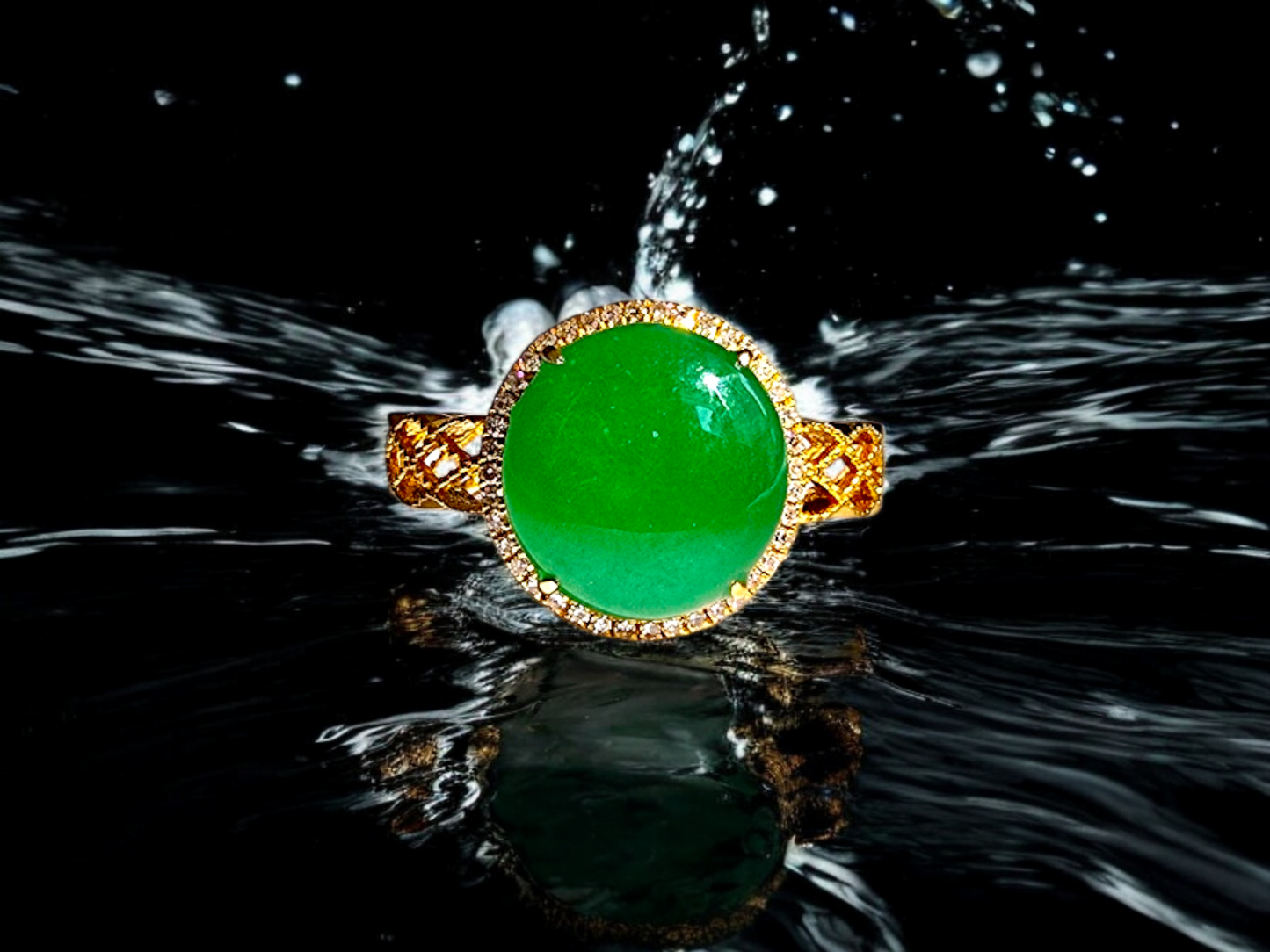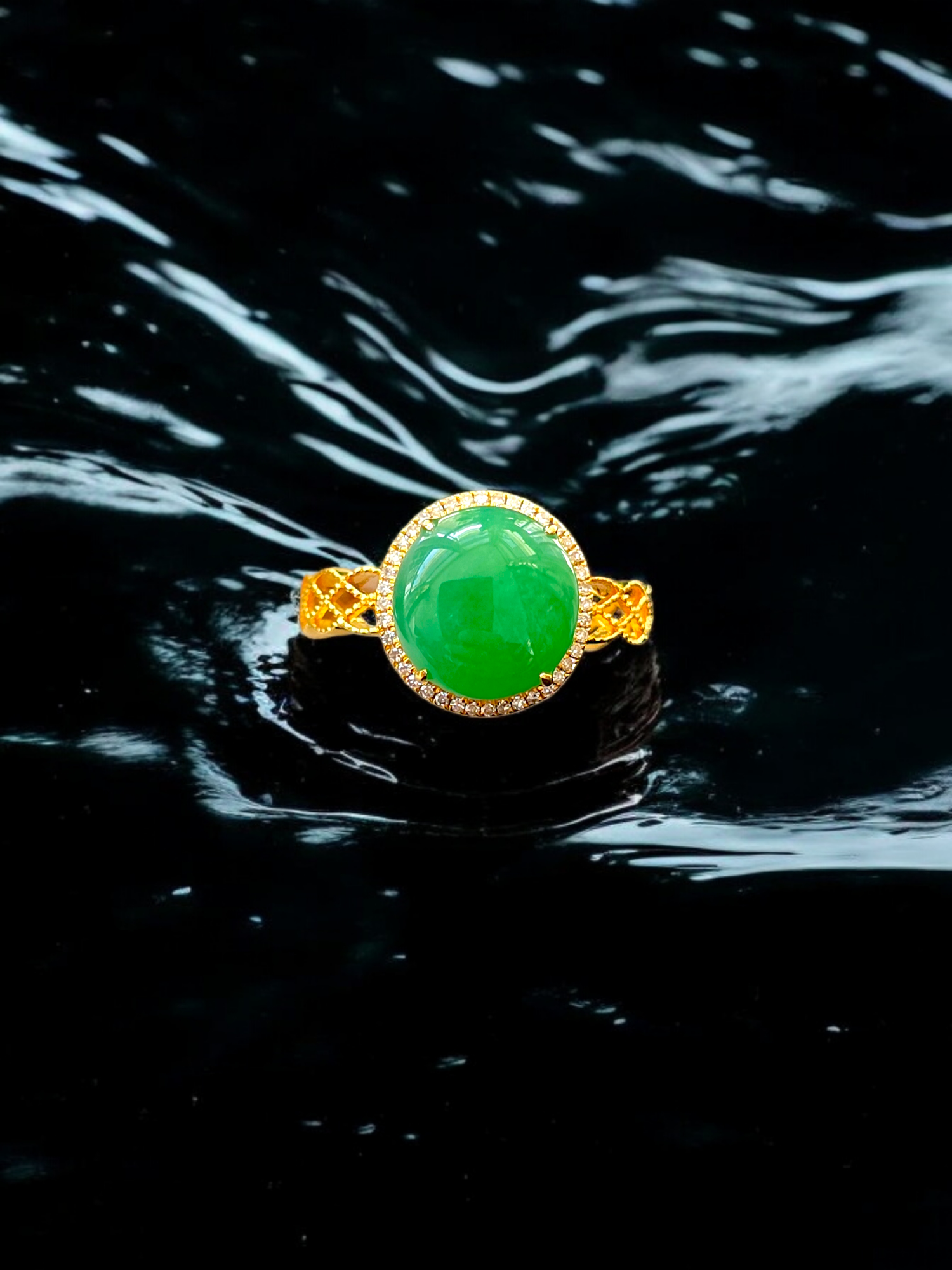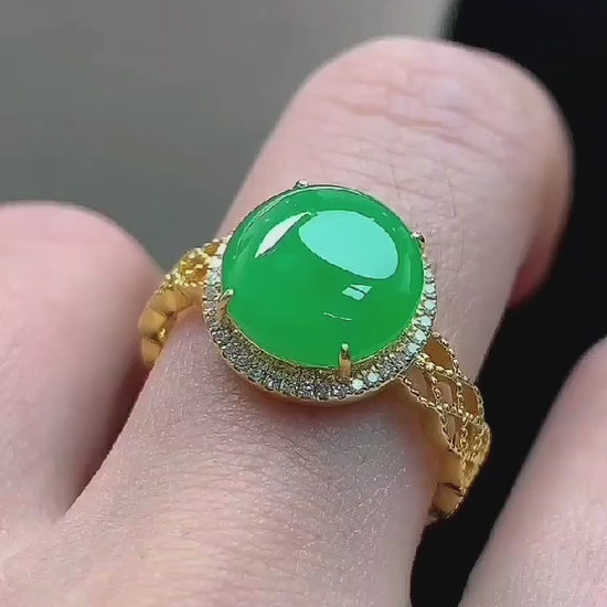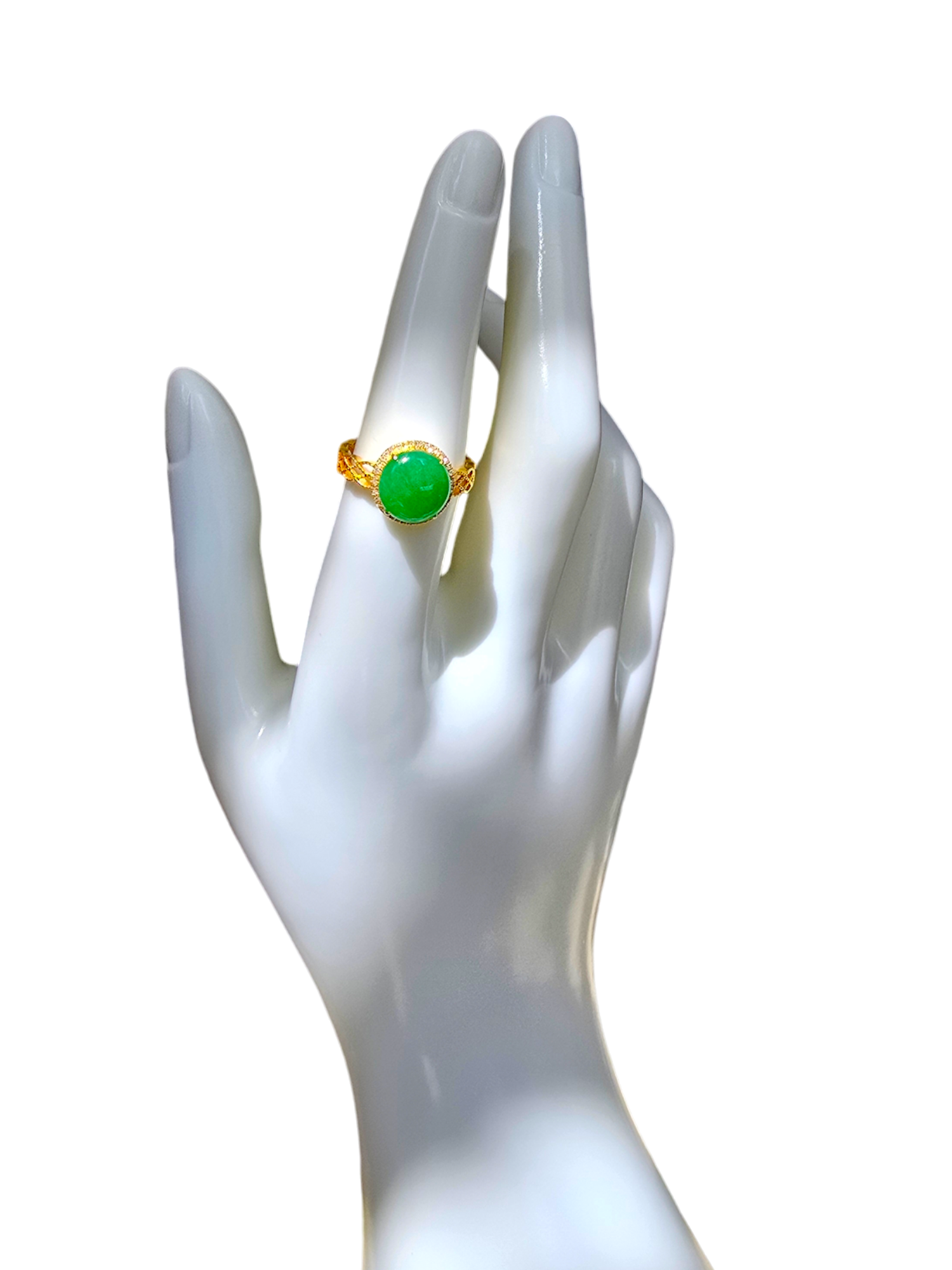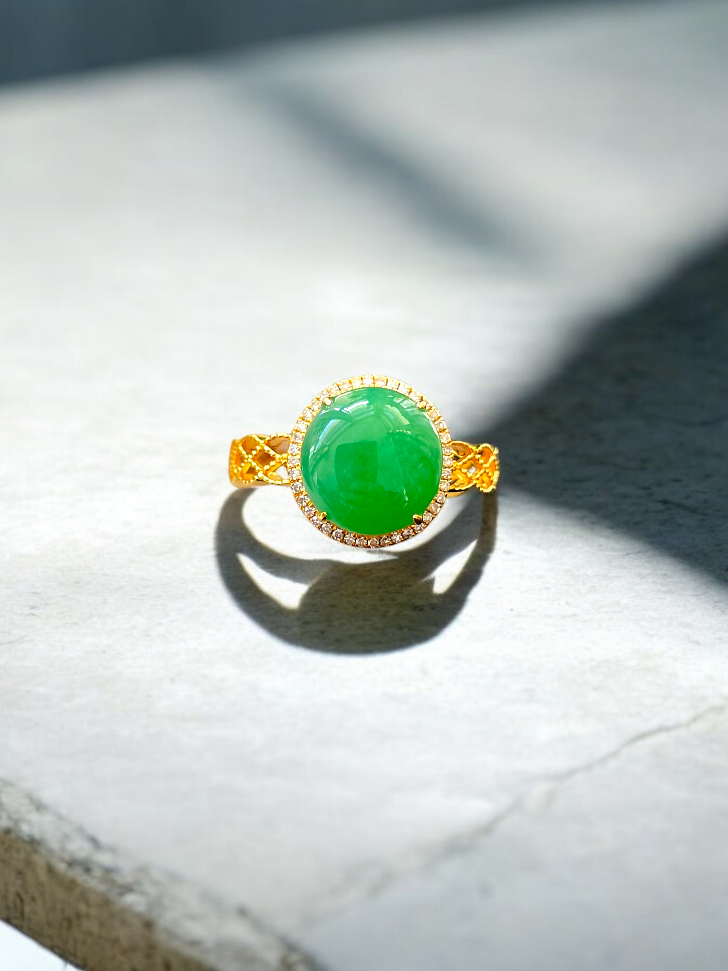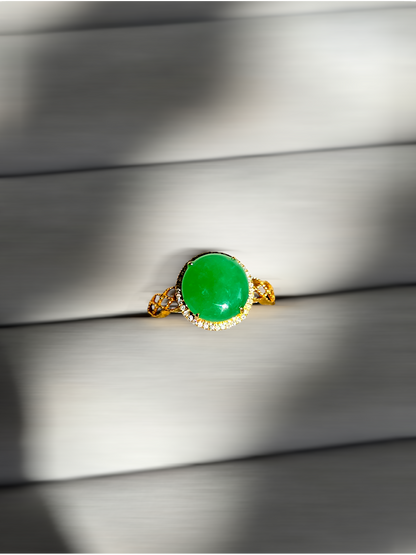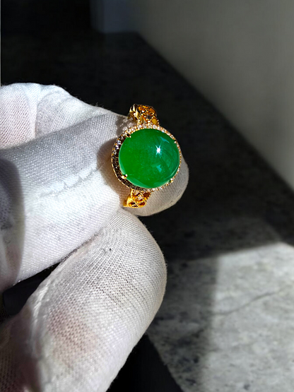 'Shinjuku' MADE IN JAPAN Burmese Vivid Green A-Jadeite Jade, Natural Round Brilliant White Diamonds and Solid 18K Yellow Gold Ring Vivid Green Round Cabochon - Certified