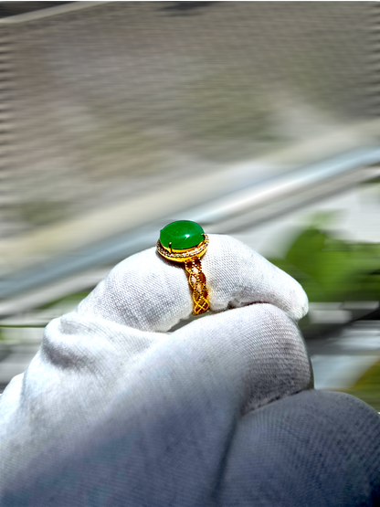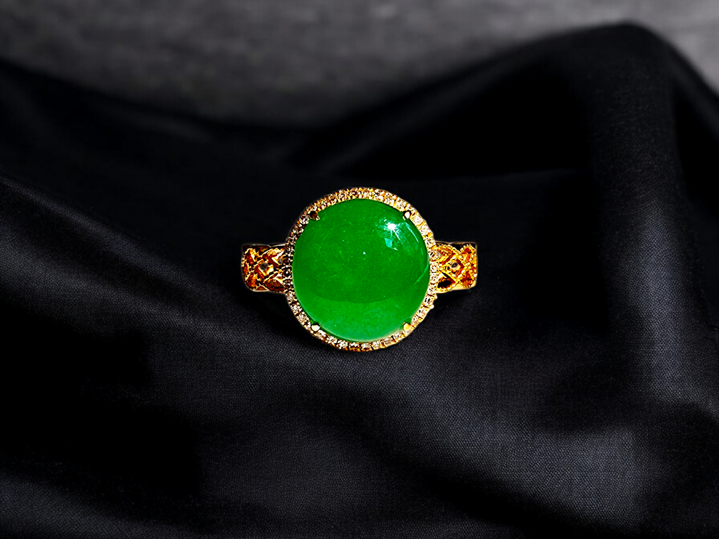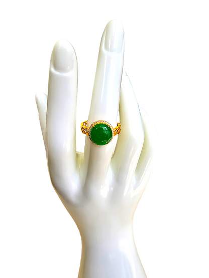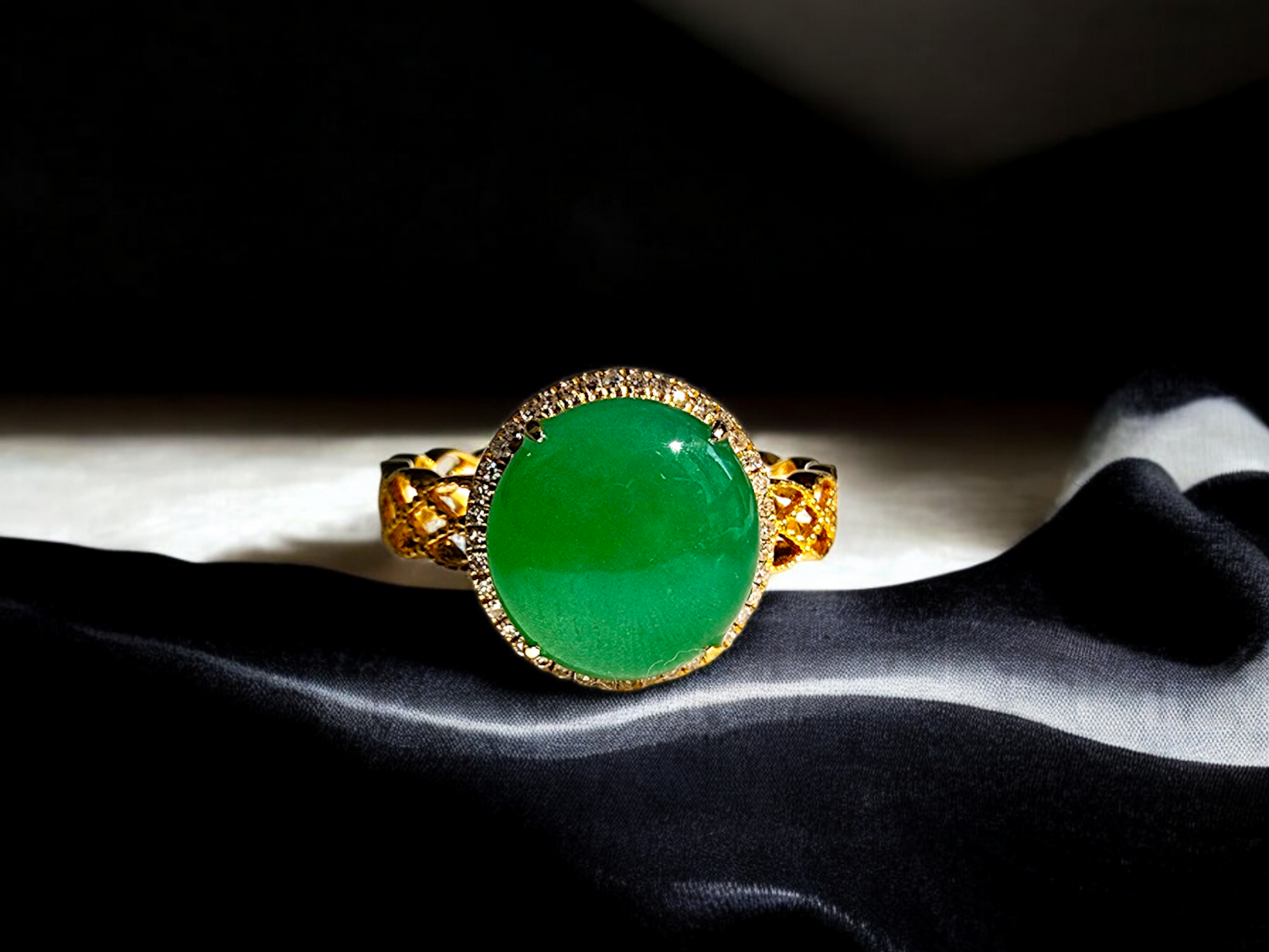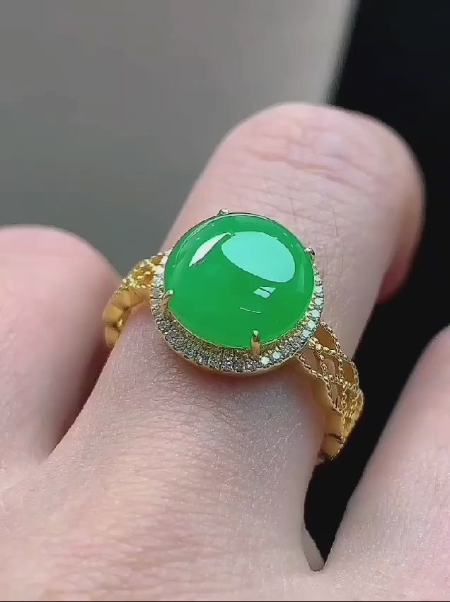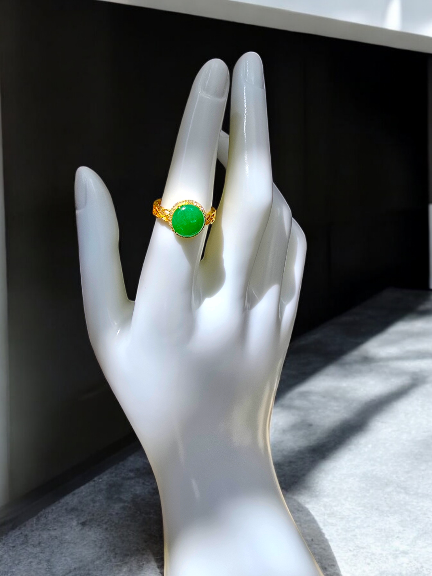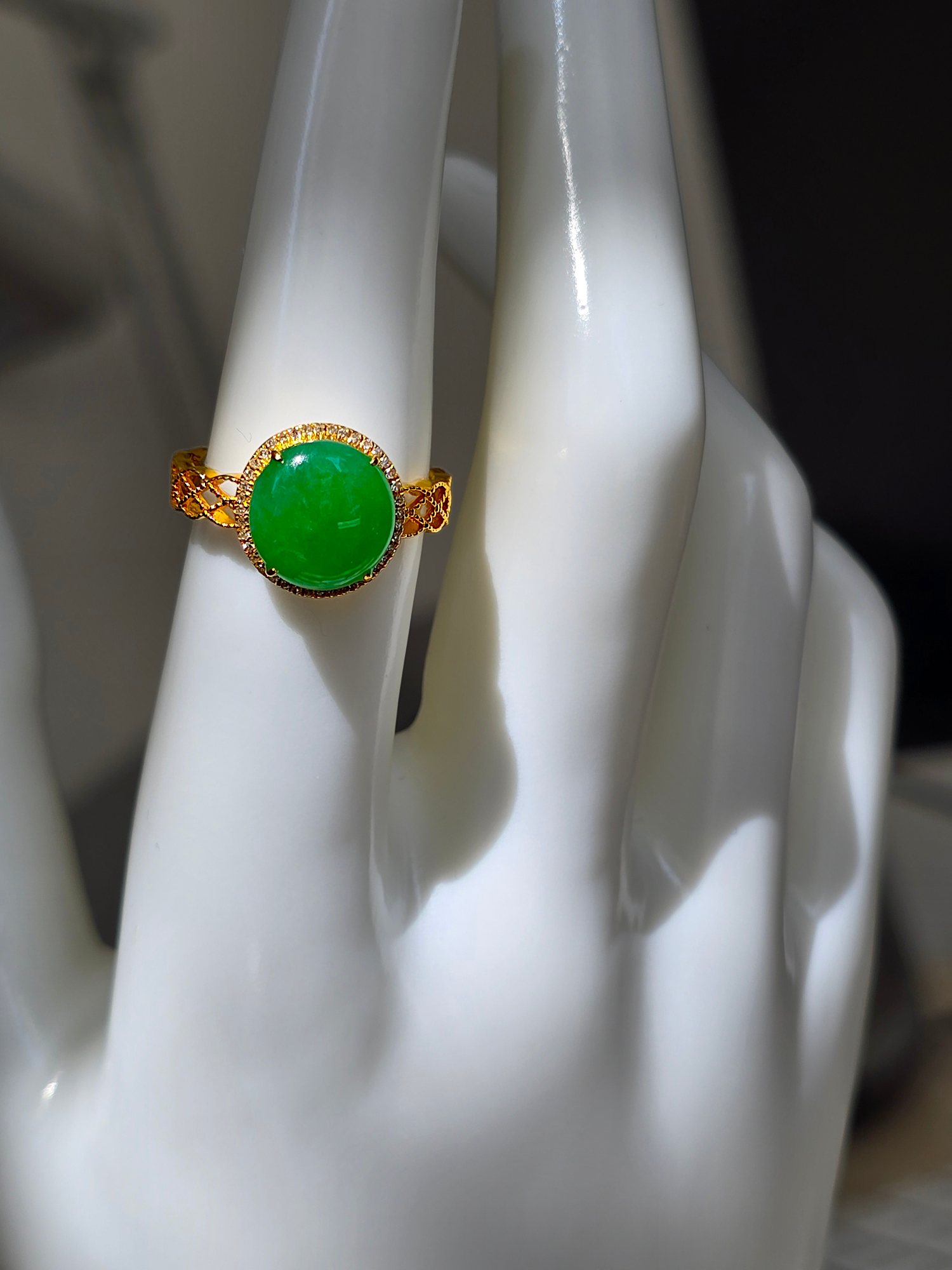 'Shinjuku' MADE IN JAPAN Burmese Vivid Green A-Jadeite Jade, Natural Round Brilliant White Diamonds and Solid 18K Yellow Gold Ring Vivid Green Round Cabochon - Certified