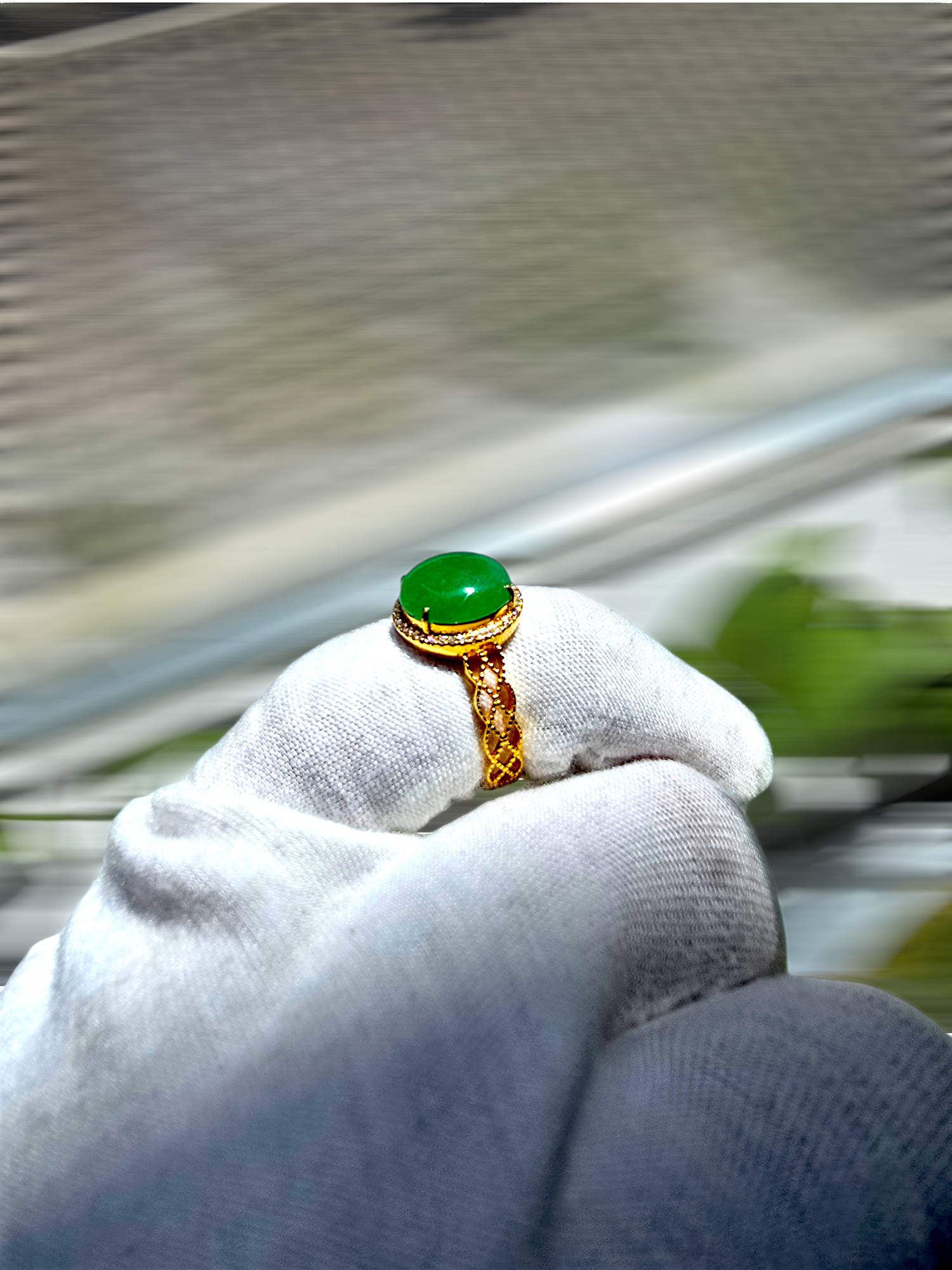 We curate a single stone with high optical properties, Vivid Imperial Green Hues, and excellent translucency; where the depth of color and transparency are balanced. With no eye-visible Patterns and patches, the center stone has consistent Imperial Green and Vivid Green Base Hues.