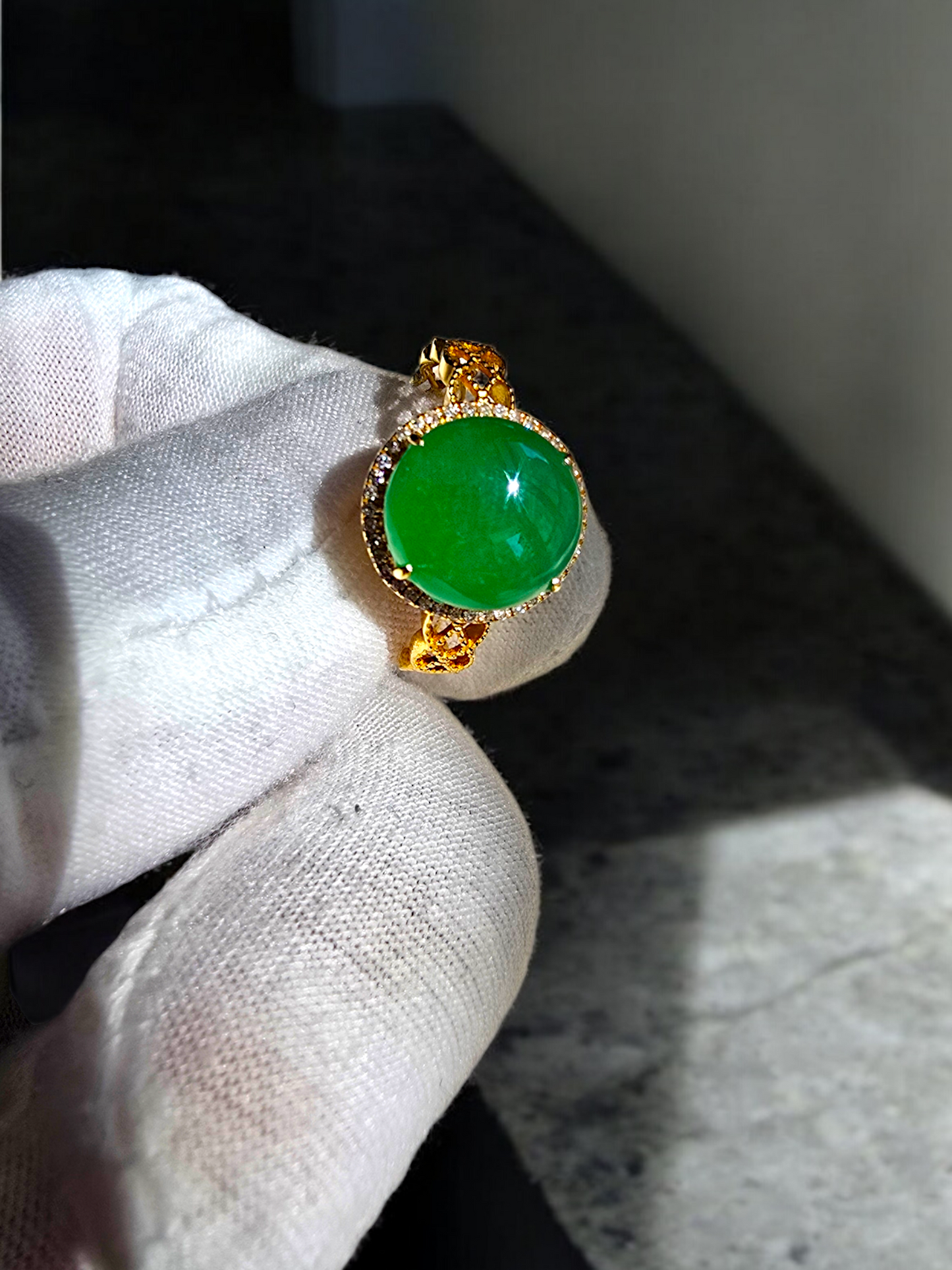 Materials: Vivid Green Burmese A-Jadeite Cabochon, Natural Round White Diamonds, 18K Solid Yellow Gold