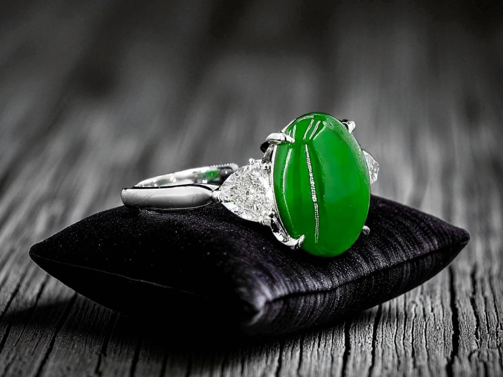 Flow Leaf Burmese A Jade Ring, with White Diamonds, and 18K White Gold - HKJSL Certified