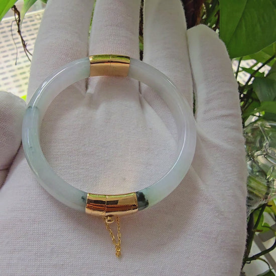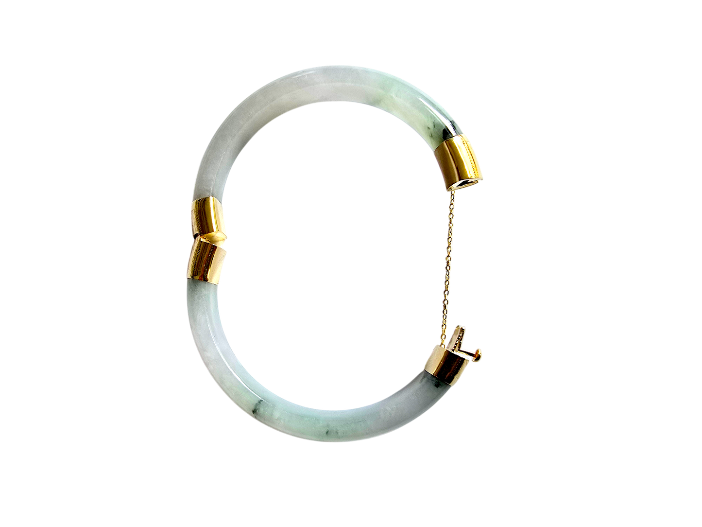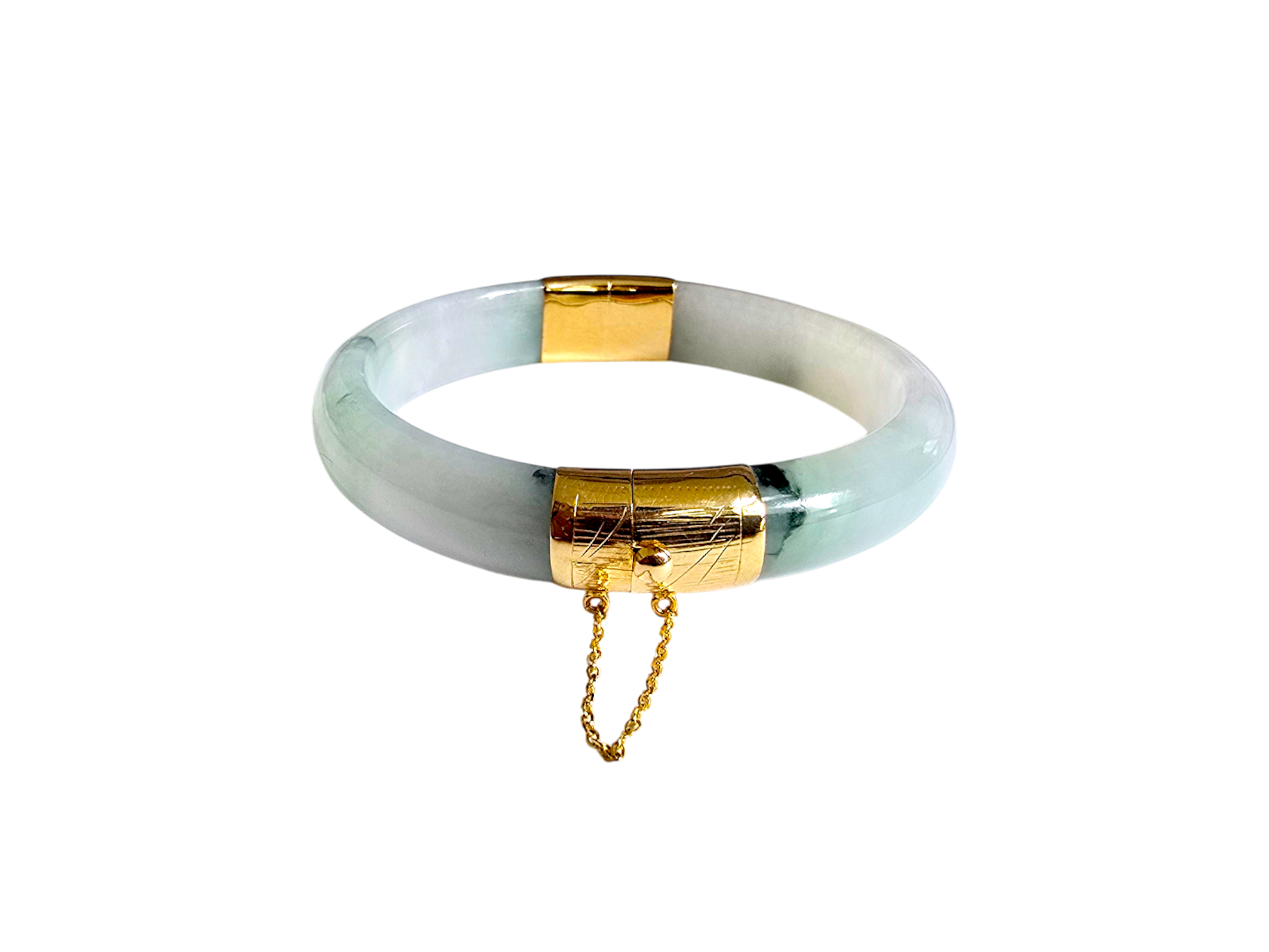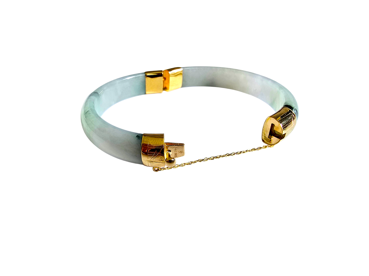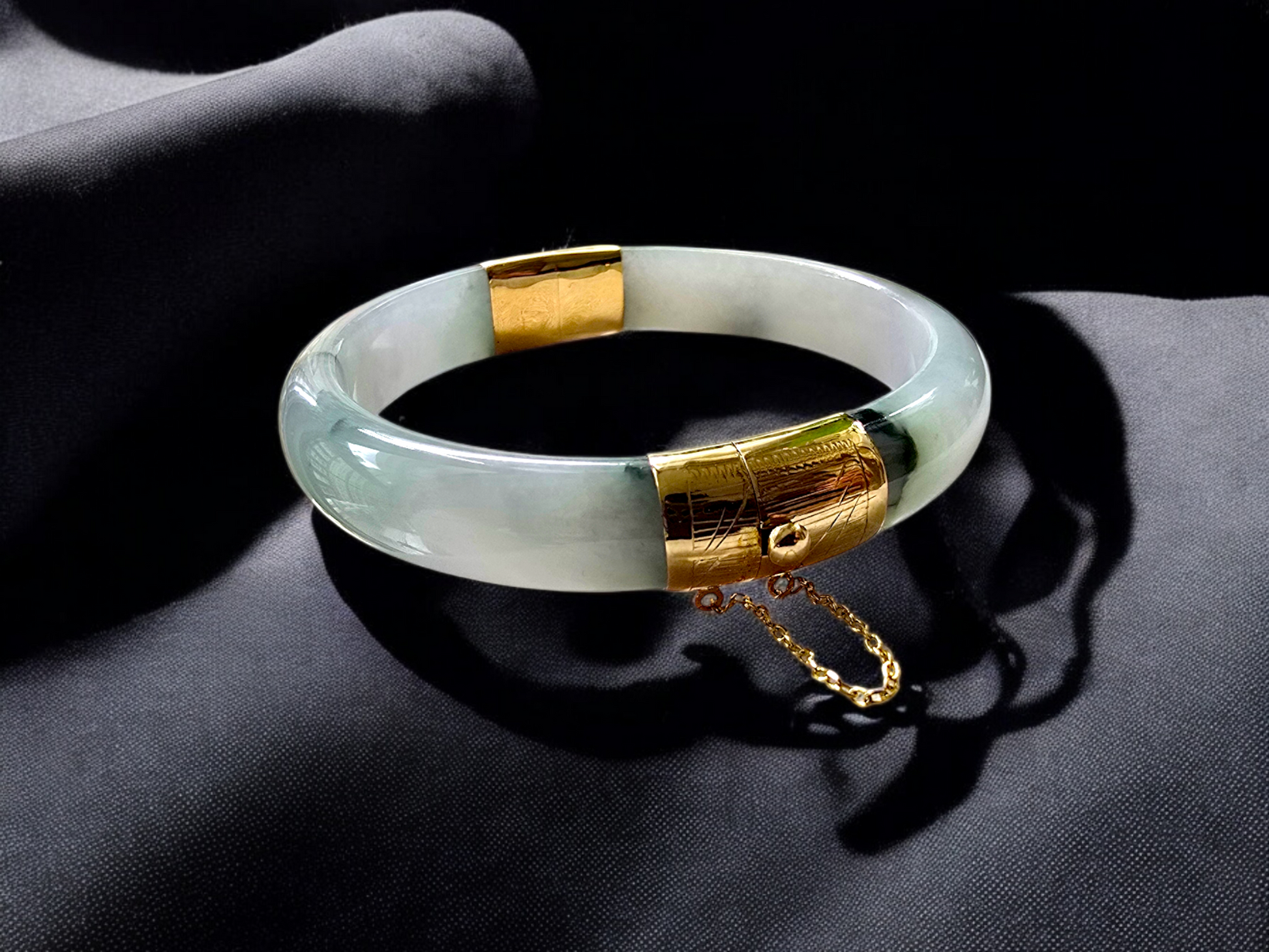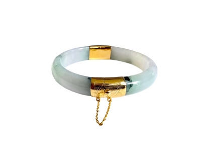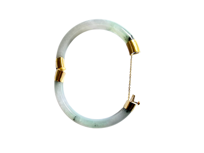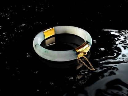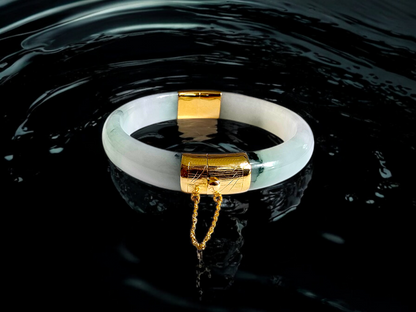 We picked Jadeite with superior optical properties, quality, translucency, hues and patterns. The 'Viceroy's Elliptical Burmese Jade Bangle Bracelet' uses an ergonomic ellipsis shape to fit one's wrists at an angle that accentuates the Yellow Gold and Jade Elements. We incorporate our signature Clasp with a chain for the best wearing experience.