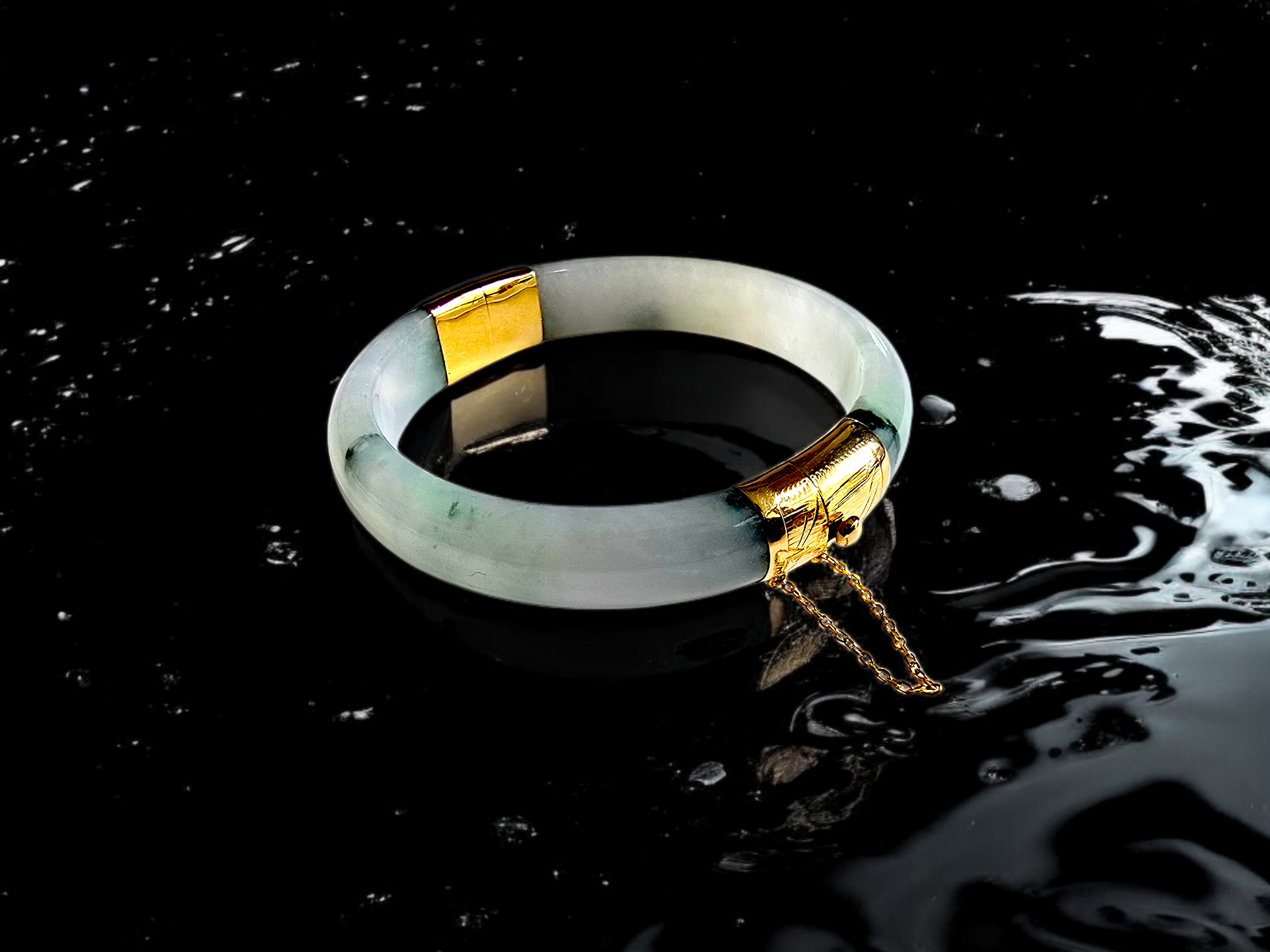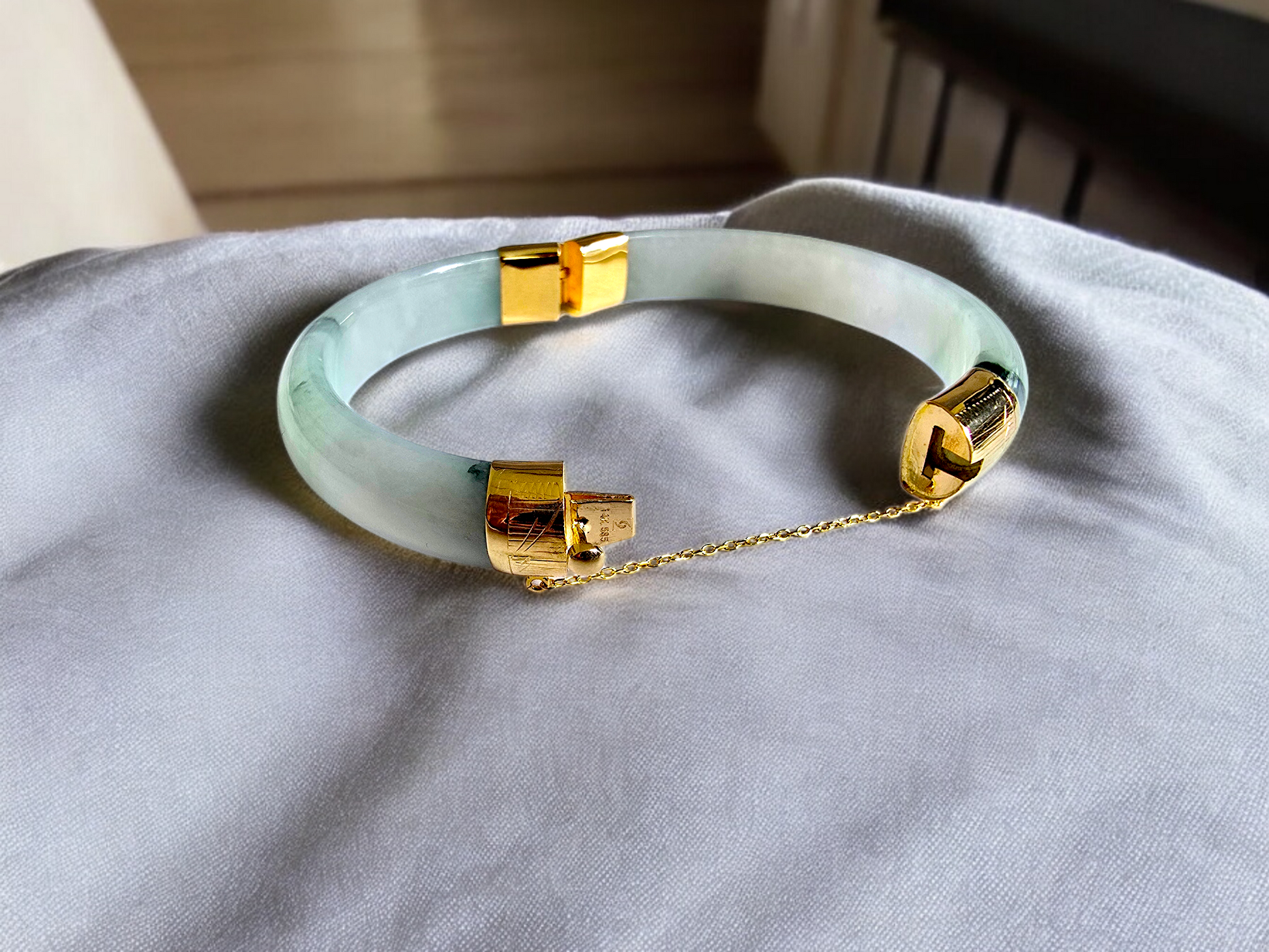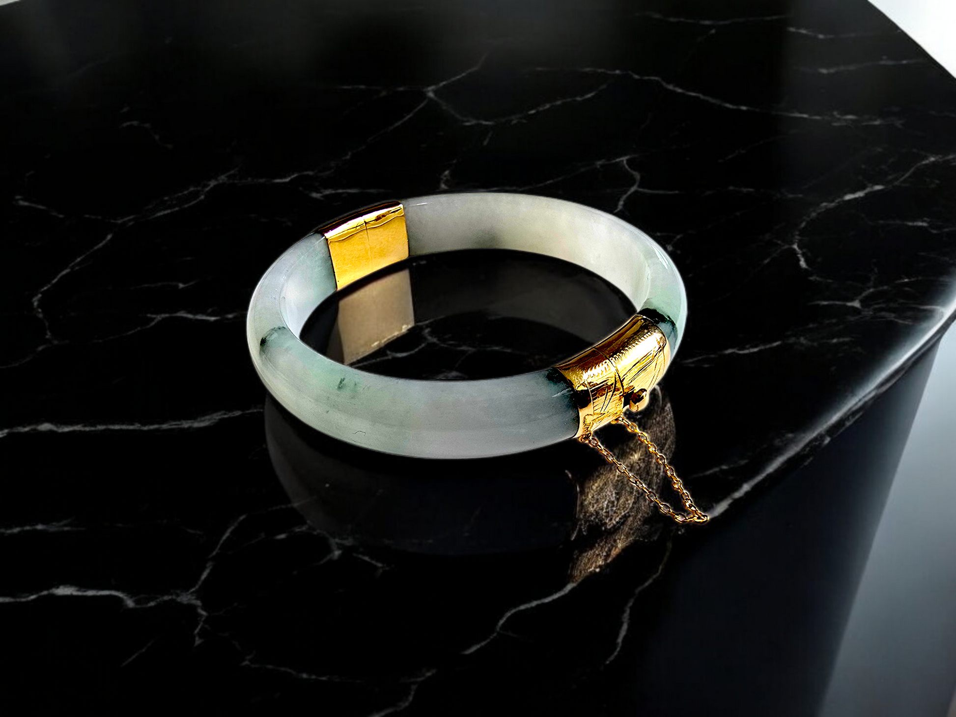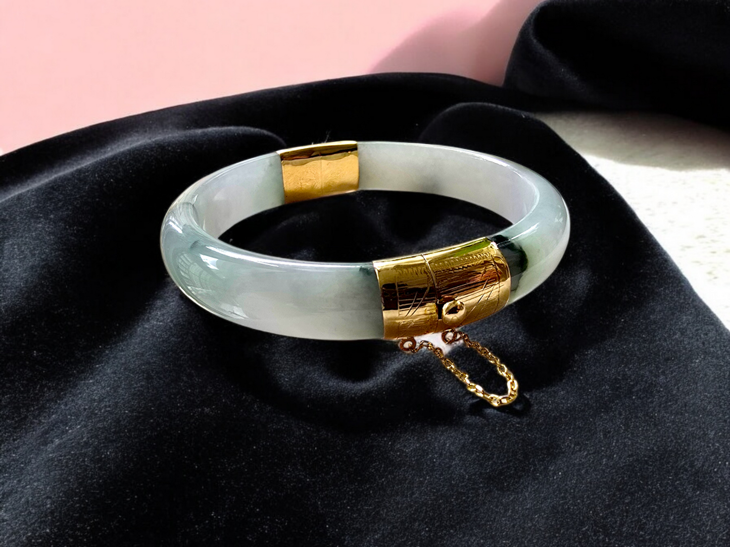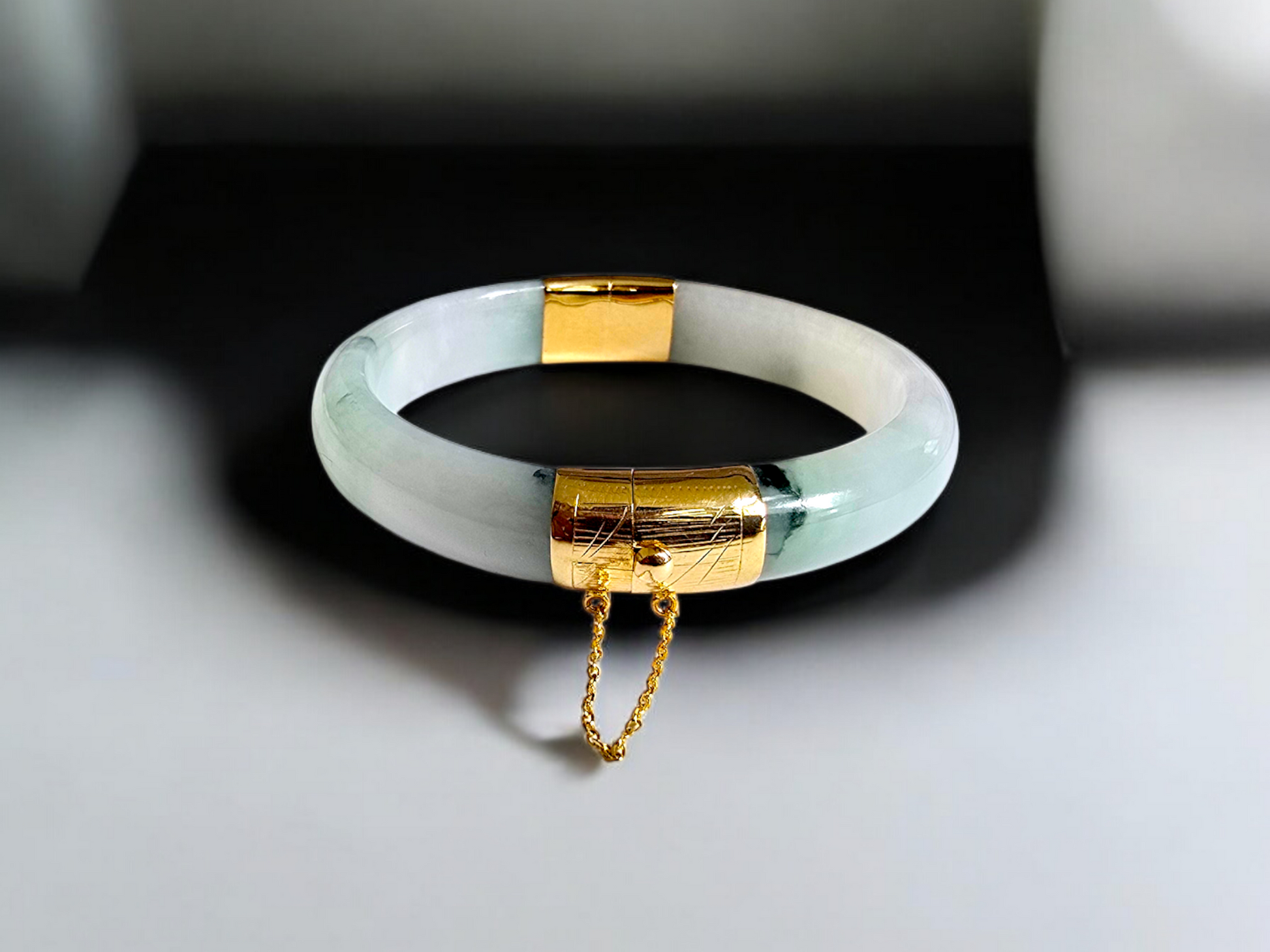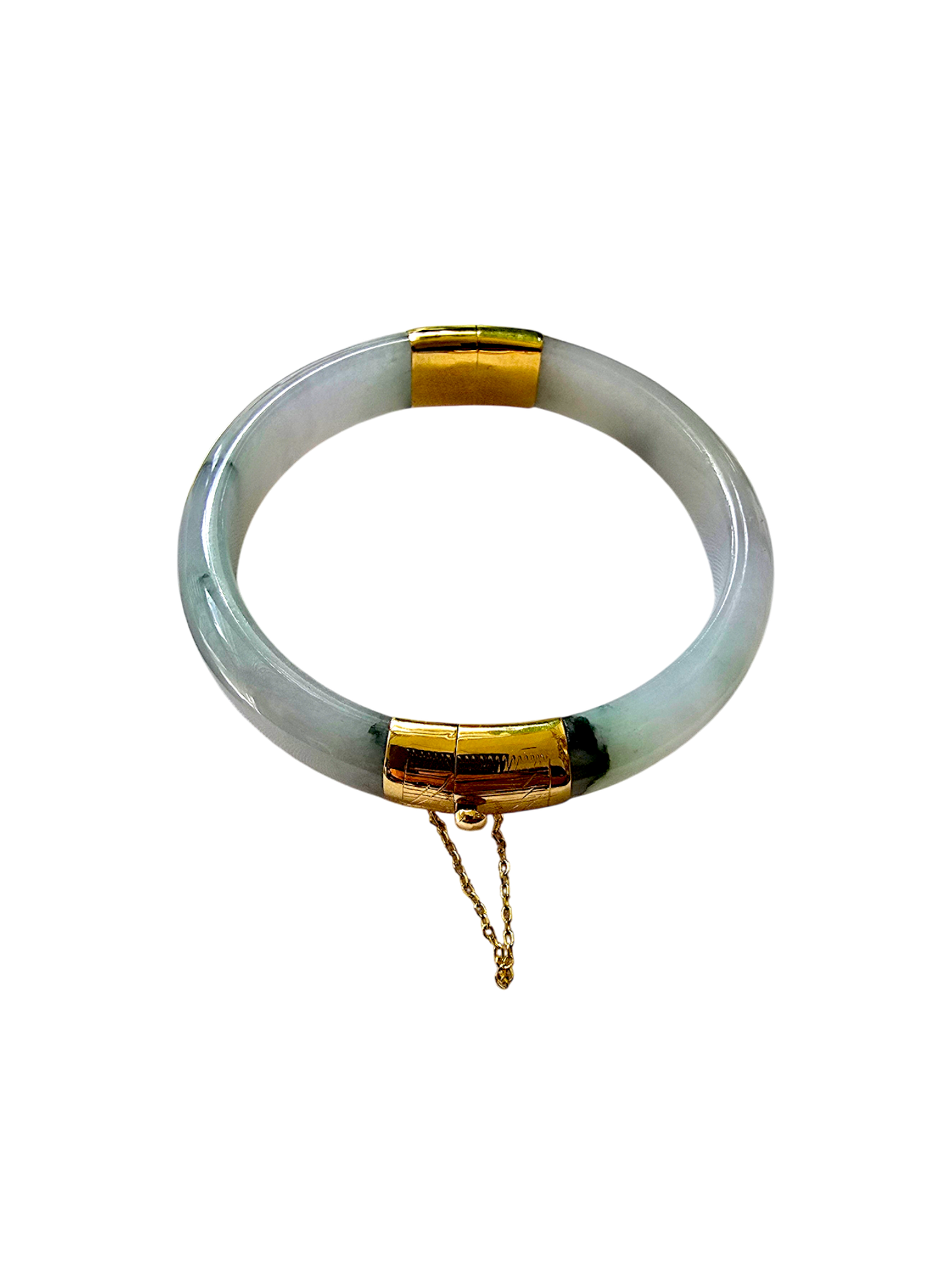 We picked Jadeite with superior optical properties, quality, translucency, hues and patterns. The 'Viceroy's Elliptical Burmese Jade Bangle Bracelet' uses an ergonomic ellipsis shape to fit one's wrists at an angle that accentuates the Yellow Gold and Jade Elements. We incorporate our signature Clasp with a chain for the best wearing experience.