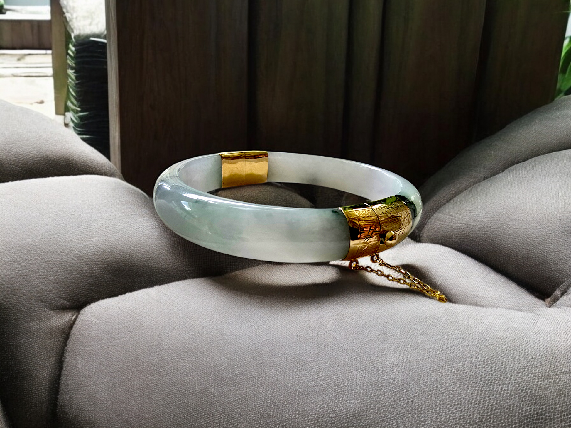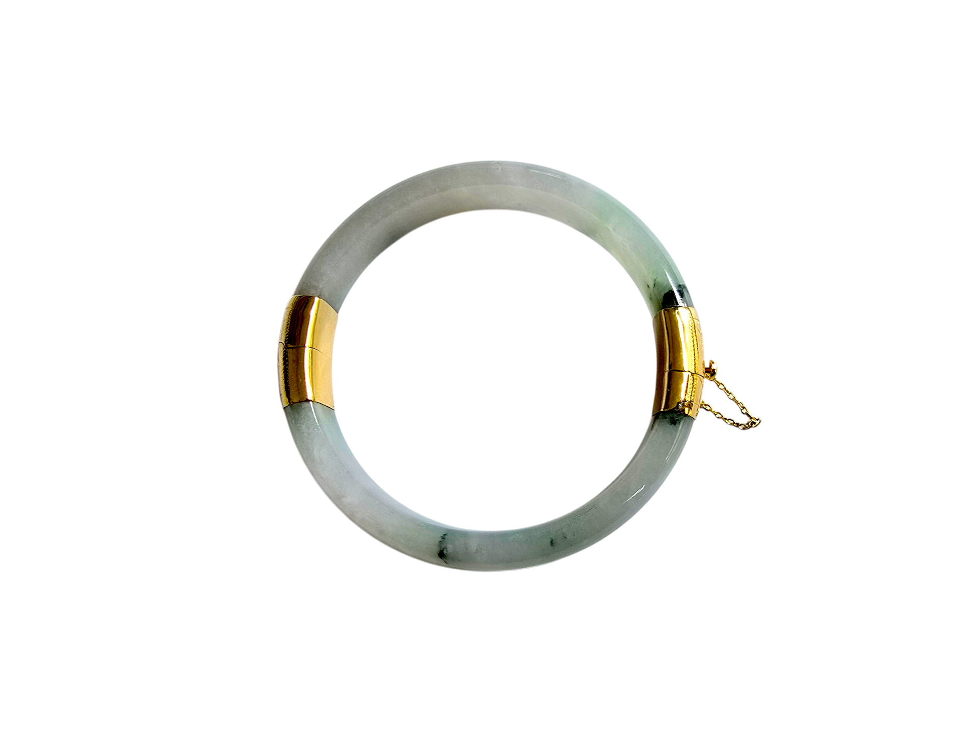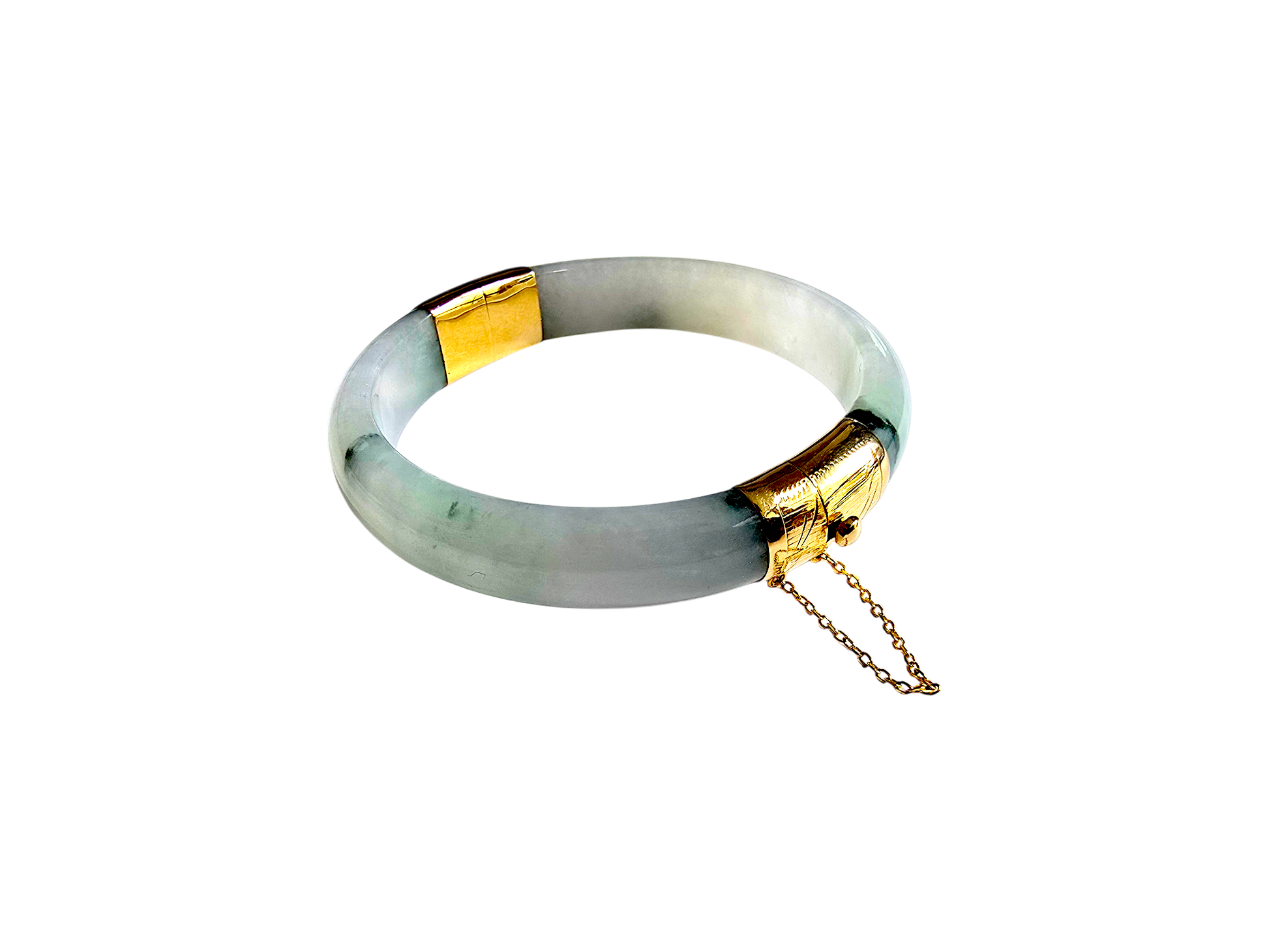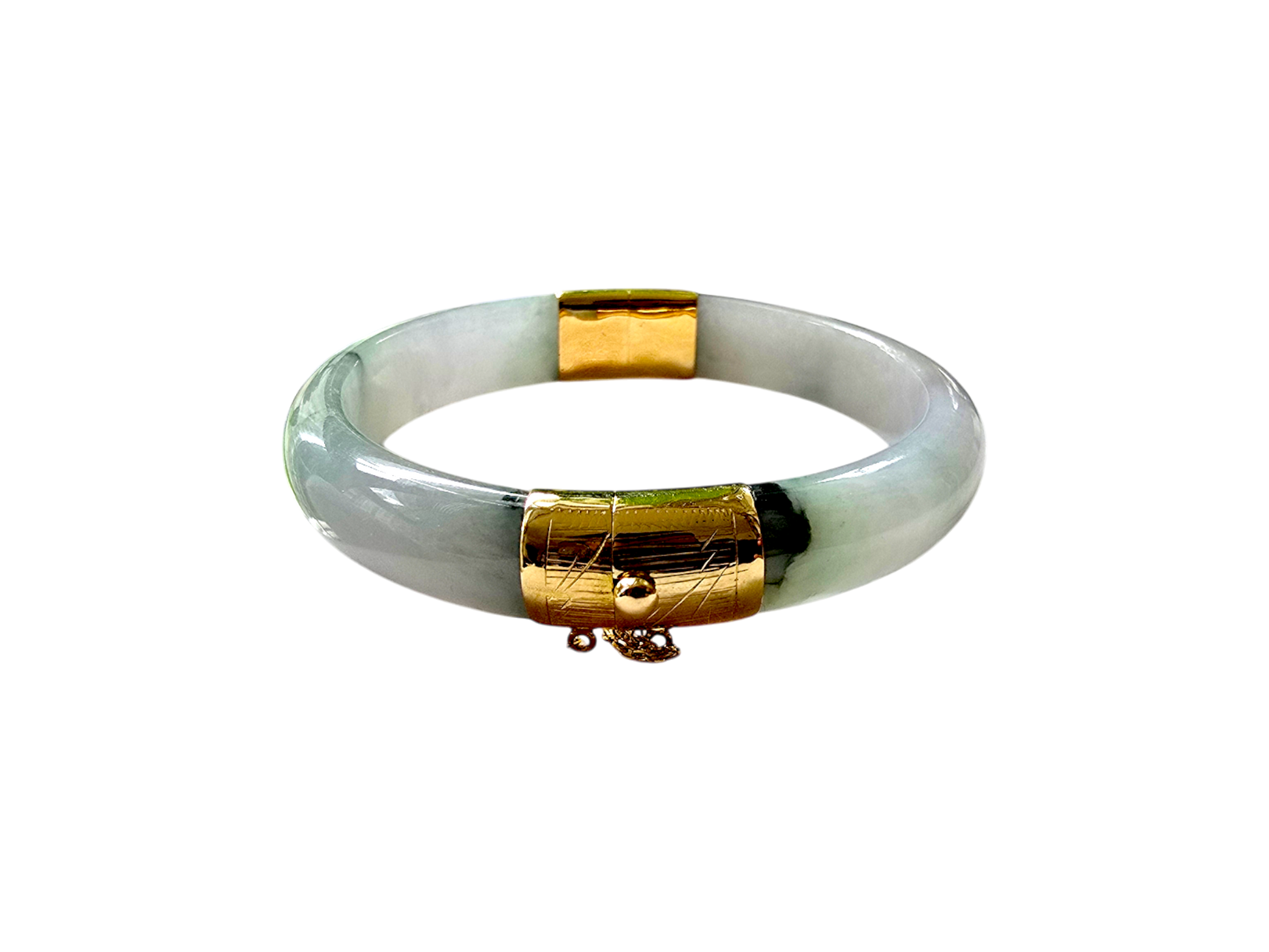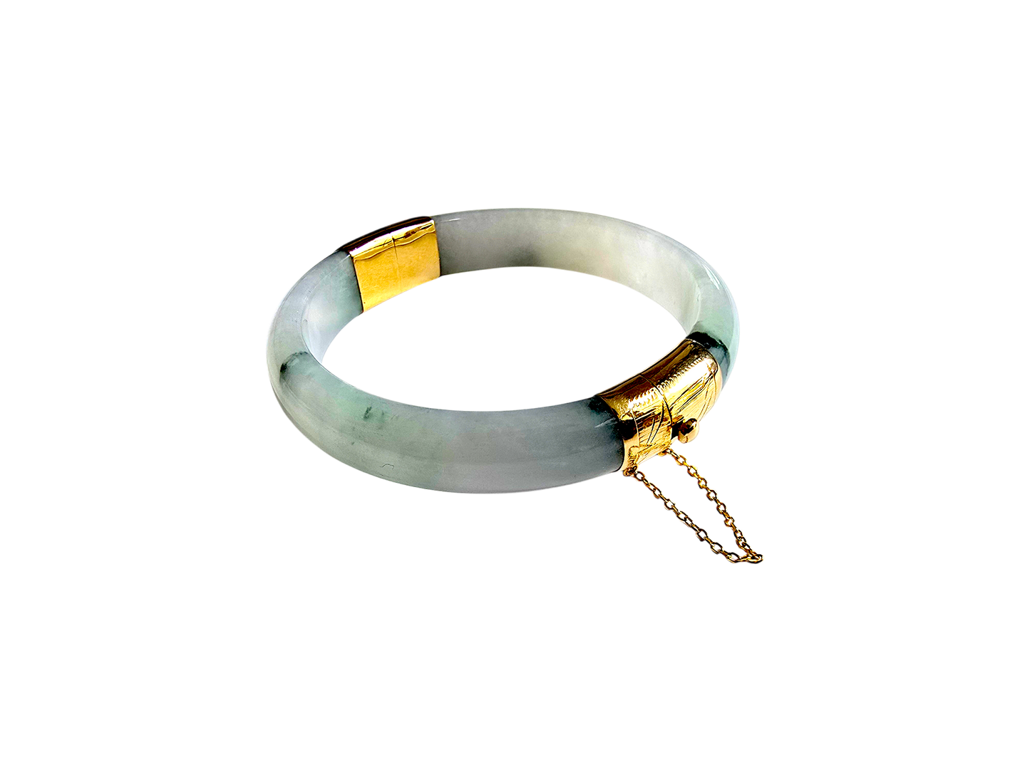 We picked Jadeite with superior optical properties, quality, translucency, hues and patterns. The 'Viceroy's Elliptical Burmese Jade Bangle Bracelet' uses an ergonomic ellipsis shape to fit one's wrists at an angle that accentuates the Yellow Gold and Jade Elements. We incorporate our signature Clasp with a chain for the best wearing experience.