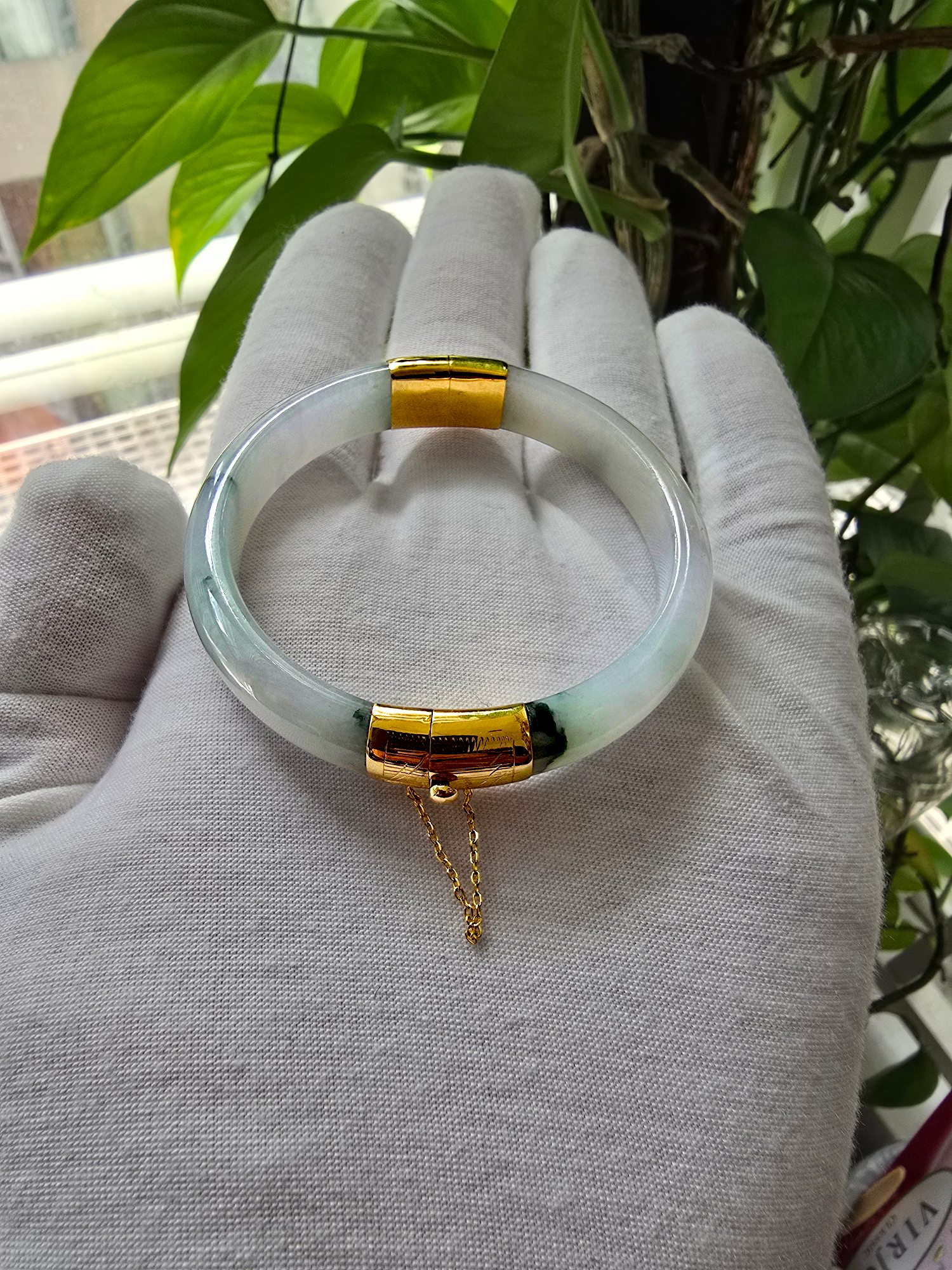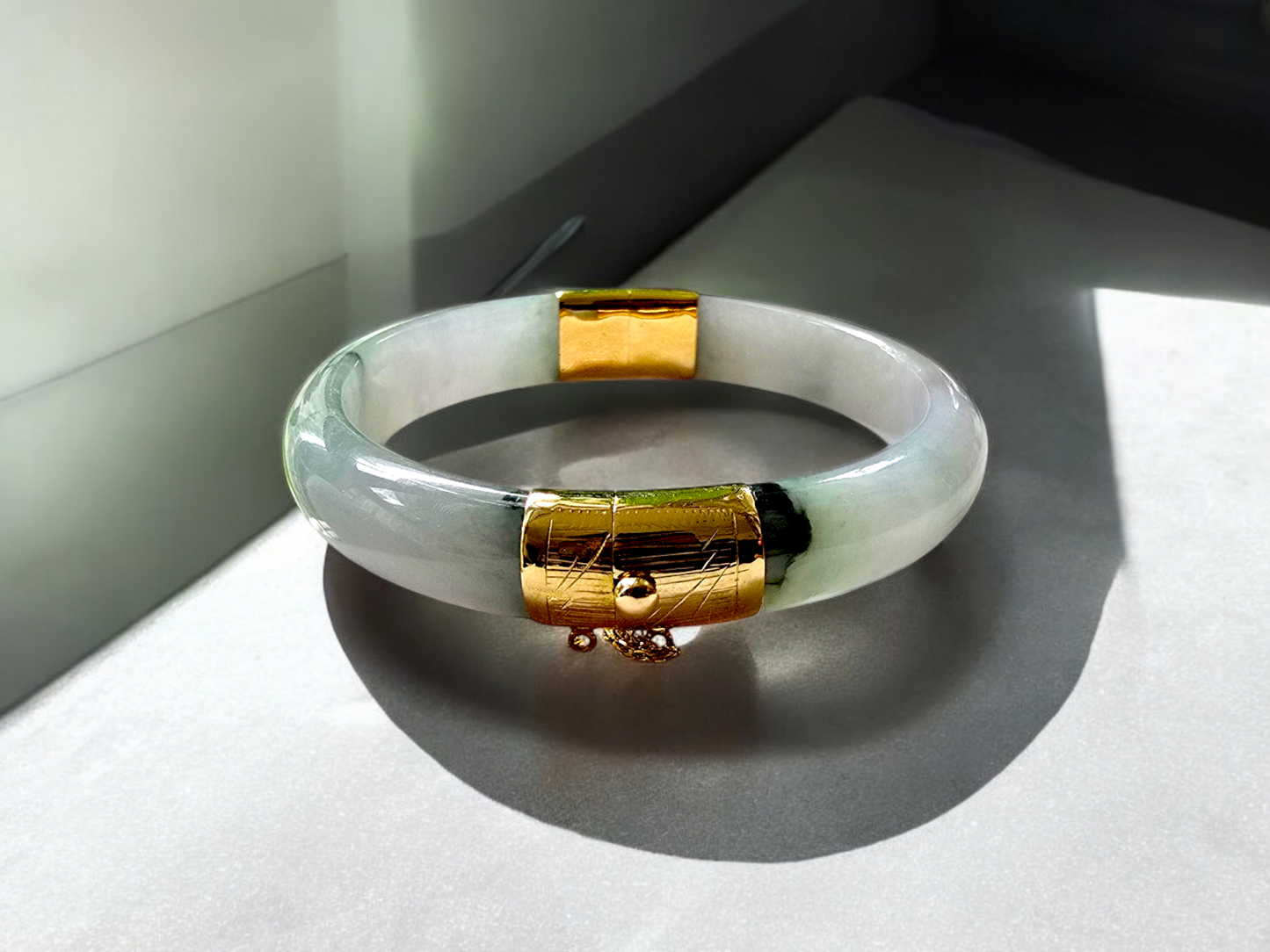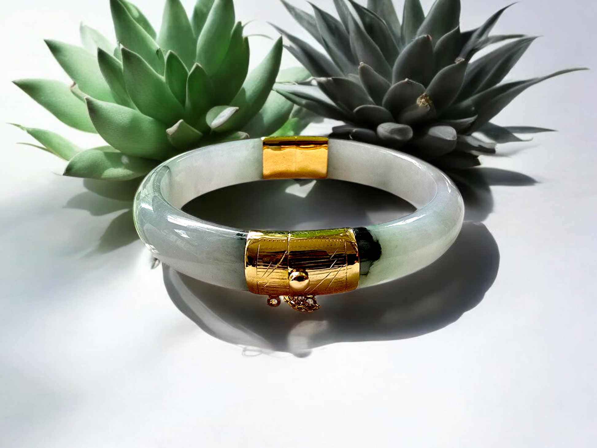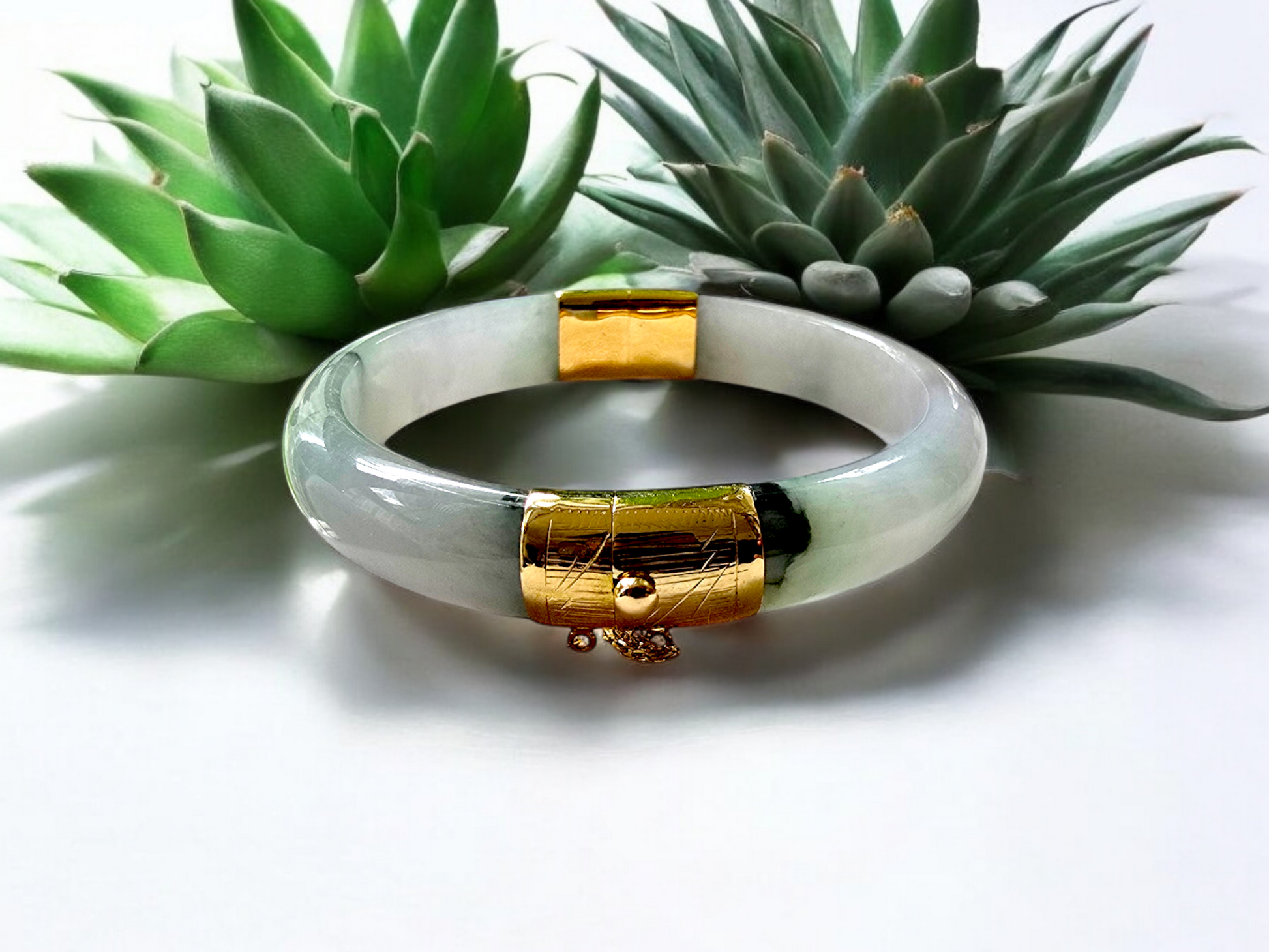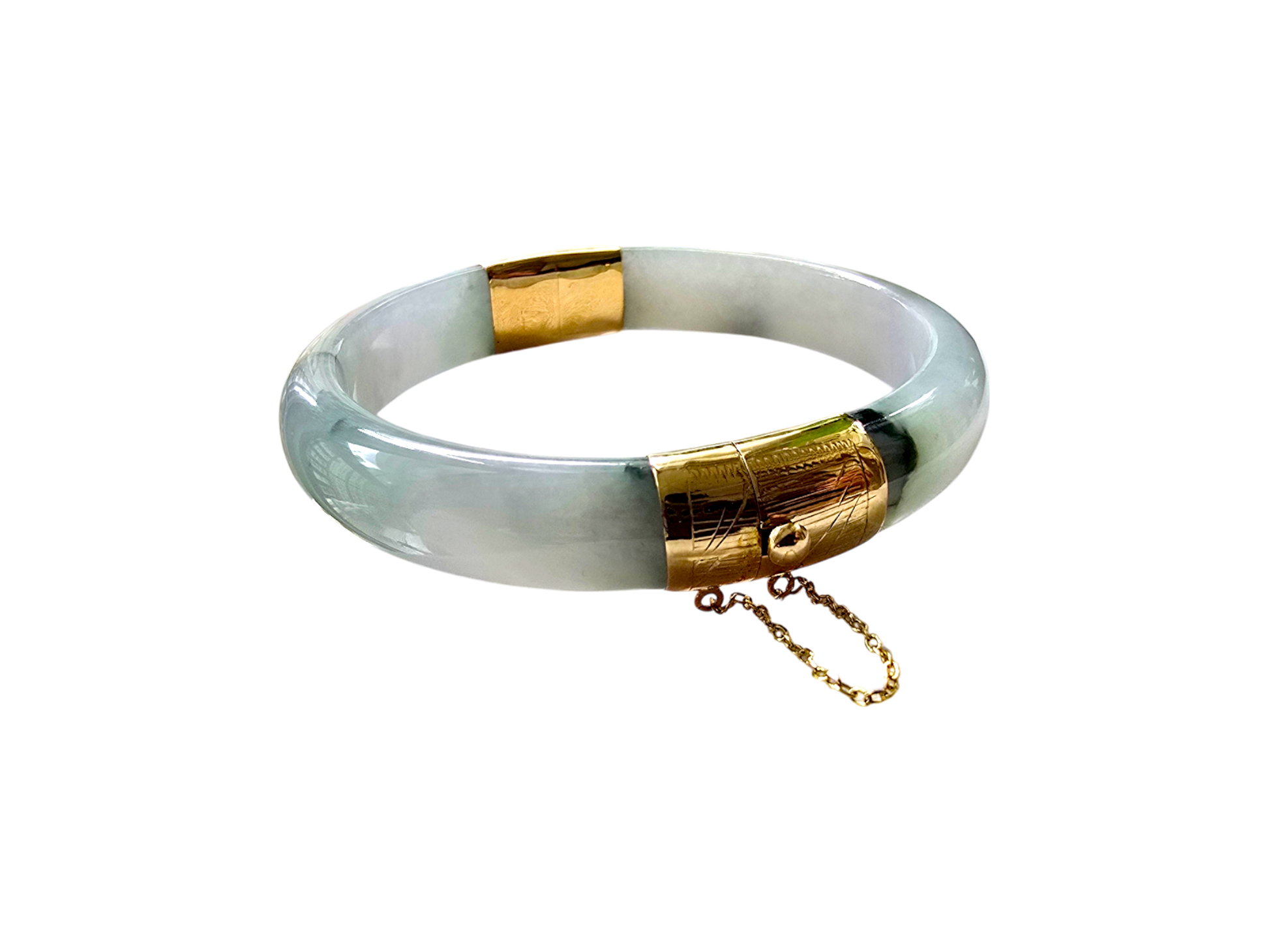 We picked Jadeite with superior optical properties, quality, translucency, hues and patterns. The 'Viceroy's Elliptical Burmese Jade Bangle Bracelet' uses an ergonomic ellipsis shape to fit one's wrists at an angle that accentuates the Yellow Gold and Jade Elements. We incorporate our signature Clasp with a chain for the best wearing experience.