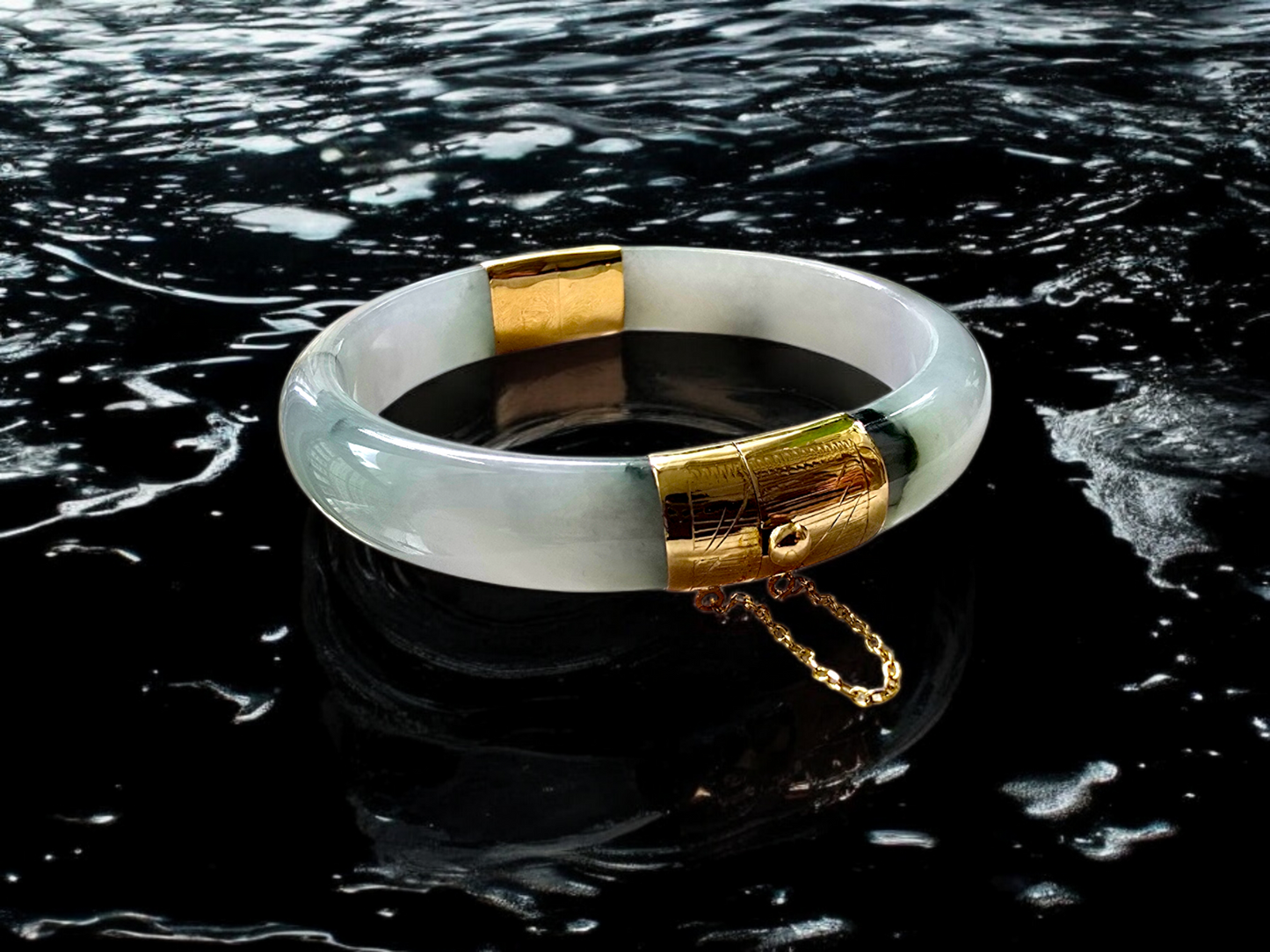 Using the best Handpicked untreated natural A-Jadeite from Burma, we created an authoritative and classy statement bangle bracelet. This unique block of Jadeite has deep Green marbling, patches and splashes. Interlaced with Imperial Green sections and streaks, the optical effect is stunning.
