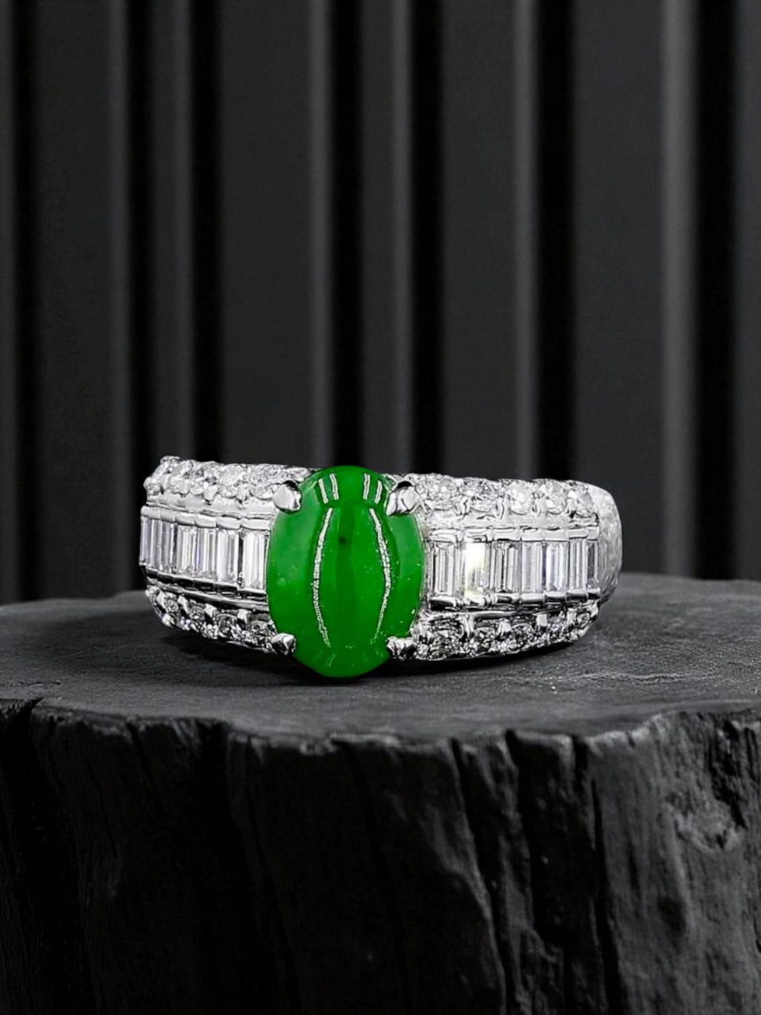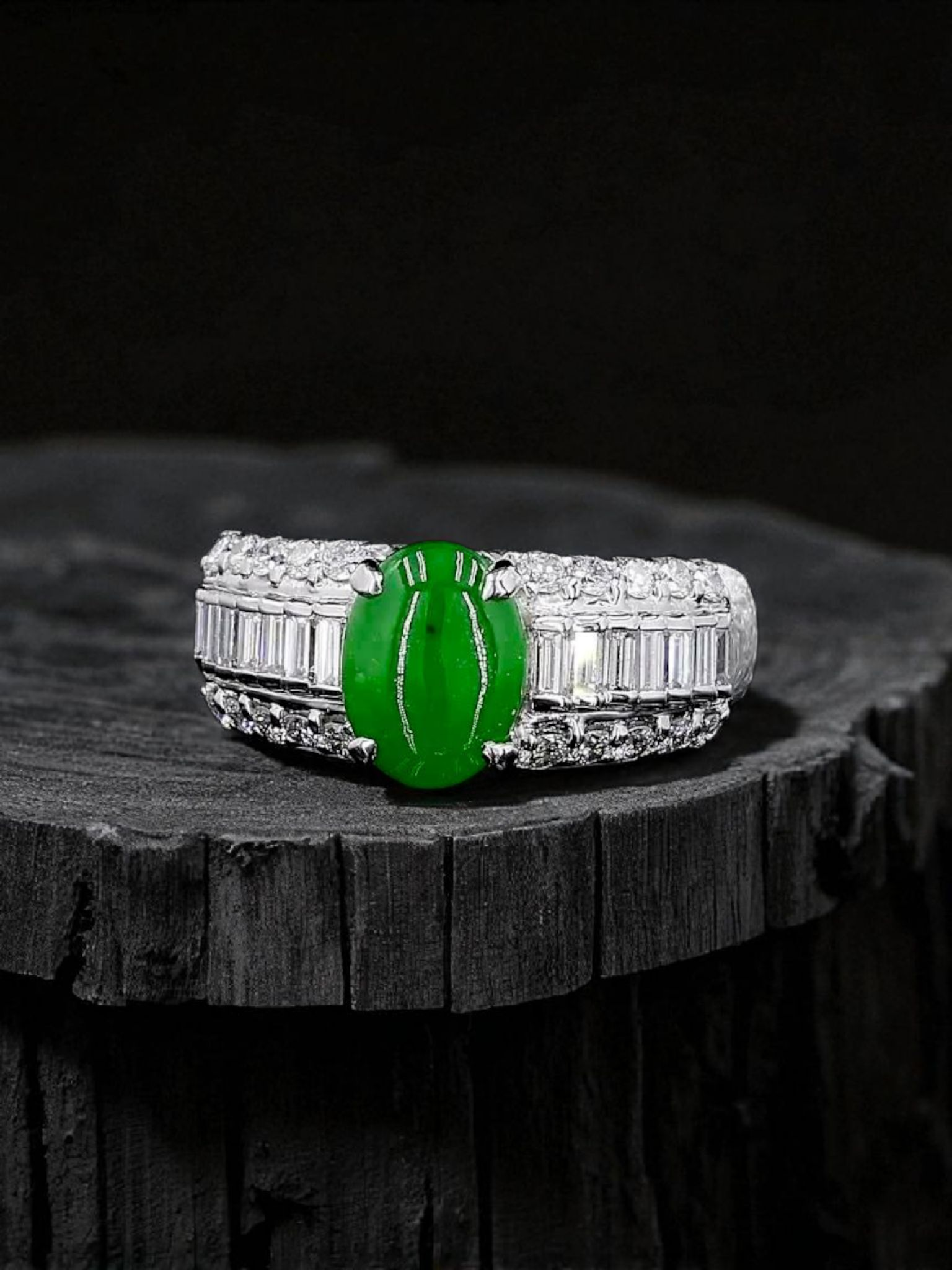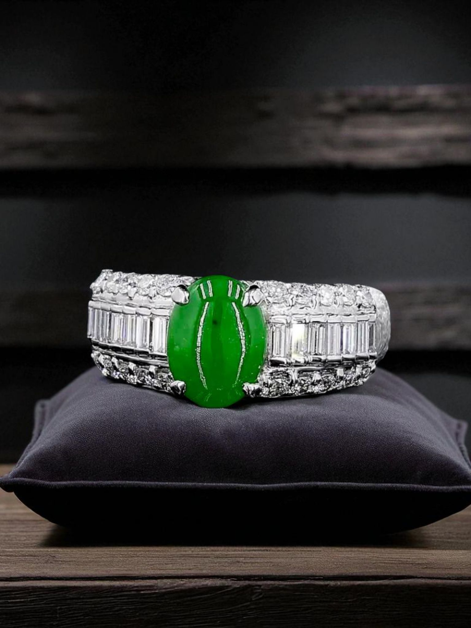 Akasaka MADE IN JAPAN Intense Imperial Green Burmese A Jade Statement Ring, with 0.95 cts. Natural Round Brilliant and Tapered Baguette shaped White VS Diamonds, and 12.50g Platinum 900 - HKJSL and CGL Certified
