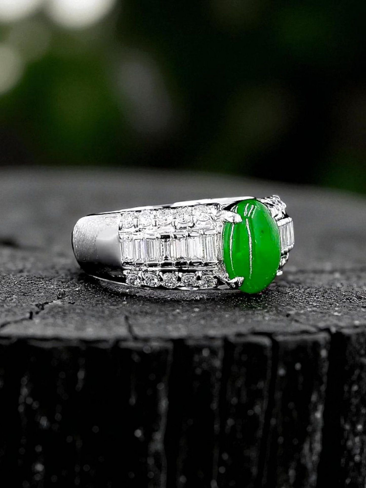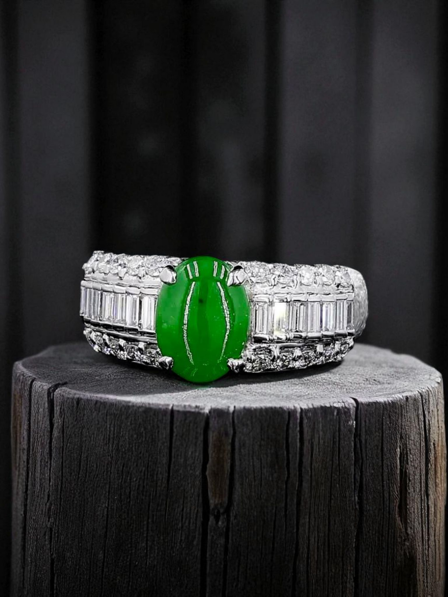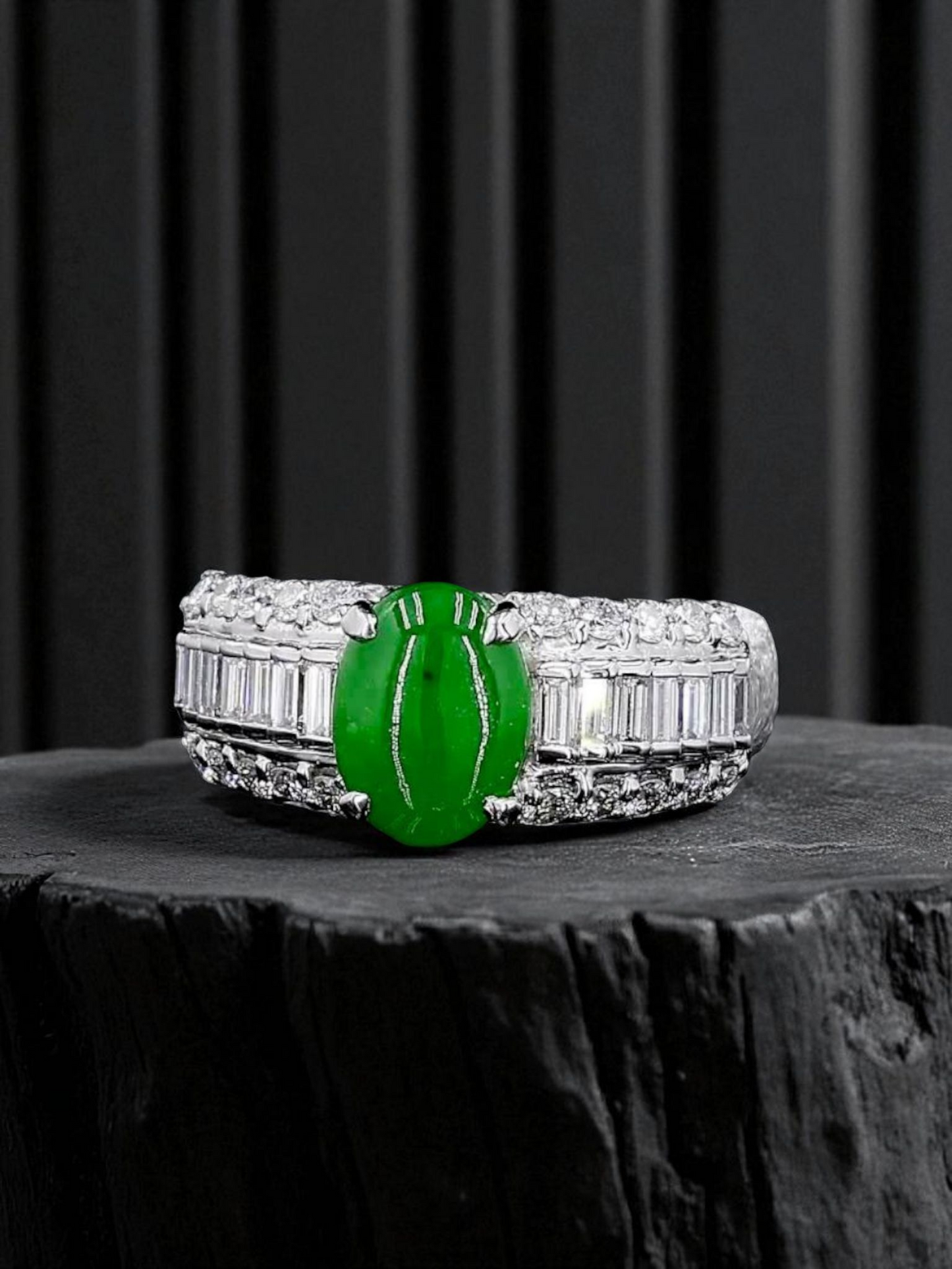 Akasaka MADE IN JAPAN Intense Imperial Green Burmese A Jade Statement Ring, with 0.95 cts. Natural Round Brilliant and Tapered Baguette shaped White VS Diamonds, and 12.50g Platinum 900 - HKJSL and CGL Certified