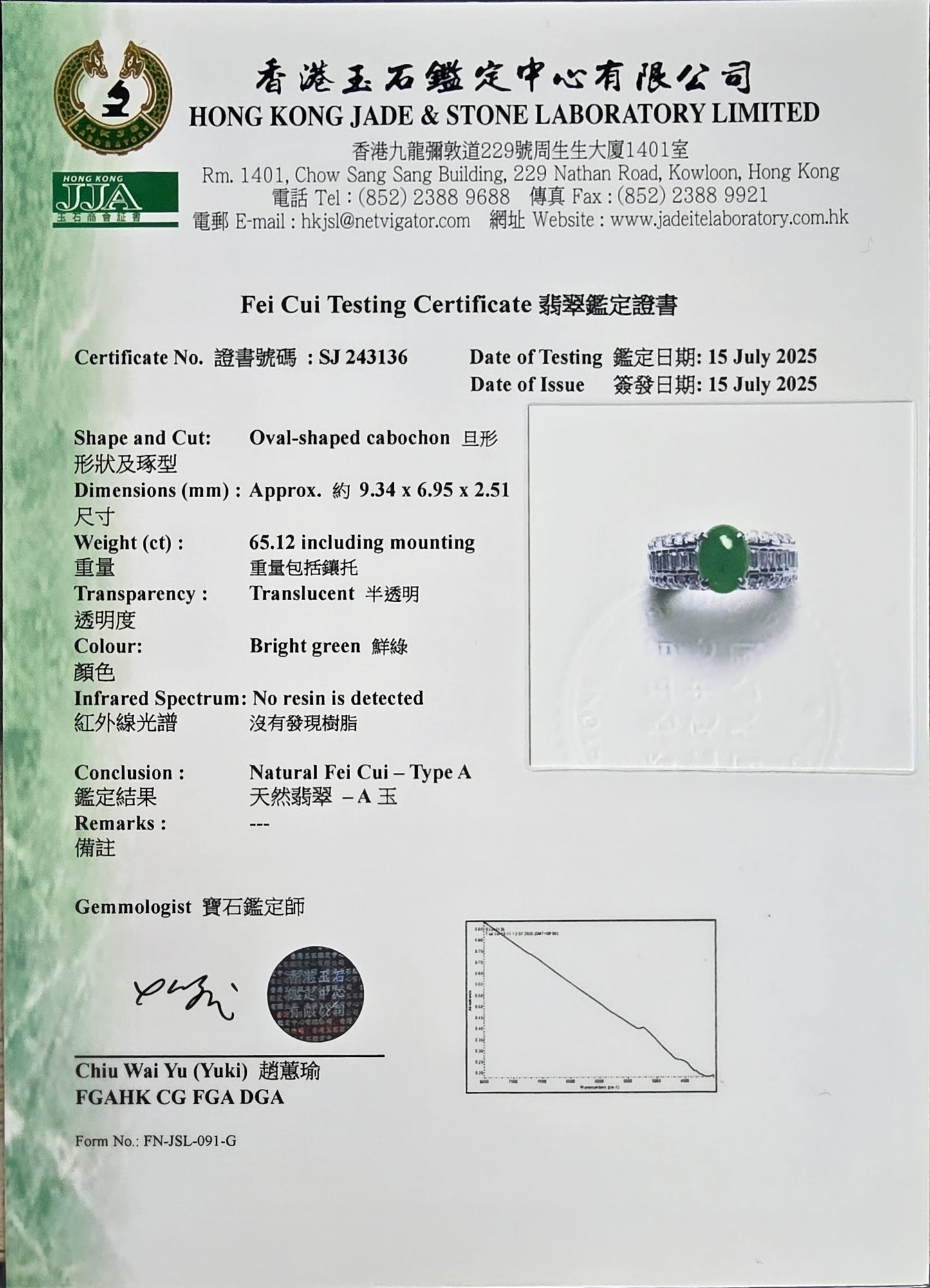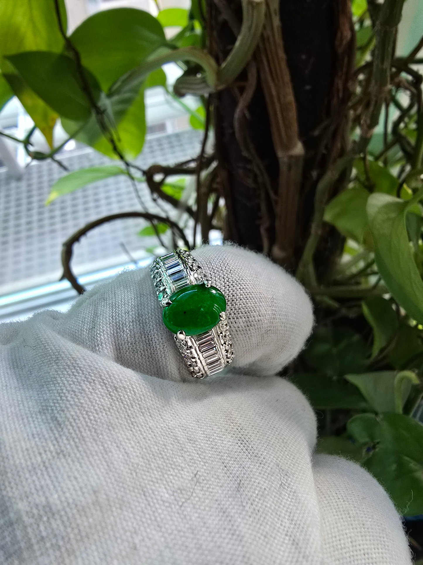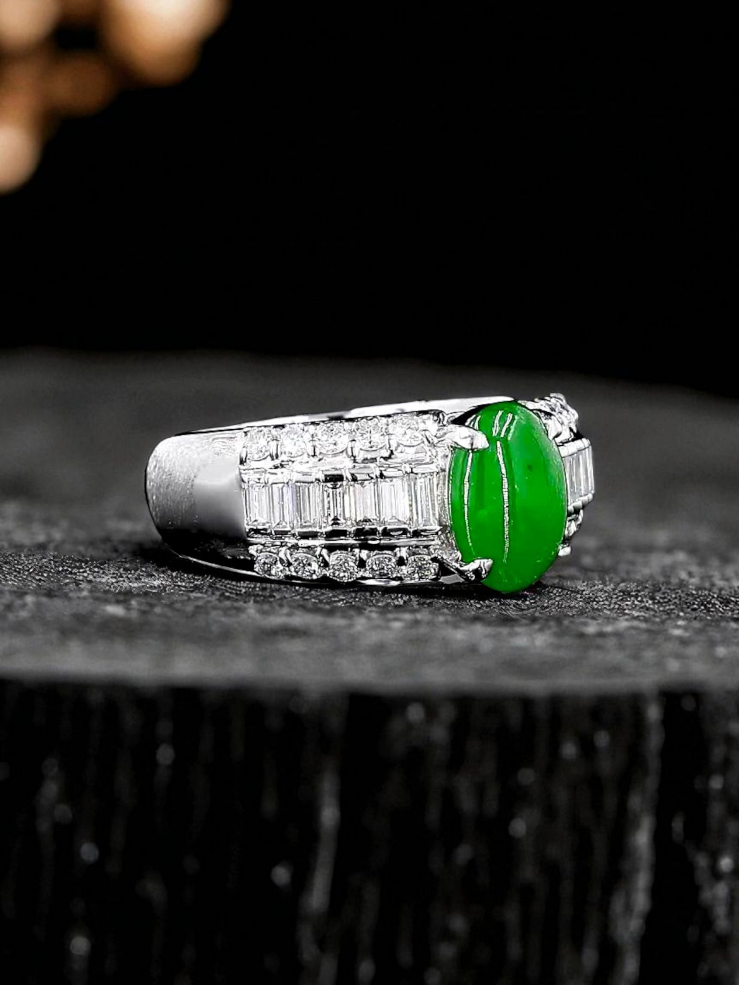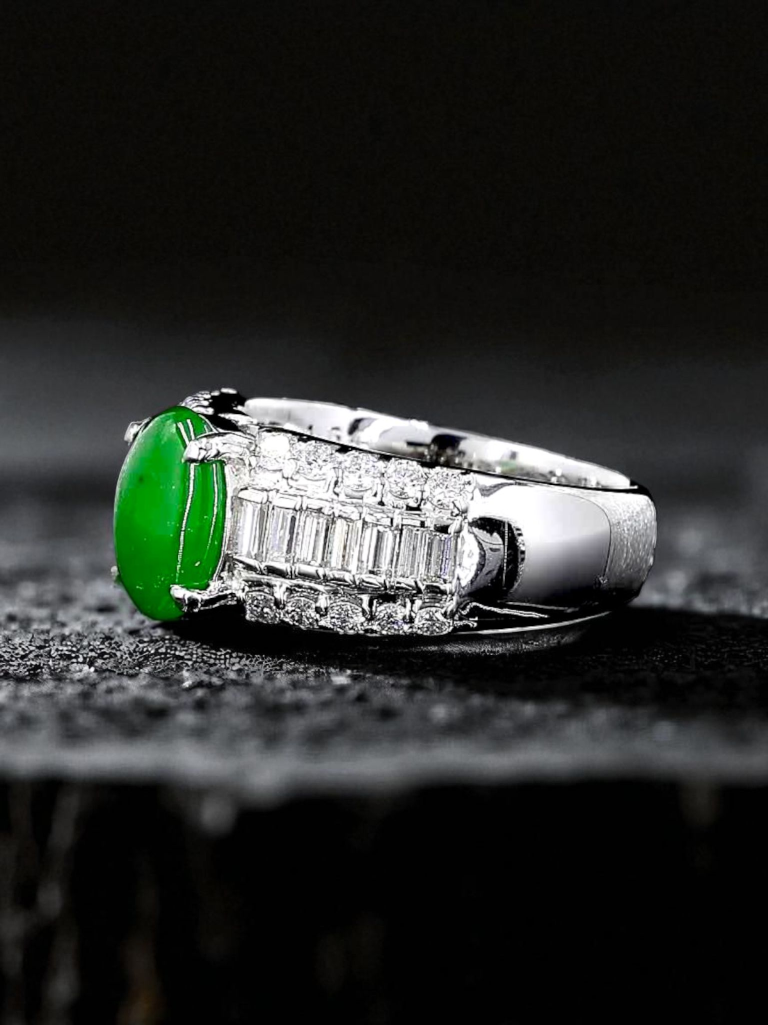 Traditionally, the Japanese revere Platinum as the most precious metal. The setting of the Jadeite Cabochon with the side Diamonds creates a sensational sparkle and reinforces the light performance of the ring.