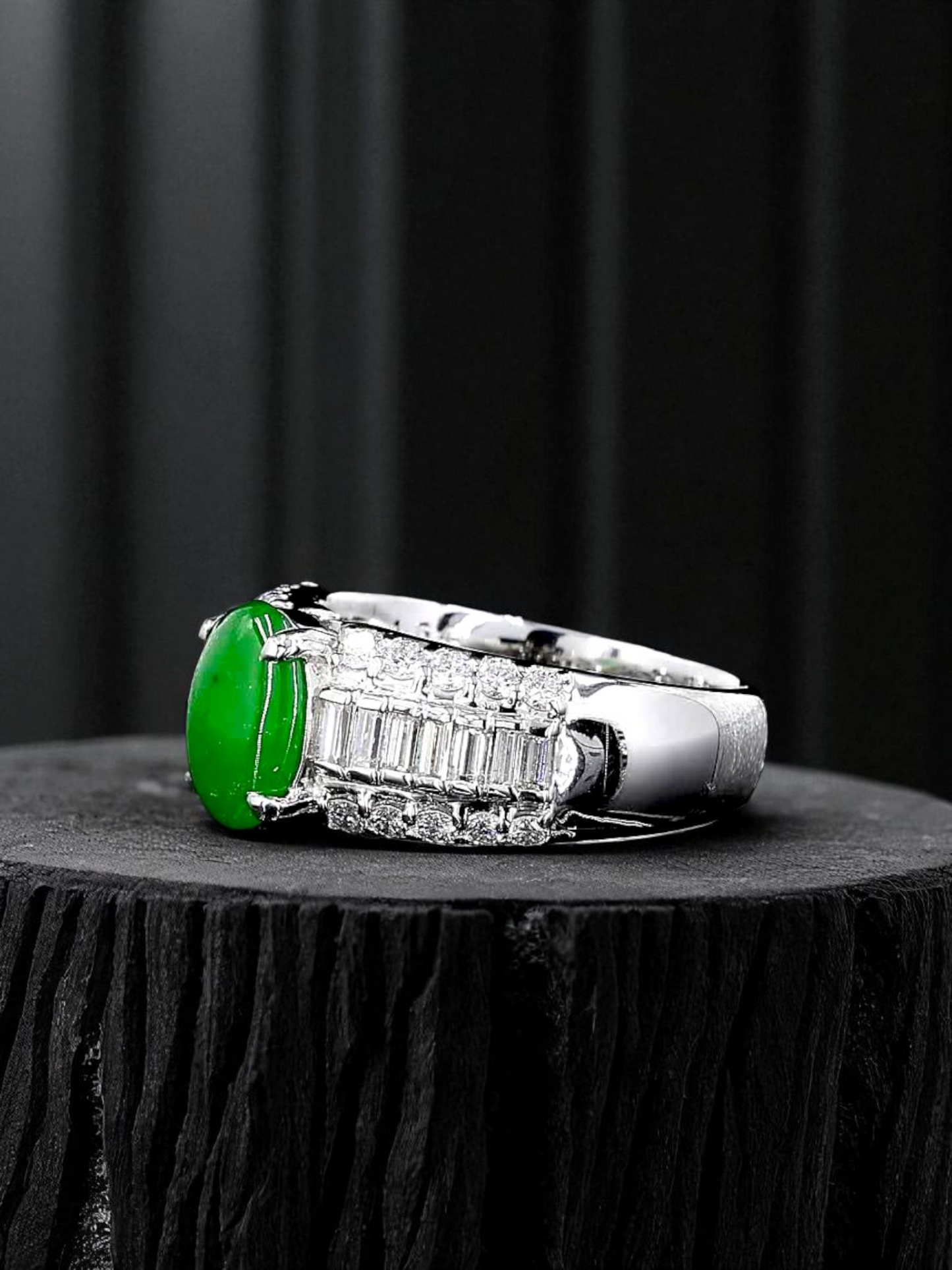 No two Jadeite stones are ever created the same by nature, perfect for something truly exclusive. A great addition to any investment collection. The design features and angles create a canvas to showcase the gemstone.