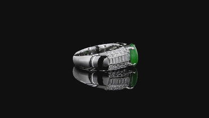 One of FYORO's finest creations; this Ring uses a completely natural Vivid Intense Imperial Bright Green Burmese A-Jadeite, with no treatments or enhancements, as the show-stopping center stone. The natural Round Brilliant and Tapered Baguette White Diamonds' side stones and a four-prong setting with Platinum 900 creates a stunningly harmonious piece that accentuates the heirloom-esque center stone.