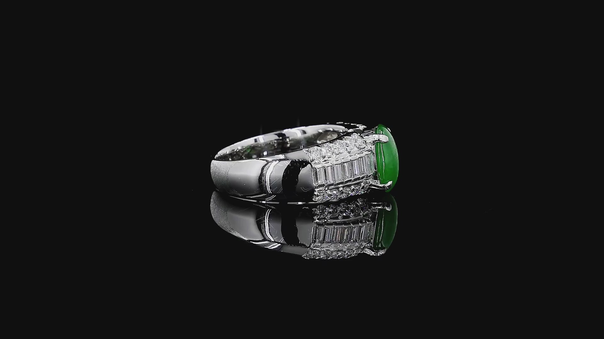 Materials: Vivid Imperial Bright Green Burmese A-Jadeite Cabochon, Natural Round Brilliant and Tapered Baguette White VS Diamonds (0.95 cts.), Platinum 900