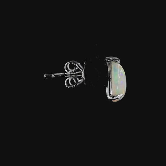 Experience the shimmering fire of natural Australian White Opals with these elegant and simple stud earrings. Made by handpicking a perfectly matched pair of 9 x 6 mm pear shaped opals, and creating a simple three-pronged setting to allow the natural fiery optics of the Opals to shine. We use solid 14K White Gold to match the elegance and charm. With a white palette and the most desirable Red flashes, accompanied by luminous green and blue, the pattern and scintillation is superb.