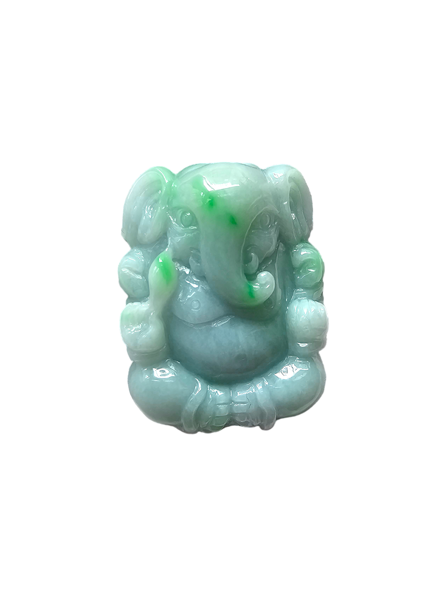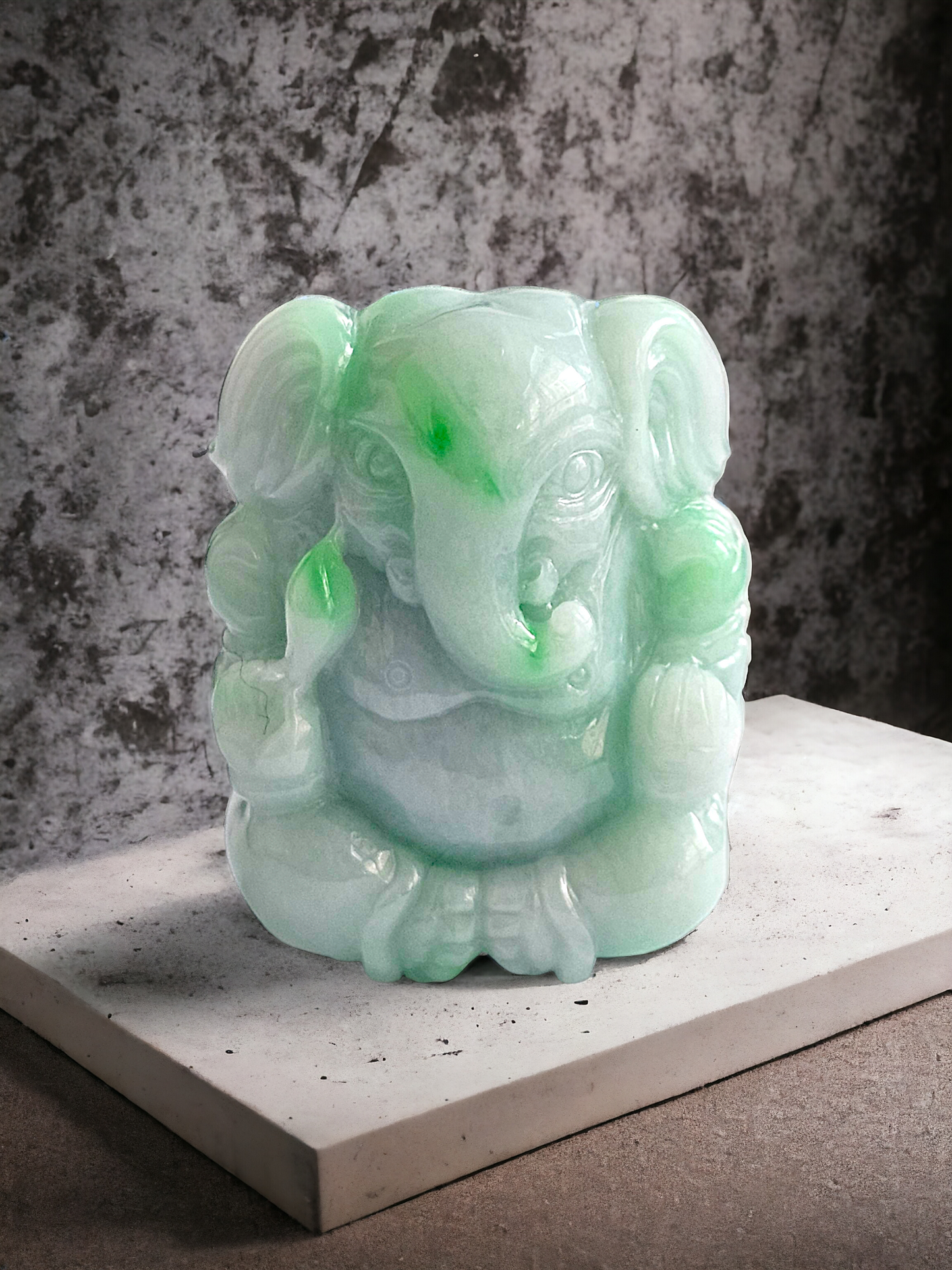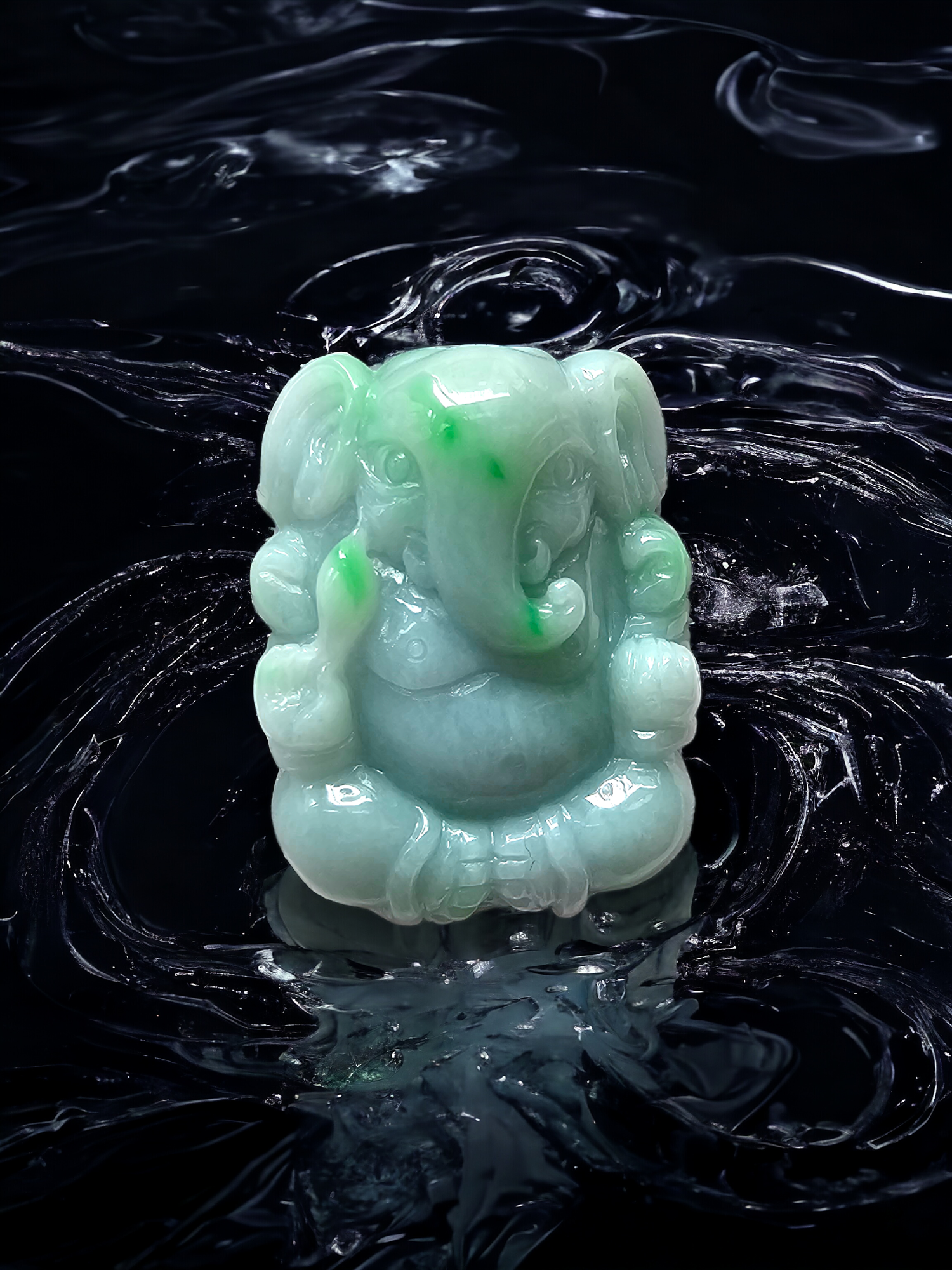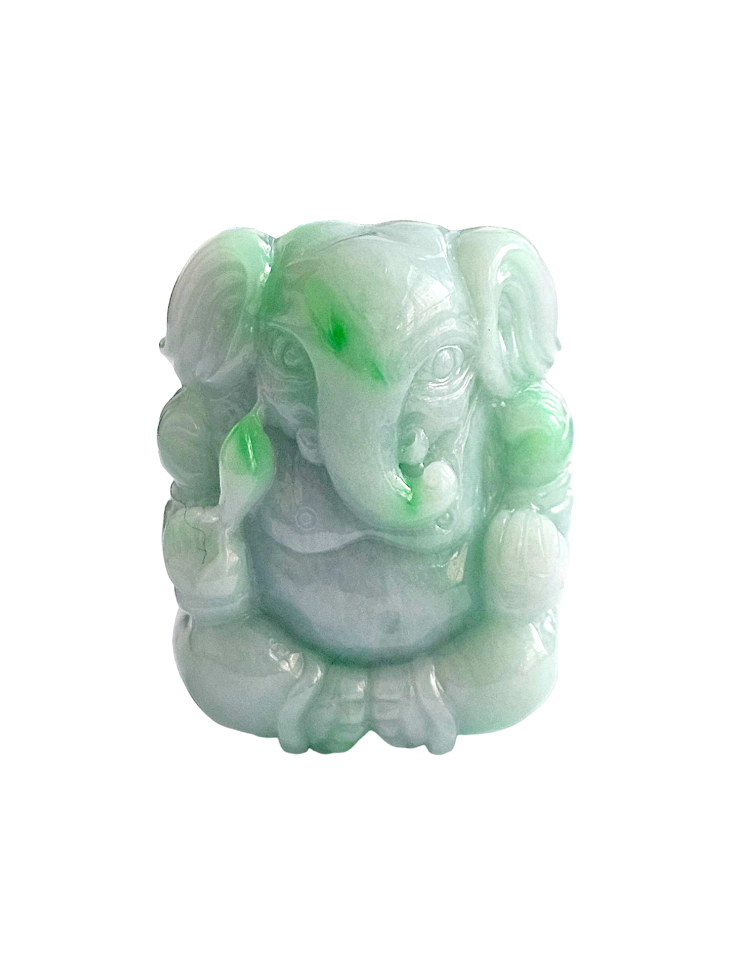 我們的「催化劑甘尼薩」是印度教新開端的神祇,由精選最稀有的緬甸 A 級翡翠打造而成,具有最佳的半透明度、色調、色調和綠色飽和度。我們使用自然且最令人嚮往的帝王綠色條紋來強調象頭神甘納帕蒂勳爵的某些元素。象徵新的開始、財富、智慧和繁榮。