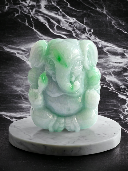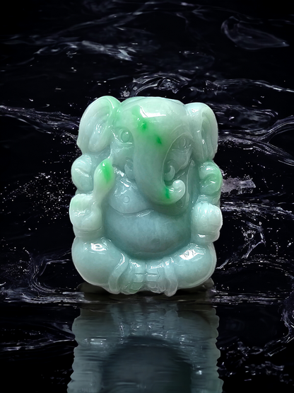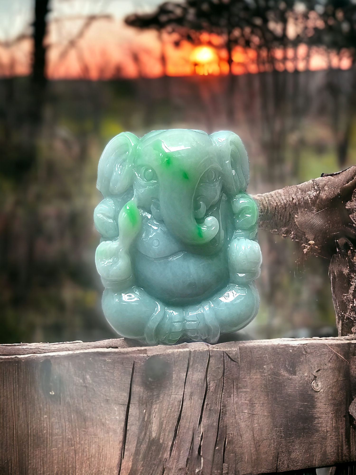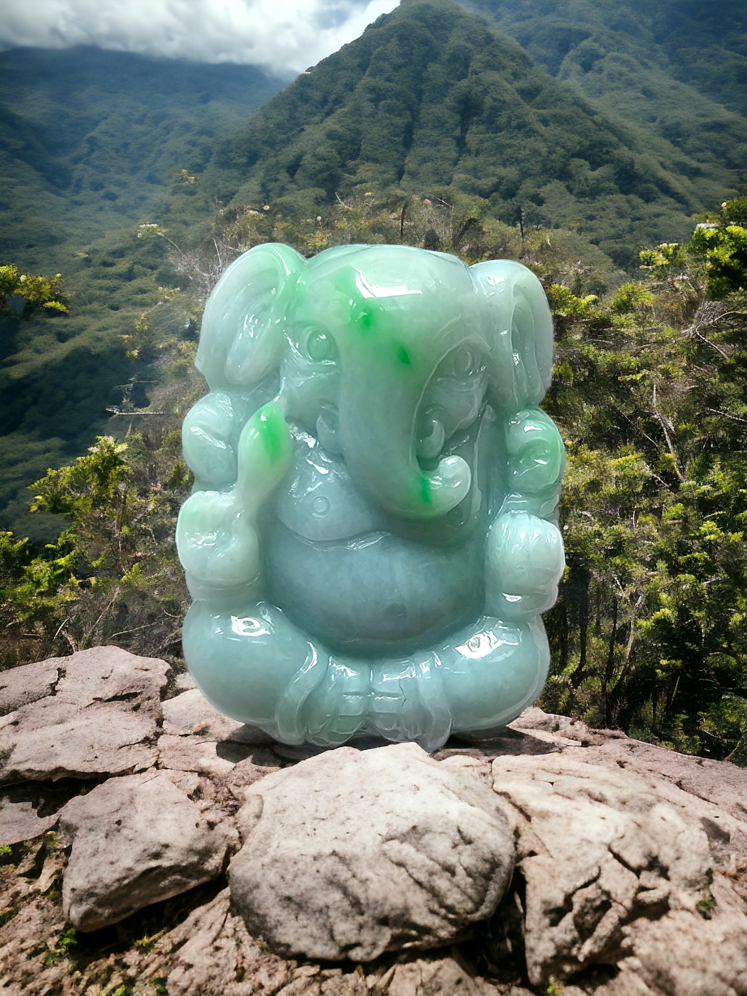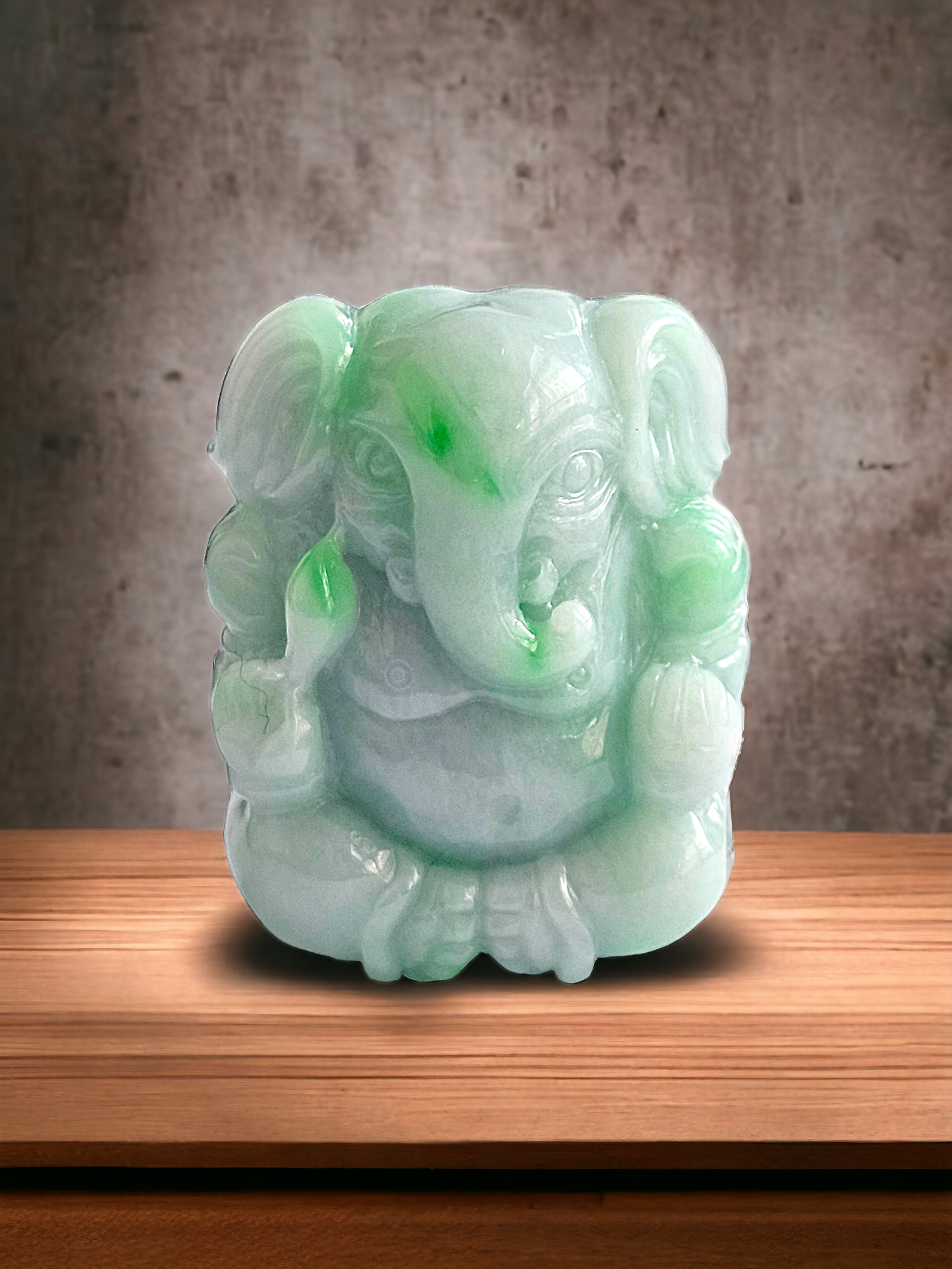 我們的「催化劑甘尼薩」是印度教新開端的神祇,由精選最稀有的緬甸 A 級翡翠打造而成,具有最佳的半透明度、色調、色調和綠色飽和度。我們使用自然且最令人嚮往的帝王綠色條紋來強調象頭神甘納帕蒂勳爵的某些元素。象徵新的開始、財富、智慧和繁榮。