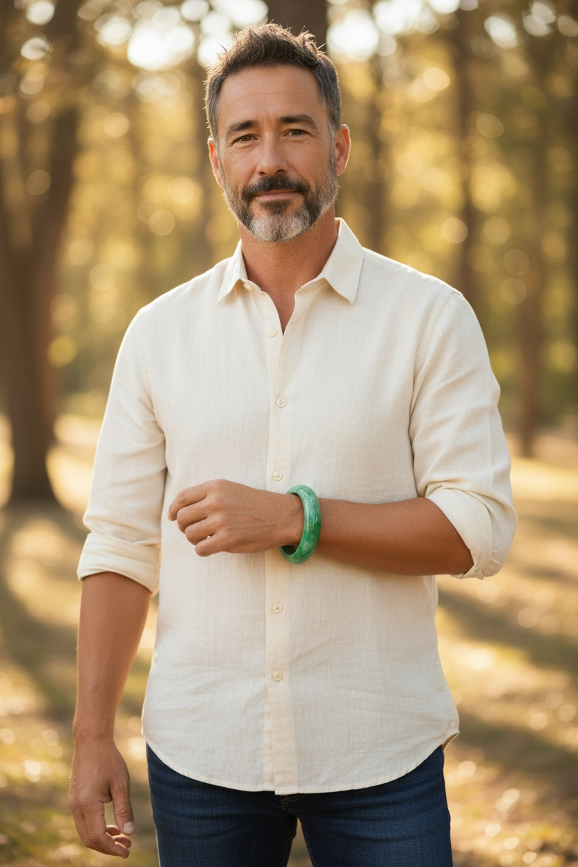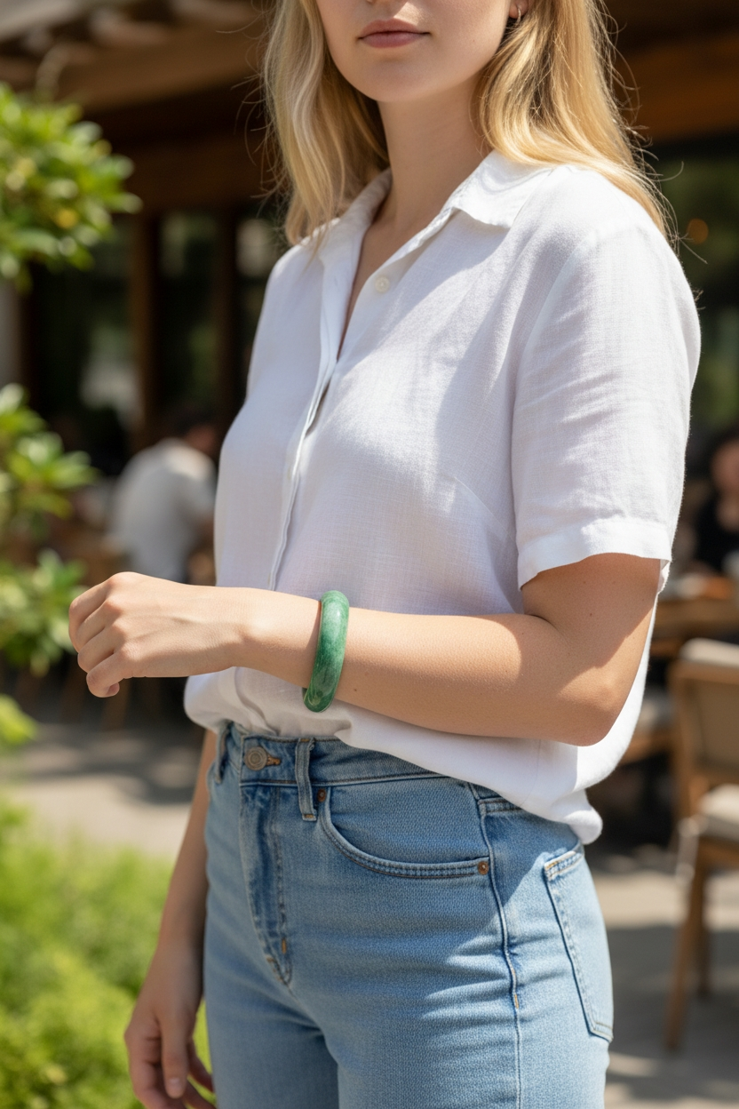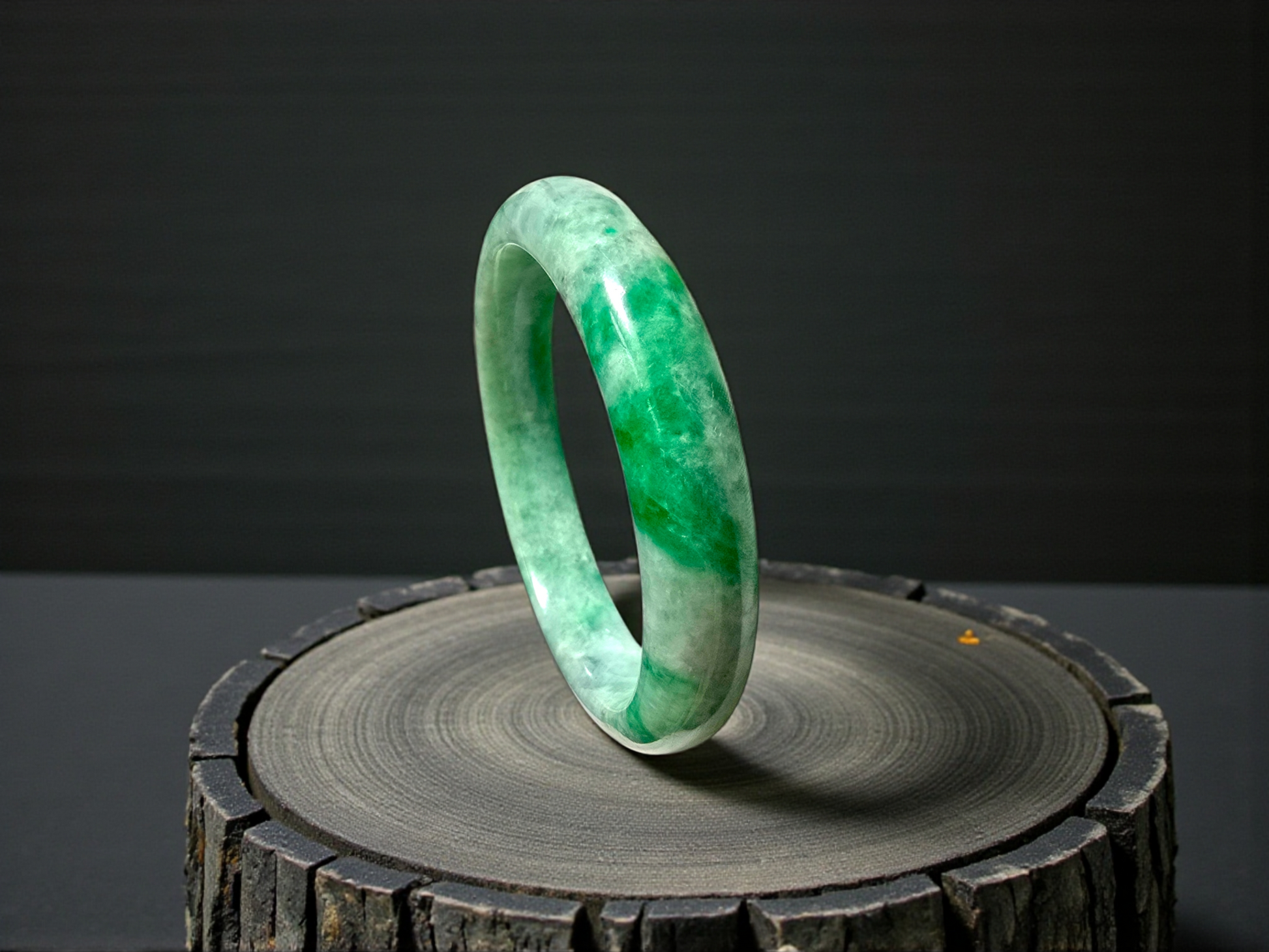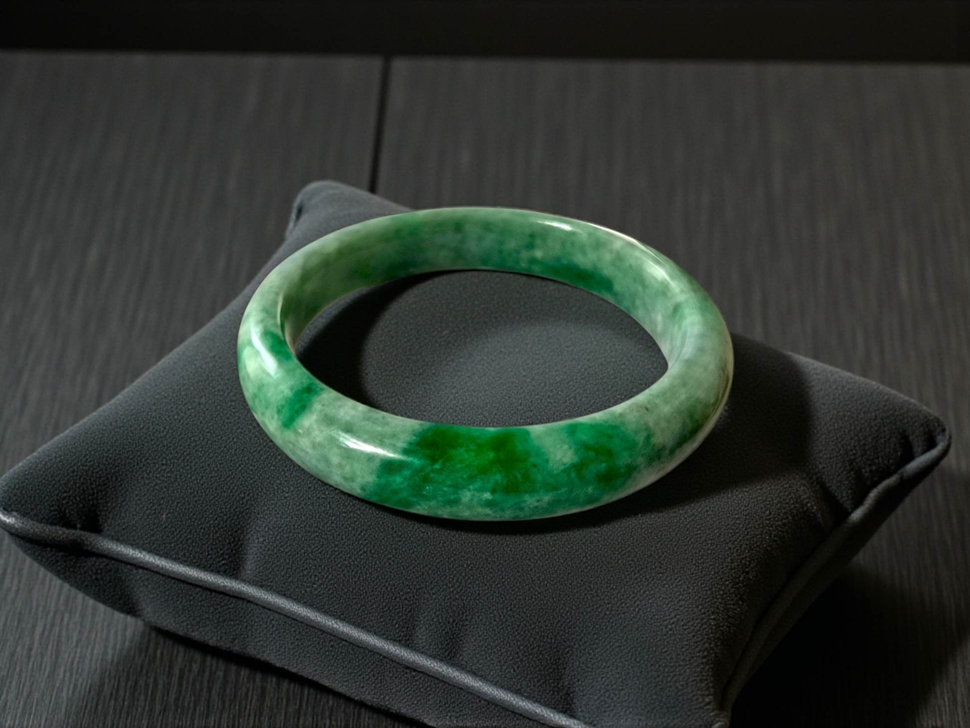 Using the best Handpicked untreated natural A-Jadeite from Burma, we created an authoritative and classy statement bangle bracelet. This unique block of Jadeite has a Green base hue, with marbling, patches and splashes of Imperial Intense Green, Vivid-Vibrant Green, Deep Green, and White. Interlaced with fibrous and patchy interwoven green patterns, the optical effect is stunning. The Fibrous texture and icy translucency in parts, are blended with depth of color and splashes of pattern.