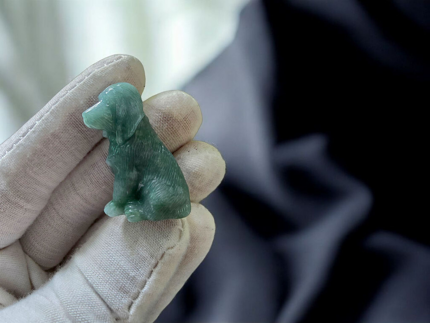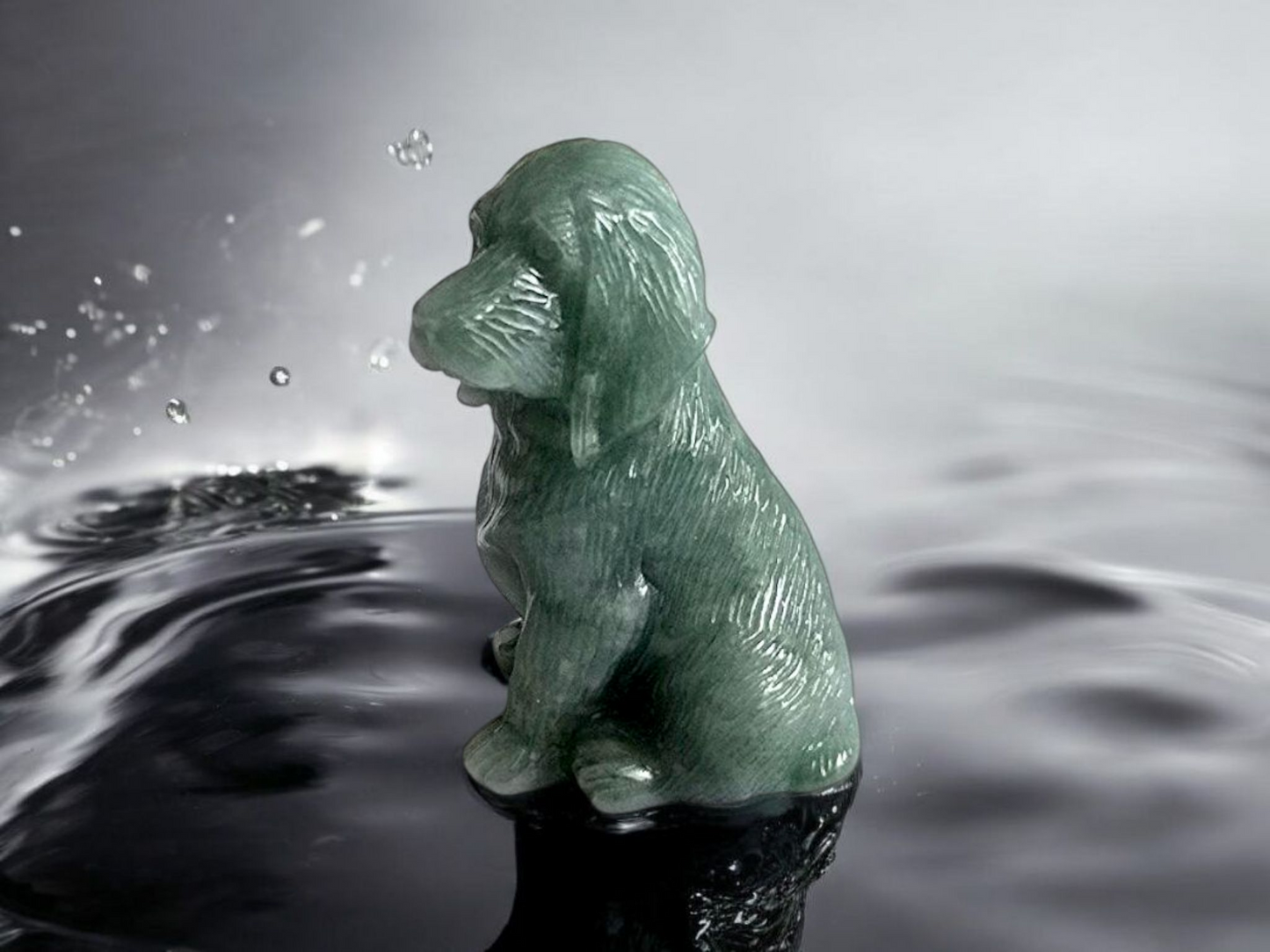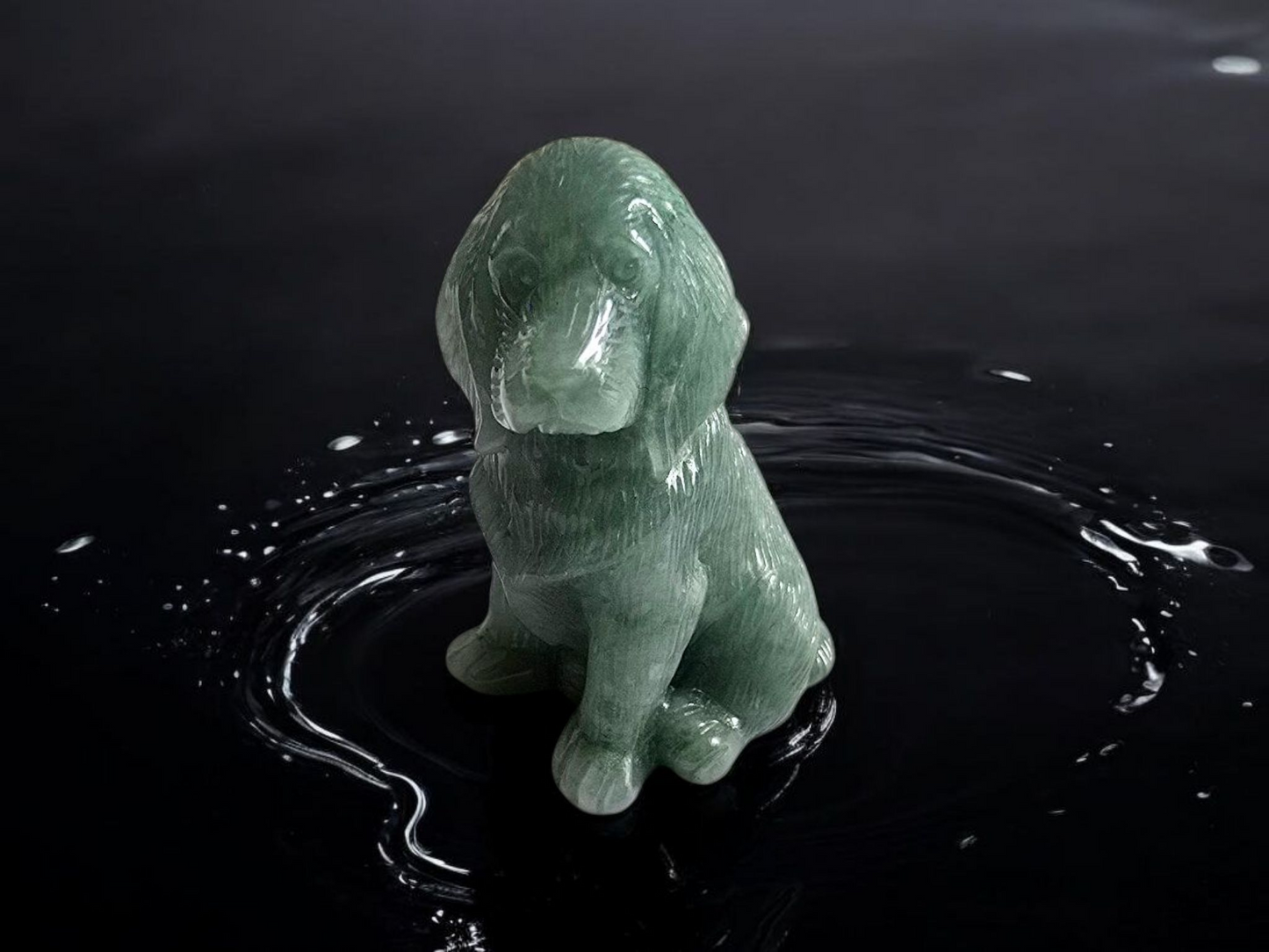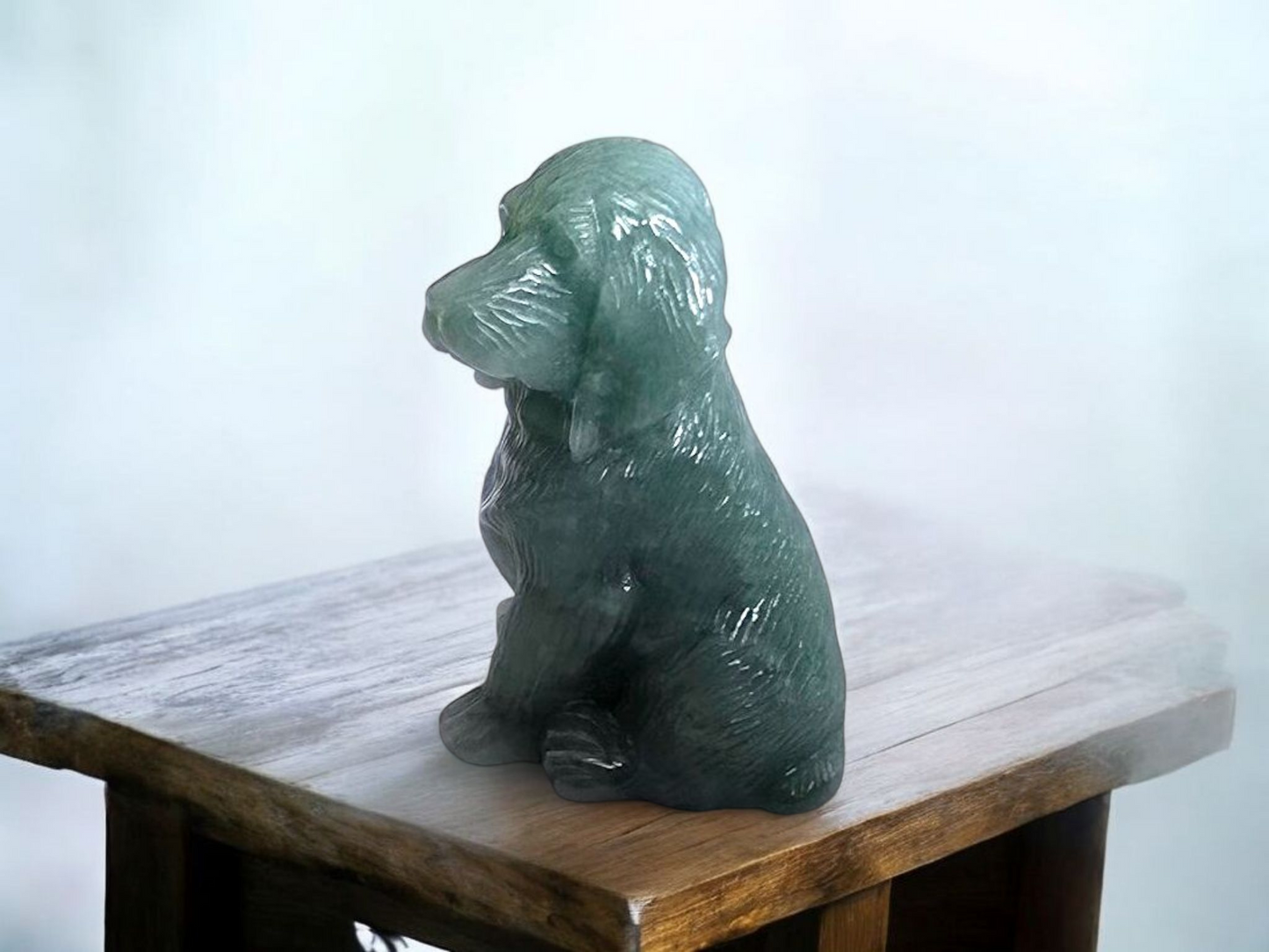 Inspired by a sitting Cocker Spaniel, this carved masterpiece is created from handpicking a rare single block of Green Burmese A-Jadeite Jade, with the excellent translucency, hues, tones and saturation of Whitish-Green. This piece has a deep white and green tone, with a watery and fibrous luster.
