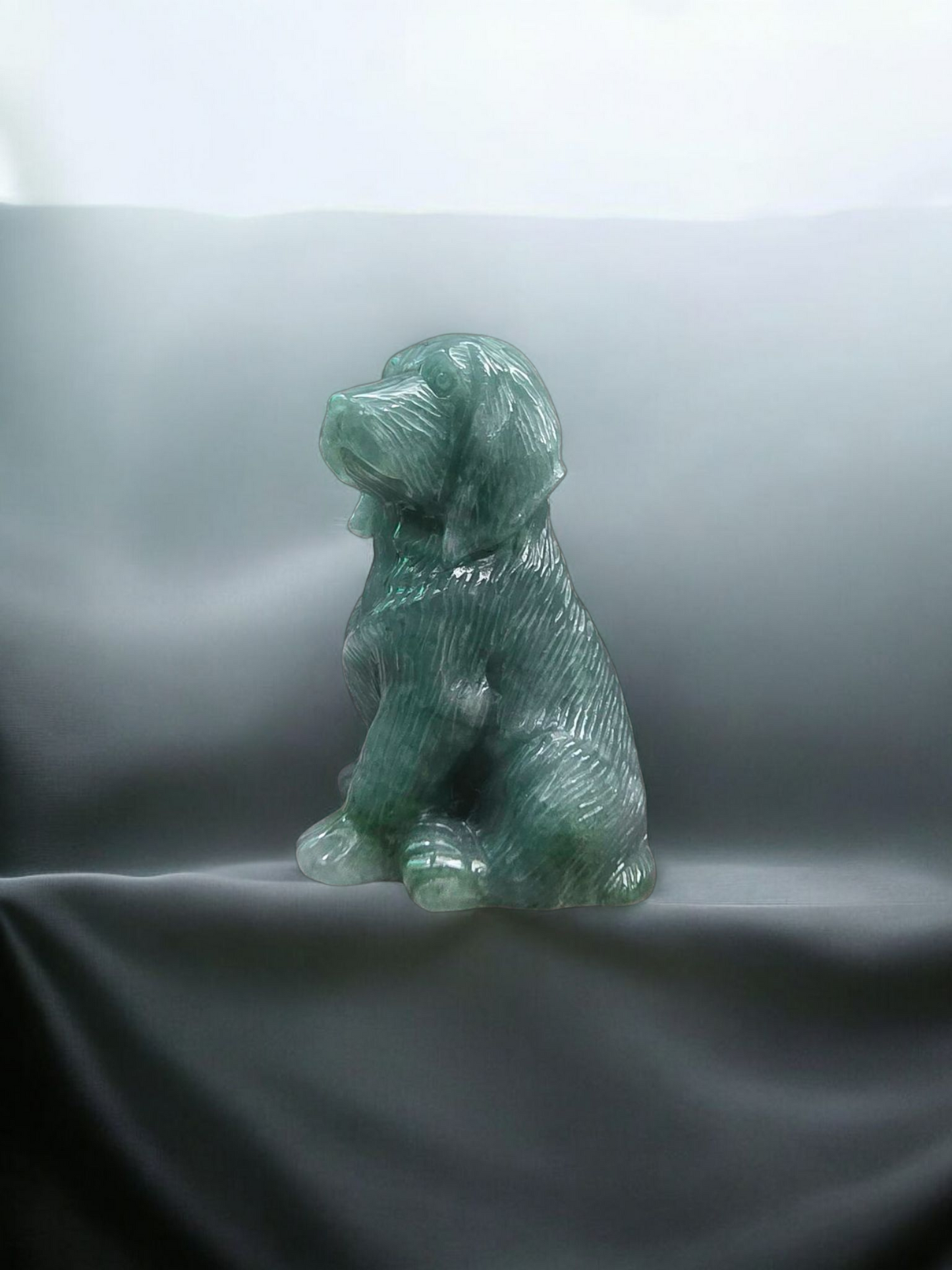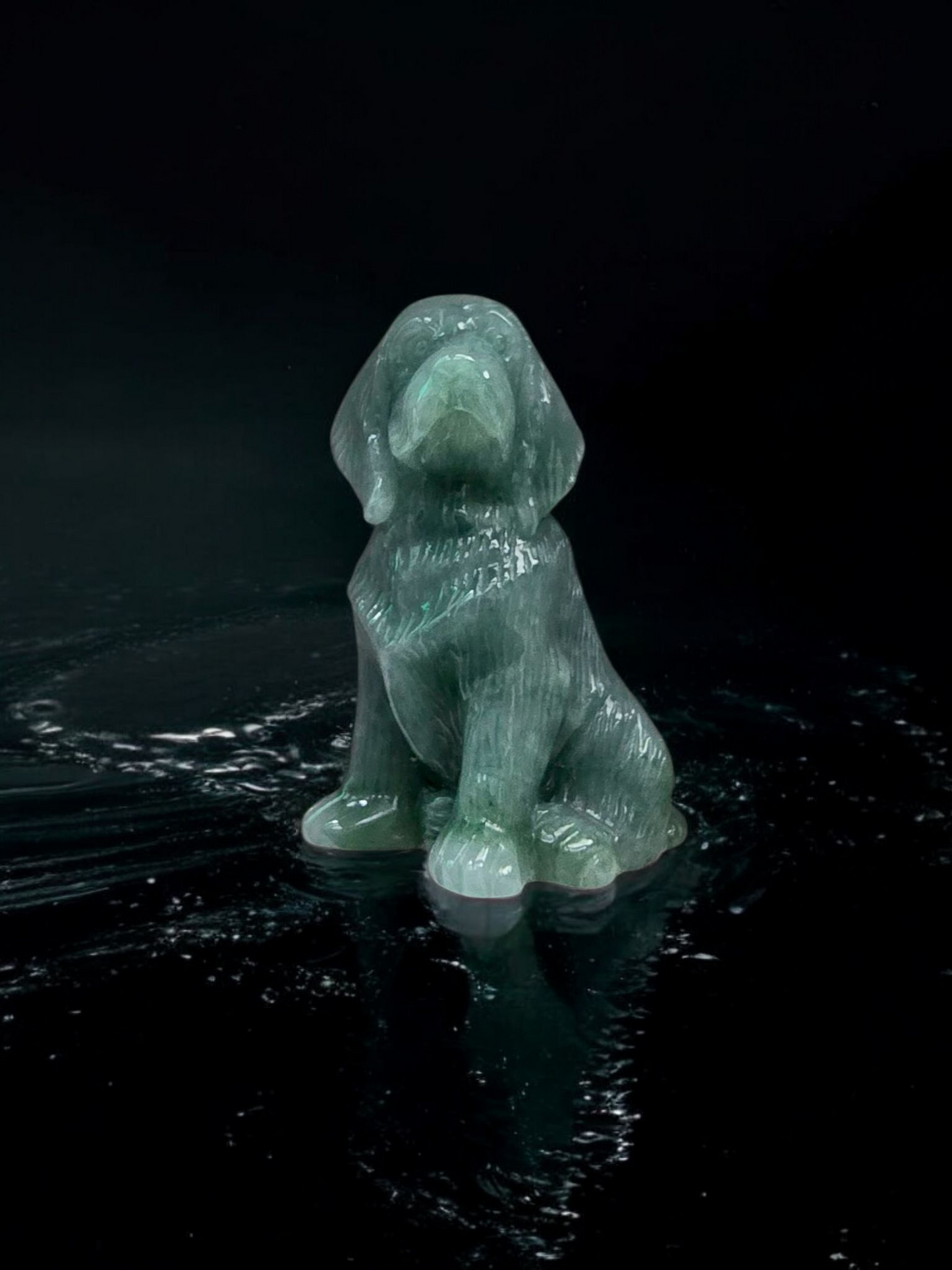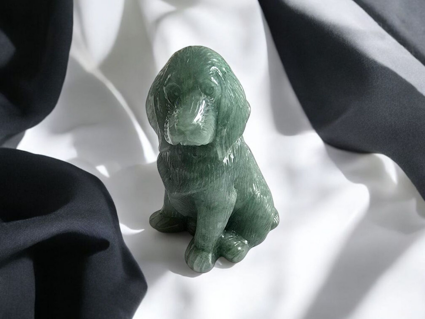 Inspired by a sitting Cocker Spaniel, this carved masterpiece is created from handpicking a rare single block of Green Burmese A-Jadeite Jade, with the excellent translucency, hues, tones and saturation of Whitish-Green. This piece has a deep white and green tone, with a watery and fibrous luster.