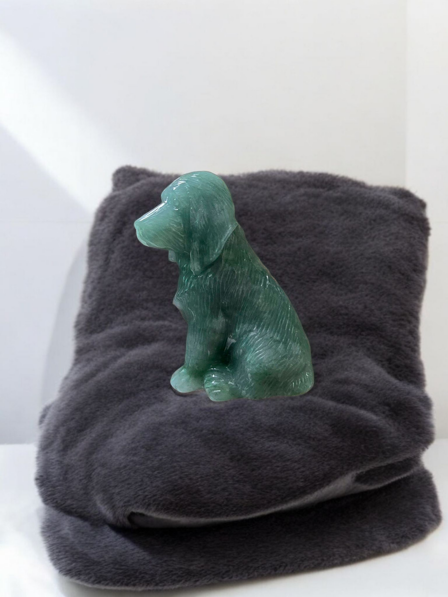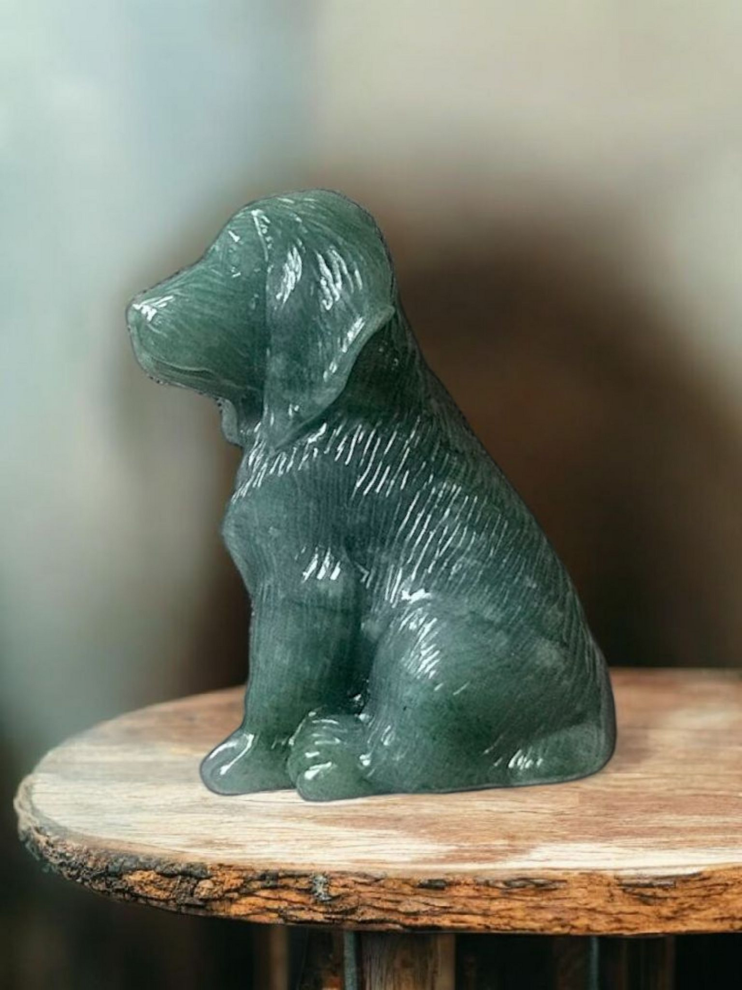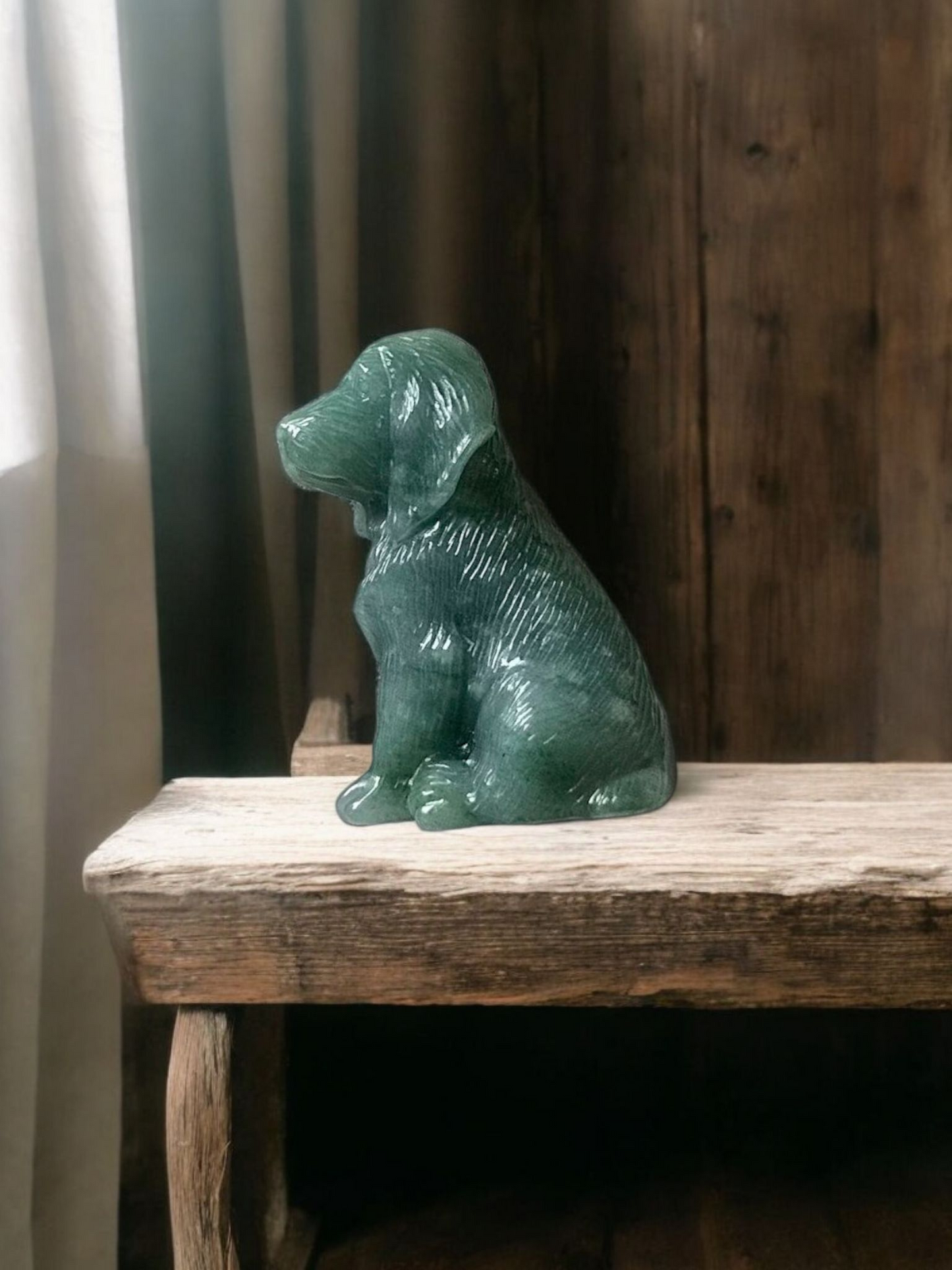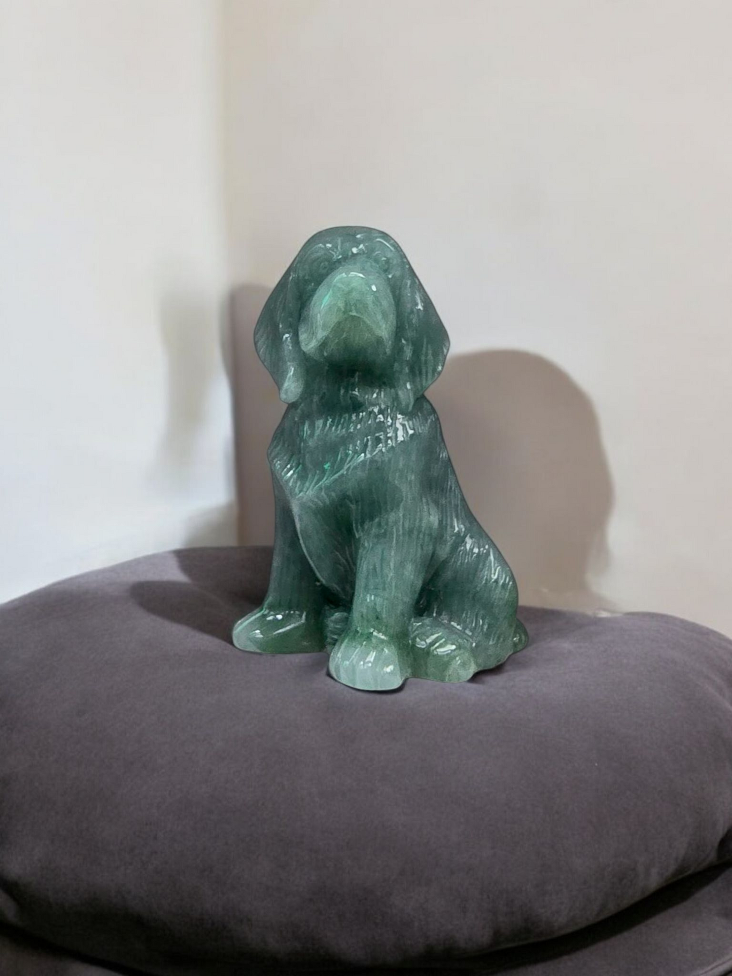 Inspired by a sitting Cocker Spaniel, this carved masterpiece is created from handpicking a rare single block of Green Burmese A-Jadeite Jade, with the excellent translucency, hues, tones and saturation of Whitish-Green. This piece has a deep white and green tone, with a watery and fibrous luster.