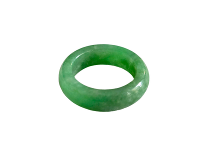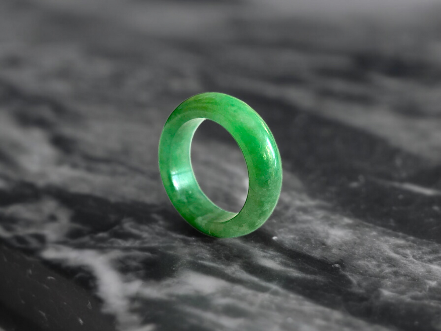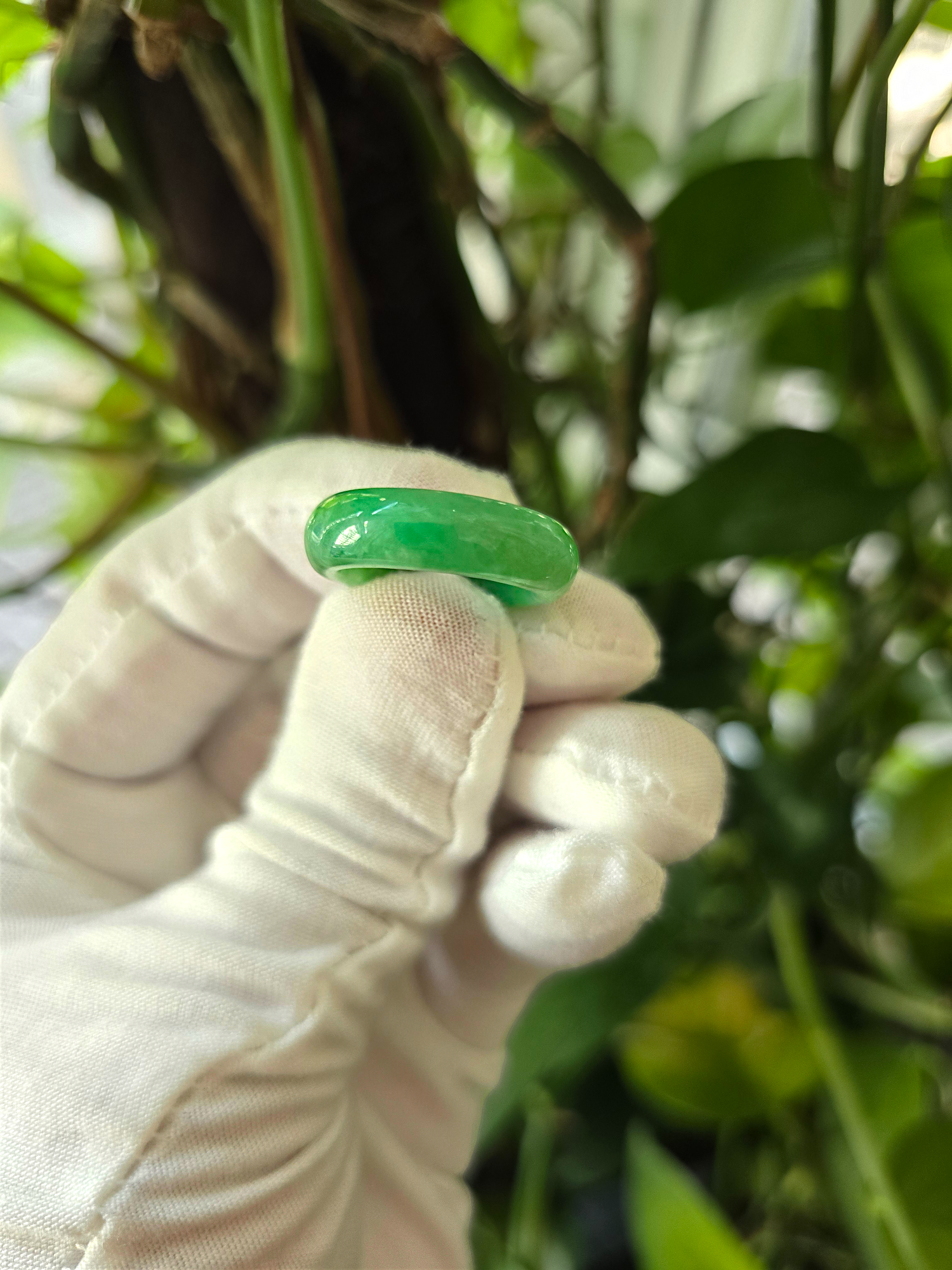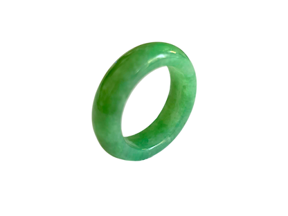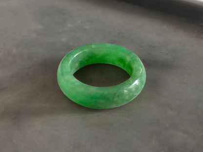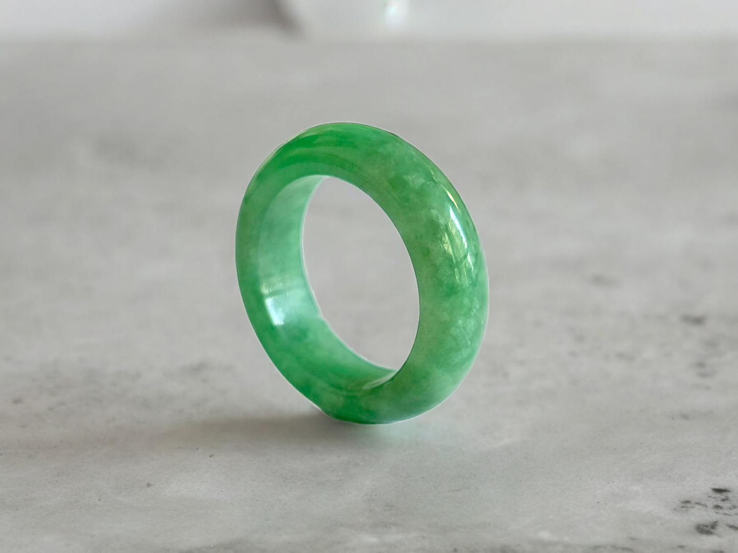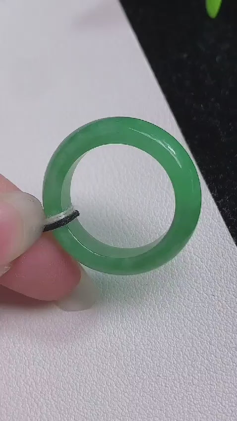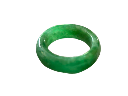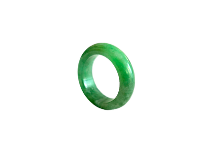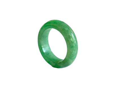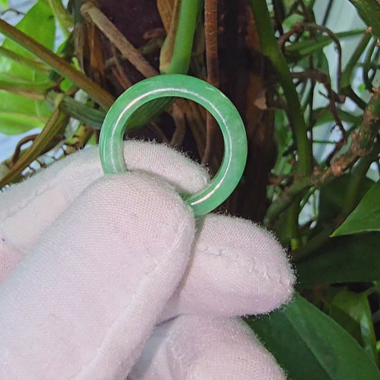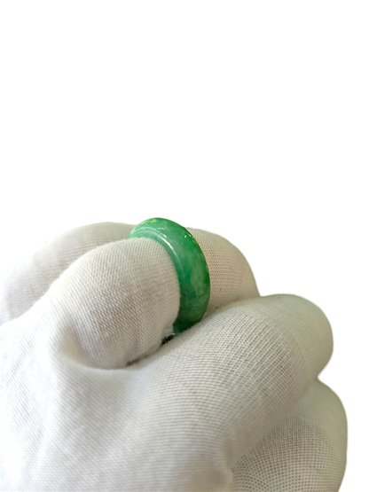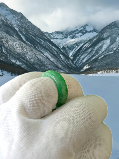 Our finest and most translucent series of Burmese A-Jadeite Infinity Band Rings. Our handpicked exclusive Jadeite is crafted into unique rings, each with the ideal optics and strength. Each ring is unique and exclusively One-of One. With fibrous interwoven hues, this jadeite has a rich green tone with splashes and streaks of Imperial Jadeite. Perfect luster and light, and no cracks or blemishes on the ring.