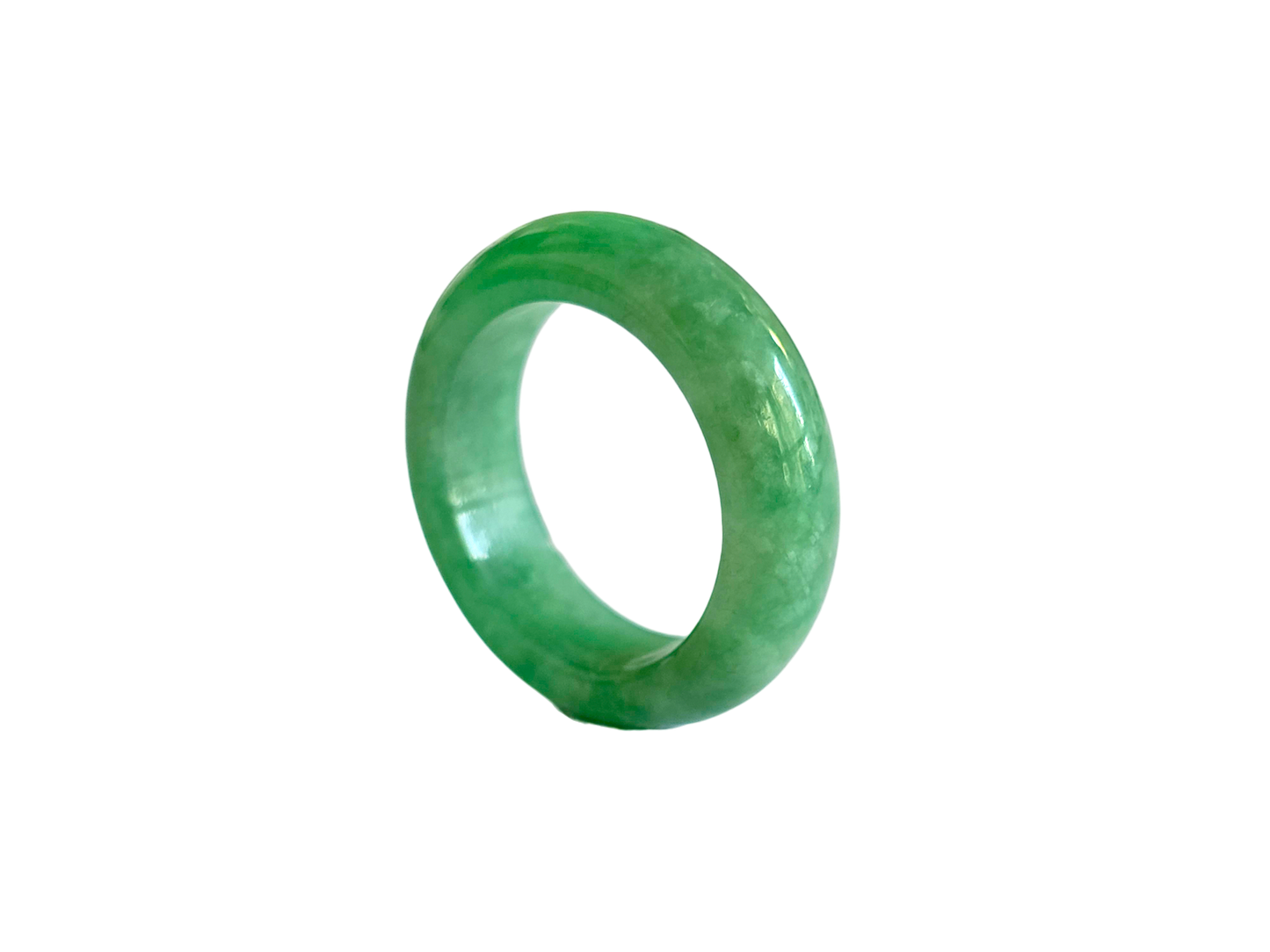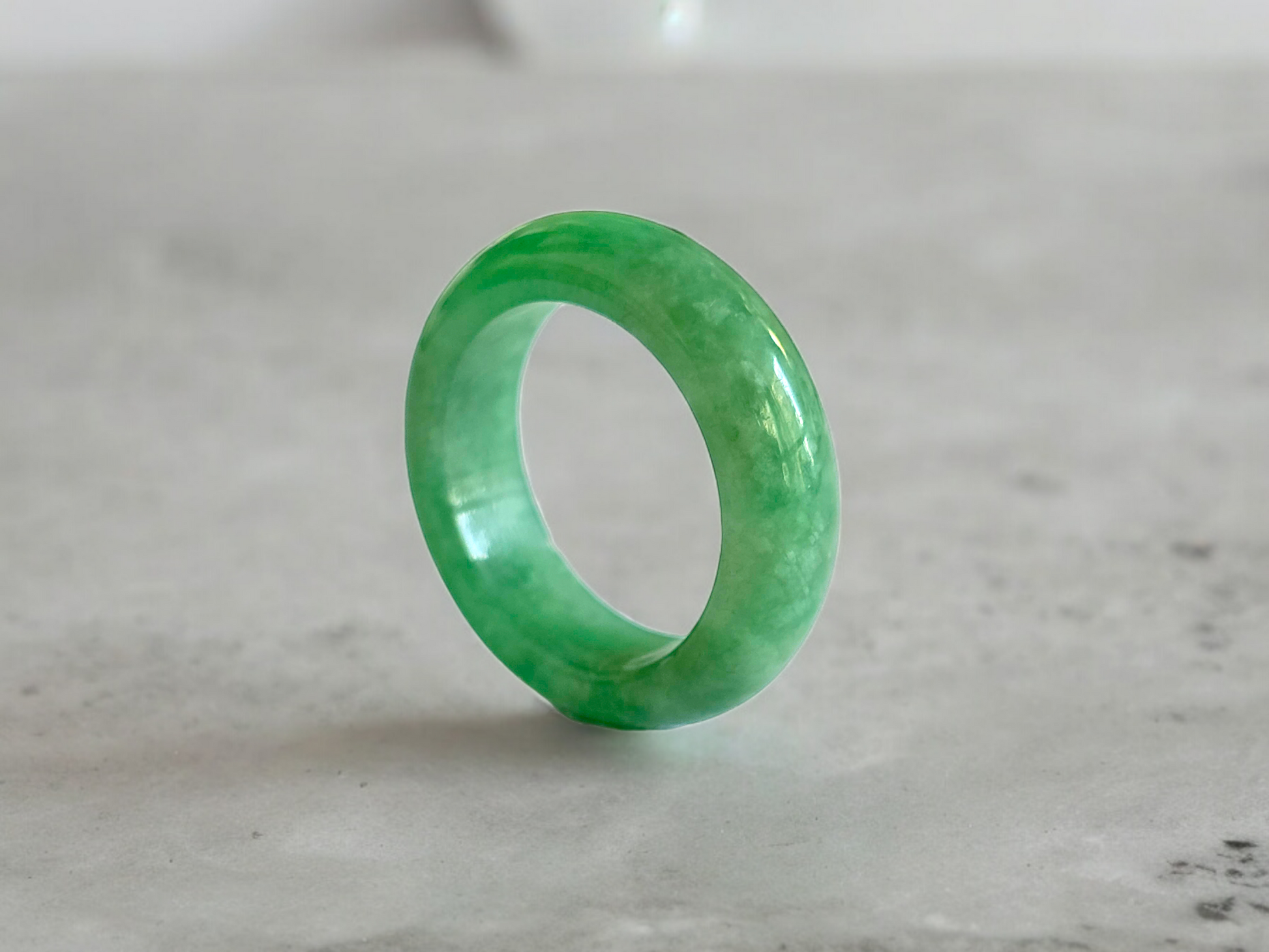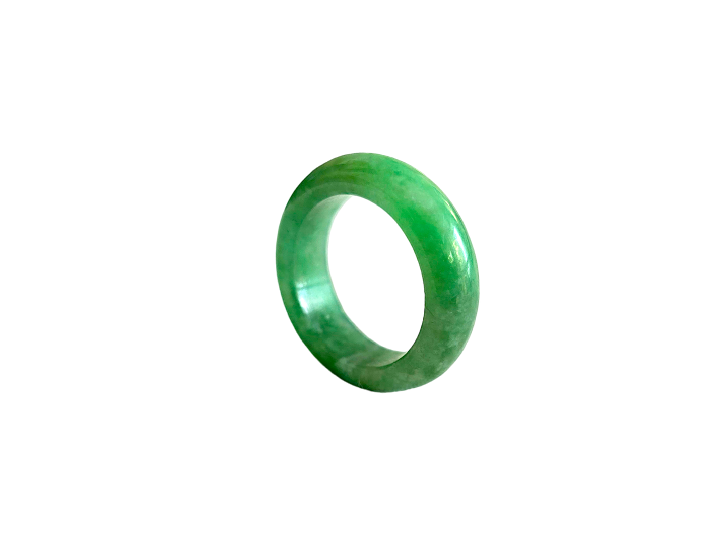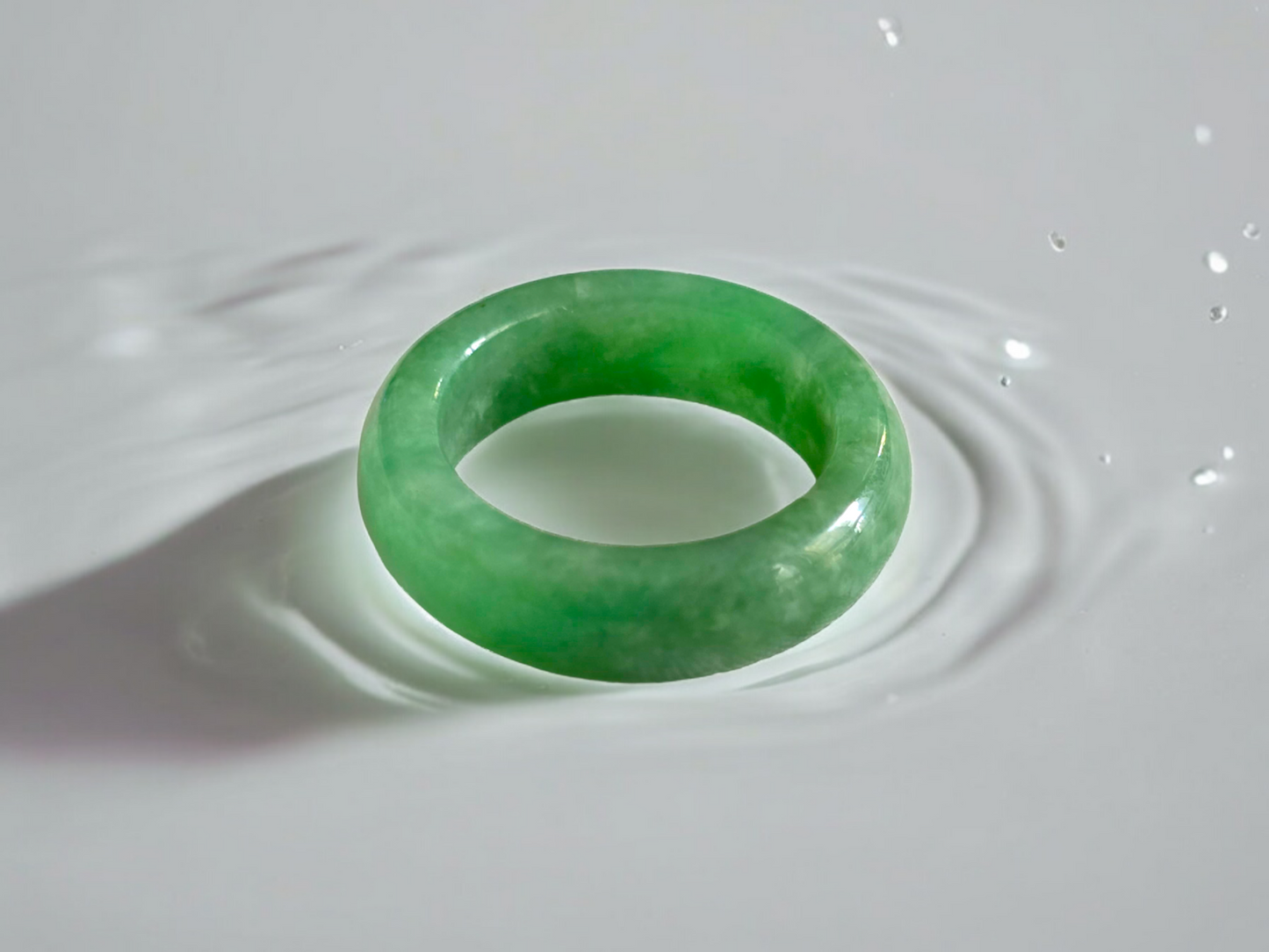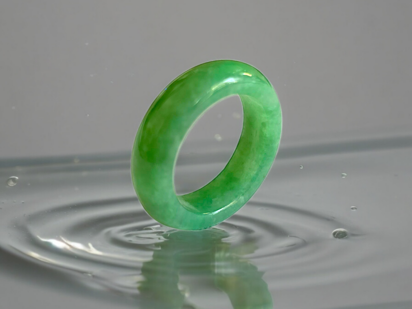 Our finest and most translucent series of Burmese A-Jadeite Infinity Band Rings. Our handpicked exclusive Jadeite is crafted into unique rings, each with the ideal optics and strength. Each ring is unique and exclusively One-of One. With fibrous interwoven hues, this jadeite has a rich green tone with splashes and streaks of Imperial Jadeite. Perfect luster and light, and no cracks or blemishes on the ring.